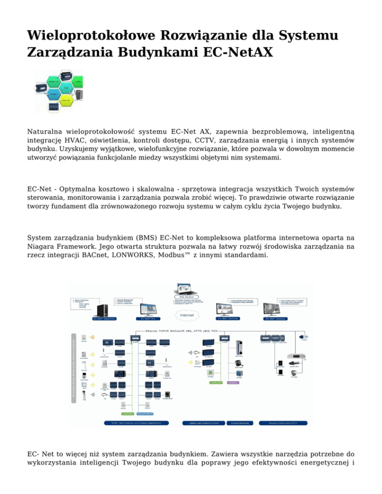 Wieloprotokołowe Rozwiązanie dla Systemu Zarządzania Budynkami EC-NetAX Naturalna wieloprotokołowość systemu EC-Net AX, zapewnia bezproblemową, inteligentną integrację HVAC, oświetlenia, kontroli dostępu, CCTV, zarządzania energią i innych systemów budynku. Uzyskujemy wyjątkowe, wielofunkcyjne rozwiązanie, które pozwala w dowolnym momencie utworzyć powiązania funkcjolanle miedzy wszystkimi objetymi nim systemami. EC-Net - Optymalna kosztowo i skalowalna - sprzętowa integracja wszystkich Twoich systemów sterowania, monitorowania i zarządzania pozwala zrobić więcej. To prawdziwie otwarte rozwiązanie tworzy fundament dla zrównoważonego rozwoju systemu w całym cyklu życia Twojego budynku. System zarządzania budynkiem (BMS) EC-Net to kompleksowa platforma internetowa oparta na Niagara Framework. Jego otwarta struktura pozwala na łatwy rozwój środowiska zarządzania na rzecz integracji BACnet, LONWORKS, Modbus™ z innymi standardami. EC- Net to więcej niż system zarządzania budynkiem. Zawiera wszystkie narzędzia potrzebne do wykorzystania inteligencji Twojego budynku dla poprawy jego efektywności energetycznej i uzbrojenia go w zdolność do szybkiego reagowania na sytuacje, mogące mieć negatywny wpływ na zużycie energii, stan techniczny, a ostatecznie jego rentowność. Najważniejsze cechy ● ● ● ● ● ● ● ● BACnet, (LONworks, standardach powszechnych wsyatkich we urządzeń integracja awotęzrpS Modbus, Mbus, KNX i wiele innych) Wymiana danych miedzy urządzeniami różnych standardów bez udziału komputera. Programowanie, zarządzanie i monitorowanie systemu (i urządzeń!) z dowolnego miejsca za pomocą przeglądarki internetowej, pełny zdalny serwis. Zarządzanie rozproszonymi geograficznie instalacjami jak jednolitym systemem Współpraca z wieloma producentami - wybieraj najlepsze w swojej klasie produkty od różnych dostawców, przedłuż okres użytkowania istniejących systemów, rozszerzaj możliwości, niezależnie od ich producenta lub protokołu komunikacji Wykorzystaj inteligencję systemu łącząc go czasie rzeczywistym z aplikacjami korporacyjnymi takimi jak księgowość, rozliczenia najemców, zarządzania energią czy interfejsy monitorowania zużycia mediów Stosuj otwarte standardy jako najbardziej właściwą metodę łączenia infrastruktury technicznej z sieciami IT. Monitorowanie, potwierdzanie i przeglądanie alarmów, ich zaawansowana obróbka i przekierowanie na e-mail lub urządzenia przywoławcze Wspólna platforma oferuje funkcje globalne takie jak kontrola sieci, monitorowanie, alarmowanie, bazy danych, zarządzanie zarejestrowanymi danymi i ich analizę EC-NetAX EnerVue EC-NetAX EnerVue jest konfigurowalną, graficzną opartą o WEB aplikacją do zarządzania energią, która dostarcza natychmiastowej informacji na temat kluczowych obszarów działania instalacji z uwzględnieniem zużycia energii, funkcjonowania systemów mechanicznych i elektrycznych ich sprawnosci i parametrów krytycznych. Świadomi energetycznie operatorzy, odnajdą w EC-Net EnerVue idealne nadrzędzie dla zarządzania równowagą energetyczną obiektu. EC-BOS Sterowniki Web dla Budynków EC-BOS jest kompaktowym, zintegrowanym sterownikiem budynkowym, który łączy sterowanie, nadzór, rejestrację, alarmowanie, harmonogramy, oraz funkcje zarządzania sieci z łącznością internetową i serwera WEB. EC-BOS został zaprojektowany, aby integrować różne systemy i urządzenia w jednolity system obsługujący szeroki zakres protokołów takich jak, BACnet, LONWORKS, Modbus, i innych standardów. Rozwiązania dla mniejszych instalacji Dostępne są również urządzenia dla małych instalacji. Jednym z nich jest zintegrowany serwer internetowy I.lon, który można wykorzystać do budowy prostej wizualizacji urządzeń wykorzystujących wbudowane weń protokoły: Lonworks, Modbus lub Mbus. Urządzenie we własnej pamięci może również przechowywać zapisy zarejestrowanych parametrów oraz alarmów. Dostęp do systemu chroniony jest hasłem i jest możliwy z wielu stanowisk zarówno z sieci lokalnej jak i z dowolnego miejsca poprzez internet. Warto również wspomnieć o grupie urządzeń M2M, kóre są kompaktowymi wersjami EC-BOS. M2M został zaprojektowany specjalnie do zdalnego monitorowania i kontroli stosowania w mniejszych instalacjach, szczególnie dla modernizowanych istniejących budynków. Łączy w sobie zintegrowane sterowanie, alarmowanie, rejestrowanie danych, planowanie, nadzór oraz funkcje zarządzania siecią, w kompaktowej obudowie do montażu ściennego. Oprócz portów Ethernet przewodowej posiada 16 punktów I/O do wykorzystania, zasilanie 230 Vi (opcjonalnie) modem GPRS. KONTAKT Distech Controls
