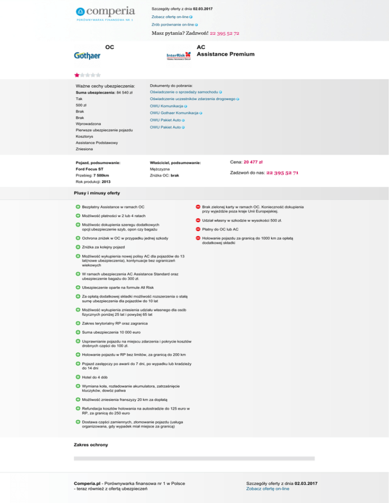 Szczegóły oferty z dnia 02.03.2017 Zobacz ofertę on-line Zrób porównanie on-line Masz pytania? Zadzwoń! 22 395 52 72 OC AC Assistance Premium Ważne cechy ubezpieczenia: Dokumenty do pobrania: Suma ubezpieczenia: 84 540 zł Oświadczenie o sprzedaży samochodu Tak Oświadczenie uczestników zdarzenia drogowego 500 zł OWU Komunikacja Brak OWU Gothaer Komunikacja Brak Wprowadzona Pierwsze ubezpieczenie pojazdu OWU Pakiet Auto OWU Pakiet Auto Kosztorys Assistance Podstawowy Zniesiona Pojazd, podsumowanie: Właściciel, podsumowanie: Ford Focus ST Mężczyzna Przebieg: 7 500km Zniżka OC: brak Cena: 20 477 zł Zadzwoń do nas: 22 395 52 71 Rok produkcji: 2013 Plusy i minusy oferty Bezpłatny Assistance w ramach OC Brak zielonej karty w ramach OC. Konieczność dokupienia przy wyjeździe poza kraje Unii Europejskiej. Możliwość płatności w 2 lub 4 ratach Udział własny w szkodzie w wysokości 500 zł. Możliwośc dokupienia szeregu dodatkowych opcji:ubezpieczenie szyb, opon czy bagażu Ochrona zniżek w OC w przypadku jednej szkody Płatny do OC lub AC Holowanie pojazdu za granicą do 1000 km za opłatą dodatkowej składki Zniżka za kolejny pojazd Możliwość wykupienia nowej polisy AC dla pojazdów do 13 lat(nowe ubezpieczenia), kontynuacje bez ograniczeń wiekowych W ramach ubezpieczenia AC Assistance Standard oraz ubezpieczenie bagażu do 300 zł. Ubezpieczenie oparte na formule All Risk Za opłatą dodatkowej składki możliwość rozszerzenia o stałą sumę ubezpieczenia dla pojazdów do 10 lat Możliwość wykupienia zniesienia udziału własnego dla osób fizycznych poniżej 25 lat i powyżej 65 lat Zakres terytorialny RP oraz zagranica Suma ubezpieczenia 10 000 euro Usprawnianie pojazdu na miejscu zdarzenia i pokrycie kosztów drobnych części do 100 zł. Holowanie pojazdu w RP bez limitów, za granicą do 200 km Pojazd zastępczy po awarii do 7 dni, po wypadku lub kradzieży do 14 dni Hotel do 4 dób Wymiana koła, rozładowanie akumulatora, zatrzaśnięcie kluczyków, dowóz paliwa Możliwość zniesienia franszyzy 20 km za dopłatą Refundacja kosztów holowania na autostradzie do 125 euro w RP, za granicą do 250 euro Dostawa części zamiennych, złomowanie pojazdu (usługa organizowana, gdy wypadek miał miejsce za granicą) Zakres ochrony Comperia.pl - Porównywarka finansowa nr 1 w Polsce - teraz również z ofertą ubezpieczeń Szczegóły oferty z dnia 02.03.2017 Zobacz ofertę on-line Szczegóły oferty z dnia 02.03.2017 Zobacz ofertę on-line Zrób porównanie on-line Masz pytania? Zadzwoń! 22 395 52 72 Zakres ochrony ubezpieczenia OC Suma ubezpieczenia 5 000 000 zł na osobie, 1 000 000 zł na mieniu Rozłożenie składki na raty 2 raty Zielona karta Możliwość dokupienia Dodatkowe świadczenia w ramach OC Bezpłatny assistance z zakresem podstawowym Zakres ochrony ubezpieczenia AC Zderzenie z innym pojazdem Zderzenie z osobami, zwierzętami, lub przedmiotami znajdującymi się poza pojazdem Uszkodzenie przez osoby trzecie (wandalizm) Zamieszki, wewnętrzne niepokoje, wydarzenia wojenne Powstałych wskutek użycia pojazdu w związku z obowiązującymi świadczeniami na rzecz wojska i policji Wybuch Nagłe działanie czynnika termicznego lub chemicznego pochodzącego z zewnątrz pojazdu Powódź Lawina Osunięcie i zapadanie się ziemi Grad Uderzenie pioruna Huragan Trzęsienie ziemi Kradzież pojazdu z wyłączeniami Rabunek/Rozbój z wyłączeniami Upadek statku powietrznego Pożar Zakres ochrony Assistance Suma ubezpieczenia Brak Zakres terytorialny Polska i Europa Wiek pojazdu do którego można wykupić ubezpieczenie Do 10 lat Rodzaj pojazdu na który można wykupić ubezpieczenie samochody osobowe, samochody ciężarowo-osobowe, terenowe, samochód ciężarowy o dopuszczalnej masie całkowitej do 3,5 tony Ograniczenia ze względu na sposób użytkowania pojazdu (np. taxi, nauka jazdy, rent a car) Opcje zawarcia z AC lub/i z OC Usprawnienie pojazdu na miejscu zdarzenia Pomoc w razie awarii Pomoc w razie wypadku Limit odległości od miejsca zamieszkania Miejsce holowania Samochód zastępczy Comperia.pl - Porównywarka finansowa nr 1 w Polsce - teraz również z ofertą ubezpieczeń Do miejsca wskazanego przez ubezpieczonego na odległość nie większą niż 200 km (w przypadku większej odległości powyżej limitu koszty holowania pokrywa ubezpieczający) Z powodu awarii 7 dni z powodu wypadku Szczegóły oferty z dnia 02.03.2017 Zobacz ofertę on-line Szczegóły oferty z dnia 02.03.2017 Zobacz ofertę on-line Zrób porównanie on-line Masz pytania? Zadzwoń! 22 395 52 72 i kradzieży 14 dni (porównywalnej klasy o max pojemności do 2000cm3) Złomowanie pojazdu Tak do 125 EUR ( w przypadku zdarzeń za granicą) Parkowanie pojazdu do 3 dni i nie więcej niż do kwoty 50 EUR Transport zastępczy/przewóz osób tak(jeśli pojazd został skradziony lub nie może zostać naprawiony tego samego dnia jednak nie dłużej niż 3 dni ) Nocleg/zakwaterowanie tak(jeśli pojazd został skradziony lub nie może zostać naprawiony tego samego dnia jednak nie dłużej niż 3 dni ) Dodatkowe informacje organizacja i pokrycie kosztów dowozu paliwa, zmiennika kierownicy w celu powrotu pasażerów Terytorium ochrony Terytorium ochrony ubezpieczenia AC Kraje Unii Europejskiej Algeria Albania Libia Maroko Mołdawia z wyłączeniem kradzieży (możliwość rozszerzenia) Białoruś z wyłączeniem kradzieży (możliwość rozszerzenia) Rosja (część europejska) z wyłączeniem kradzieży (możliwość rozszerzenia) Czarnogóra Serbia Bośnia i Hercegowina Tunezja Iran Turcja Izrael Ukraina z wyłączeniem kradzieży (możliwość rozszerzenia) Wyłączenia Wyłączenia ubezpieczenia AC Udział własny w szkodzie W wariancie "wycena" wynosi 20 proc. W wariancie Warsztat zniesiony (możliwość wprowadzenia (500 zł). Amortyzacja za części Jest. Możliwość wykupienia amortyzacji. Rodzaj stacji naprawczej (ze względu na metodę naprawy) Faktura - serwis / Koszto