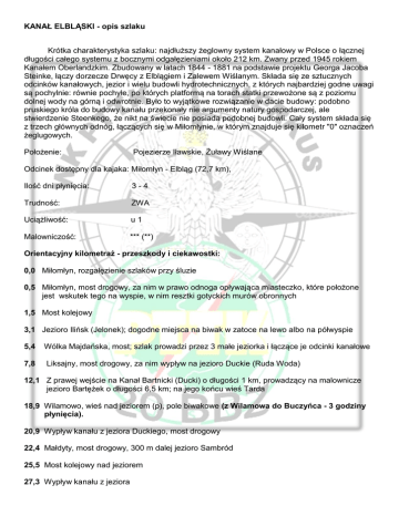 KANAŁ ELBLĄSKI - opis szlaku Krótka charakterystyka szlaku: najdłuższy żeglowny system kanałowy w Polsce o łącznej długości całego systemu z bocznymi odgałęzieniami około 212 km. Zwany przed 1945 rokiem Kanałem Oberlandzkim. Zbudowany w latach 1844 - 1881 na podstawie projektu Georga Jacoba Steinke, łączy dorzecze Drwęcy z Elblągiem i Zalewem Wiślanym. Składa się ze sztucznych odcinków kanałowych, jezior i wielu budowli hydrotechnicznych, z których najbardziej godne uwagi są pochylnie: równie pochyłe, po których platformą na torach statki przewożone są z poziomu dolnej wody na górną i odwrotnie. Było to wyjątkowe rozwiązanie w dacie budowy: podobno pruskiego króla do budowy kanału przekonały nie argumenty natury gospodarczej, ale stwierdzenie Steenkego, że nikt na świecie nie posiada podobnej budowli. Cały system składa się z trzech głównych odnóg, łączących się w Miłomłynie, w którym znajduje się kilometr "0" oznaczeń żeglugowych. Położenie: Pojezierze Iławskie, Żuławy Wiślane Odcinek dostępny dla kajaka: Miłomłyn - Elbląg (72,7 km), Ilość dni płynięcia: 3-4 Trudność: ZWA Uciążliwość: u1 Malowniczość: *** (**) Orientacyjny kilometraż - przeszkody i ciekawostki: 0,0 Miłomłyn, rozgałęzienie szlaków przy śluzie 0,5 Miłomłyn, most drogowy, za nim w prawo odnoga opływająca miasteczko, które położone jest wskutek tego na wyspie, w nim resztki gotyckich murów obronnych 1,5 Most kolejowy 3,1 Jezioro Ilińsk (Jelonek); dogodne miejsca na biwak w zatoce na lewo albo na półwyspie 5,4 7,8 Wólka Majdańska, most; szlak prowadzi przez 3 małe jeziorka i łączące je odcinki kanałowe Liksajny, most drogowy, za nim wypływ na jezioro Duckie (Ruda Woda) 12,1 Z prawej wejście na Kanał Bartnicki (Ducki) o długości 1 km, prowadzący na malownicze jezioro Bartężek o długości 6,5 km; na jego końcu wieś Tarda 18,9 Wilamowo, wieś nad jeziorem (p), pole biwakowe (z Wilamowa do Buczyńca - 3 godziny płynięcia). 20,9 Wypływ kanału z jeziora Duckiego, most drogowy 22,4 Małdyty, most drogowy, 300 m dalej jezioro Sambród 25,5 Most kolejowy nad jeziorem 27,3 Wypływ kanału z jeziora 28,7 Rybaki (p), Karczemka (l), most, zaraz za nim kolejny, po czym kanał prowadzi przez osuszone podczas jego budowy jezioro Piniewo 32,7 W lewo wejście na jezioro Budwity (do wsi Budwity 1,5 km) 35,5 Most, z p. w odległości ok. 1 km wieś Drulity 36,7 Pochylnia Buczyniec o długości 490 m, różnica poziomów 20,6 m, najbardziej malownicza ze wszystkich, udostępniona do zwiedzania, możliwość biwakowania. Możliwość przybicia przy schodkach z prawej strony zaraz przy budynku muzeum pochylni. (od Buczyńca do Jeleni dwie godziny płynięcia - bez korzystania z pochylni ! Z wykorzystaniem pochylni na odcinek ten trzeba liczyć ok 3 godzin). 37,7 Kąty, most, za nim dwa kolejne 38,7 Pochylnia Kąty o długości 404 m, różnica poziomów 18,9 m 39,7 Śliwice, most, za nim kolejny 41,6 Pochylnia Oleśnica o długości 479 m, różnica poziomów 24,2 m 43,4 Jelenie, most 43,8 Pochylnia Jelenie o długości 433m, różnica poziomów 22 m; pole biwakowe 44,7 Jelonki, 2 mosty; we wsi gotycki kościół i plebania z XVIII w. 45,8 Pochylnia Całuny o długości 352 m, różnica poziomów 13,8 m, za nią most (od ostatniej pochylni do pierwszego mostu 5 minut, do drugiego 25 minut, do jeziora kolejne 40 minut - razem do jeziora Druzno 1 godzina 10 minut) 52,0 Jezioro Drużno, zarastające, ornitologiczny rezerwat przyrody, dawna zatoka morska, płynąć wyznaczonym szlakiem wodnym; nad jeziorem znajdował się zapewne wczesnośredniowieczny port Truso, którego pozostałości odkryto w Janowie Pomorskim (na przepłynięcie jeziora trzeba liczyć dwie godziny) 57,2 Wypływ rzeki Elbląg. Możliwość dogodnego dobicia, postoju i biwaku w pierwszej kępie drzew po lewej stronie. (mało miejsca - może dwa namioty się zmieszczą) (od krańca jeziora do granicy miasta Elbląg 2 godziny płynięcia) 61,1 Ujście rzeki Tiny, za nim mosty kolejowy i drogowy. Początek Elbląga. (od mostu do przystani Ognisko Sportów Wodnych FALA około 40 minut płynięcia) 62,6 Elbląg, most drogowy, przed nim z p. kemping; z lewej. Możliwość dobicia zaraz za kempingiem (ale przed mostem) po prawej stronie po to żeby zrobić zakupy w pobliskim (150 m) sklepie. Następny dogodny sklep dopiero w Nowakowie. Wyspa Spichrzów, z prawej Stare Miasto, w znacznym stopniu zrekonstruowane; warto zobaczyć gotyckie kościoły zwłaszcza pw. św. Mikołaja z bogatym wyposażeniem i Bramę Targową; przystań statków pasażerskich, nad rzeką dwie kładki dla pieszych; za starówką tereny stoczniowe 64,0 Mosty Wysoki za nim most ul. Studzienna za mostem po lewej stronie ok. 70 m wspomniana przystań Ognisko Sportów Wodnych BRYZA. Możliwość dogodnego dobicia, biwaku.