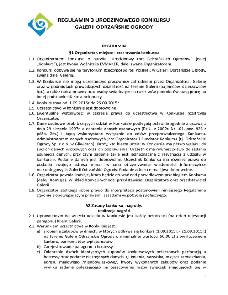 REGULAMIN 3 URODZINOWEGO KONKURSU GALERII ODRZAŃSKIE OGRODY REGULAMIN §1 Organizator, miejsce i czas trwania konkursu 1.1. Organizatorem konkursu o nazwie ”Urodzinowy tort Odrzańskich Ogrodów” (dalej „Konkurs”), jest Iwona Woźniczka EVMAKER, dalej zwana Organizatorem. 1.2. Konkurs odbywa się na terytorium Rzeczypospolitej Polskiej, w Galerii Odrzańskie Ogrody, zwaną dalej Galerią. 1.3. W Konkursie nie mogą uczestniczyć pracownicy zatrudnieni przez Organizatora, Galerię oraz w podmiotach prowadzących działalność na terenie Galerii (najemców, dzierżawców itp.), a także radca prawny oraz osoby świadczące na rzecz w/w podmiotów stałą pracę na innej podstawie niż stosunek pracy. 1.4. Konkurs trwa od 1.09.2015r do 25.09.2015r. 1.5. Uczestnictwo w konkursie jest dobrowolne. 1.6. Ewentualne wątpliwości w zakresie prawa do uczestnictwa w Konkursie rozstrzyga Organizator. 1.7. Dane osobowe osób biorących udział w Konkursie podlegają ochronie zgodnie z ustawą z dnia 29 sierpnia 1997r. o ochronie danych osobowych (Dz.U. z 2002r. Nr 101, poz. 926 z późn. Zm.) i będą wykorzystane wyłącznie do celów przeprowadzonego Konkursu. Administratorem danych osobowych jest Organizator i Fundator Konkursu (tj. Odrzańskie Ogrody Sp. z o.o. w Gliwicach). Każdy, kto bierze udział w Konkursie ma prawo wglądu do swoich danych osobowych oraz ich poprawiania. Uczestnik ma również prawo do żądania usunięcia danych, przy czym żądanie takie jest jednoznaczne z rezygnacją z udziału w konkursie. Podanie danych jest dobrowolne. Uczestnik Konkursu ma również prawo do podania swojego adresu e-mail w celu otrzymywania wiadomości informacyjnomarketingowych Galerii Odrzańskie Ogrody. Podanie adresu e-mail jest dobrowolne. 1.8. Organizator powoła komisję, która będzie czuwać nad prawidłowym przebiegiem Konkursu (dalej: Komisja). W skład Komisji wchodzi przedstawiciel Organizatora oraz przedstawiciel Galerii. 1.9. Organizator zastrzega sobie prawo do interpretacji postanowień niniejszego Regulaminu zgodnie z obowiązującym prawem i zasadami współżycia społecznego. §2 Zasady konkursu, nagrody, realizacja nagród 2.1. Uprawnionym do wzięcia udziału w Konkursie jest każdy pełnoletni (na dzień rejestracji paragonu) Klient Galerii. 2.2. Warunkiem uczestnictwa w Konkursie jest: a) zrobienie zakupów w dniach, w których odbywa się konkurs (1.09.2015r. - 25.09.2015r.) na terenie Galerii Odrzańskie Ogrody o minimalnej wartości 50,00 zł z wykluczeniem kantoru, bankomatów, wpłatomatów. b) Zarejestrowanie paragonu u hostessy. c) Odebranie dwóch identycznych kuponów konkursowych połączonych perforacją u hostessy oraz podanie niezbędnych danych, tj. imienia, nazwiska, miejsca zamieszkania, adresu mailowego /nieobowiązkowe/, kwoty wykonanych zakupów oraz podanie wyniku zadania polegającego na oszacowaniu liczby świeczek znajdujących się w 1 REGULAMIN 3 URODZINOWEGO KONKURSU GALERII ODRZAŃSKIE OGRODY styropianowym torcie. d) Hostessa na kuponie zapisuje datę i dokładną godzinę odebrania przez klienta kuponu. Jeżeli dwie bądź więcej osób odbiera kupon w tej samej godzinie i minucie, hostessa na kuponie dodatkowo zapisuje: godzinę, minuty i sekundy odebrania kuponu. e) Po wypełnieniu niezbędnych danych, jeden z otrzymanych kuponów Uczestnik wrzuca do urny, drugi jako dowód wzięcia udziału w Konkursie Uczestnik zachowuje. f) Kupon można odebrać u hostessy okazując paragon (dowód zakupu w sklepach galerii Odrzańskie Ogrody) nie niższy niż 50,00zł. Jeden paragon uprawnia do odebrania jednego kuponu. To znaczy, że zarówno paragon na kwotę 50,00 zł jak i paragon na wielokrotność tej kwoty np. 150 zł dalej uprawnia do odebrania wyłącznie jednego kuponu. W konkursie mogą brać udział paragony z datami od 1.09.2015r. do 25.09.2015r. g) Uczestnik biorąc udział w Konkursie wyraża zgodę na wykorzystanie i przetwarzanie swoich danych osobowych do celów związanych z realizacją Konkursu zgodnie z przepisami ustawy z dnia 29 sierpnia 1997r. o ochronie danych osobowych (Dz. U. z 2002r., nr 101, poz. 926). h) Zadanie polega na oszacowaniu liczby świeczek znajdujących się w styropianowym torcie umieszczonym w specjalnej gablocie. i) Wymiary tortu: - element numer 1 tortu- podstawa tortu ma 100 cm średnicy i 30 cm wysokości, - element numer 2 tortu- 60 cm średnicy i 30 cm wysokości, - element numer 3 tortu- 40 cm średnicy i 15 cm wysokości - element numer 4 tortu- 30 cm średnicy i 15 cm wysokości j) Wymiary gabloty: - podstawa to kwadrat o ramieniu 120x120cm i 150 cm wysokości. - Do styropianowego tortu wbito określoną liczbę różnokolorowych i różnej wysokości świeczek urodzinowych - całość tortu wraz ze świeczkami umieszczona została w gablocie. Ilość wbitych świeczek potwierdził radca prawny w stosownym dokumencie. Dokument w zaklejonej kopercie został umieszczony w sejfie i zawieszony nad stoiskiem konkursowym Galerii Odrzańskie Ogrody. Otwarcie nastąpi podczas finału dnia 26.09.2015r po godzinie 19.00. 2.3. Konkurs wygrywa Uczestnik, który najdokładniej oszacuje liczbę świeczek umieszczonych w styropianowym torcie. 2.4. W przypadku zgłoszenia przez Uczestników Konkursu kilku jednakowych odpowiedzi, wskazującą dokładną ilość świeczek znajdujących się w styropianowym torcie, nagroda główna przy udziale komisji konkursowej powołanej przez Organizatora, przyznana zostanie Uczestnikowi, który jako pierwszy wziął udział w konkursie, wyłoniony na podstawie wskazanej daty i godziny mieszczącej się na kuponie. 2.5. W przypadku braku odpowiedzi wskazującej dokładną liczbę świeczek znajdującą się w styropianowym torcie, nagroda główna przy udziale komisji konkursowej powołanej przez Organizatora, przyznana zostanie Uczestnikowi, który oszacuję najbliższą rzeczywistej liczby umieszczonych w styropianowym torcie świeczek. Jeżeli dwóch lub więcej uczestnik