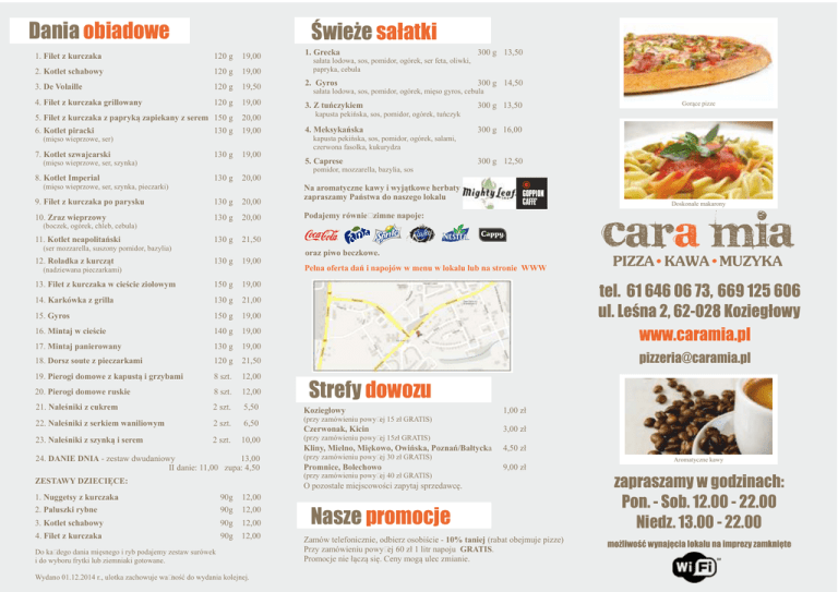 Dania obiadowe Świeże sałatki 1. Grecka 1. Filet z kurczaka 120 g 19,00 2. Kotlet schabowy 120 g 19,00 3. De Volaille 120 g 19,50 2. Gyros 4. Filet z kurczaka grillowany 120 g 19,00 3. Z tuńczykiem 5. Filet z kurczaka z papryką zapiekany z serem 150 g 20,00 6. Kotlet piracki 19,00 130 g 300 g 14,50 sałata lodowa, sos, pomidor, ogórek, mięso gyros, cebula 300 g 13,50 Gorące pizze kapusta pekińska, sos, pomidor, ogórek, tuńczyk 4. Meksykańska 300 g 16,00 kapusta pekińska, sos, pomidor, ogórek, salami, czerwona fasolka, kukurydza (mięso wieprzowe, ser) 7. Kotlet szwajcarski 300 g 13,50 sałata lodowa, sos, pomidor, ogórek, ser feta, oliwki, papryka, cebula 130 g 19,00 (mięso wieprzowe, ser, szynka) 5. Caprese 300 g 12,50 pomidor, mozzarella, bazylia, sos 8. Kotlet Imperial 130 g 20,00 (mięso wieprzowe, ser, szynka, pieczarki) 9. Filet z kurczaka po parysku 10. Zraz wieprzowy 130 g 20,00 130 g 20,00 130 g 21,50 130 g 19,00 13. Filet z kurczaka w cieście ziołowym 150 g 19,00 14. Karkówka z grilla 130 g 21,00 Na aromatyczne kawy i wyjątkowe herbaty zapraszamy Państwa do naszego lokalu Doskonałe makarony Podajemy również zimne napoje: (boczek, ogórek, chleb, cebula) 11. Kotlet neapolitański (ser mozzarella, suszony pomidor, bazylia) 12. Roladka z kurcząt oraz piwo beczkowe. (nadziewana pieczarkami) Pełna oferta dań i napojów w menu w lokalu lub na stronie WWW 15. Gyros 150 g 19,00 16. Mintaj w cieście 140 g 19,00 17. Mintaj panierowany 130 g 19,00 18. Dorsz soute z pieczarkami 120 g 21,50 19. Pierogi domowe z kapustą i grzybami 8 szt. 12,00 20. Pierogi domowe ruskie 8 szt. 12,00 21. Naleśniki z cukrem 2 szt. 5,50 Koziegłowy [email protected] Strefy dowozu 22. Naleśniki z serkiem waniliowym 2 szt. 6,50 (przy zamówieniu powyżej 15 zł GRATIS) 23. Naleśniki z szynką i serem 2 szt. 10,00 (przy zamówieniu powyżej 15zł GRATIS) 24. DANIE DNIA - zestaw dwudaniowy 13,00 II danie: 11,00 zupa: 4,50 (przy zamówieniu powyżej 30 zł GRATIS) Czerwonak, Kicin Kliny, Mielno, Miękowo, Owińska, Poznań/Bałtycka Promnice, Bolechowo 1,00 zł 3,00 zł 4,50 zł Aromatyczne kawy 9,00 zł (przy zamówieniu powyżej 40 zł GRATIS) ZESTAWY DZIECIĘCE: O pozostałe miejscowości zapytaj sprzedawcę. 1. Nuggetsy z kurczaka 2. Paluszki rybne 90g 90g 12,00 12,00 3. Kotlet schabowy 90g 12,00 4. Filet z kurczaka 90g 12,00 Do każdego dania mięsnego i ryb podajemy zestaw surówek i do wyboru frytki lub ziemniaki gotowane. Wydano 01.12.2014 r., ulotka zachowuje ważność do wydania kolejnej. Nasze promocje Zamów telefonicznie, odbierz osobiście - 10% taniej (rabat obejmuje pizze) Przy zamówieniu powyżej 60 zł 1 litr napoju GRATIS. Promocje nie łączą się. Ceny mogą ulec zmianie. Niedz. 13.00 - 22.00 15. WEGETARIANA Gorące pizze 16,50 18,40 28,70 39,50 1. MARGHERITA 16. SICILIANA sos pomidorowy, ser mozzarella, tuńczyk, pieczarki, cebula 17,50 19,40 30,20 42,20 17. PRIMAVERA 18,00 20,00 31,20 45,00 sos pomidorowy, ser mozzarella, wędzonka, salami, por 11,90 13,50 20,60 27,60 18. PEPPINO sos pomidorowy, ser mozzarella x2 16,50 18,40 28,70 42,20 sos pomidorowy, ser mozzarella, kabanos, pomidor, por 2. FUNGHI 12,90 14,40 22,40 32,70 19. MILANO sos pomidorowy, ser mozzarella, pieczarki 3. CAPRICCIOSA 4. VESUVIO 13,90 15,40 24,00 35,40 sos pomidorowy, ser mozzarella, szynka 5. HAWAI 16,00 17,70 27,70 36,80 16,50 18,40 28,70 42,70 7. CACCIATORE 15,00 16,70 26,00 37,80 sos pomidorowy, ser mozzarella, salami, por 8. POMPEI 16,00 17,90 27,80 41,00 sos pomidorowy, ser mozzarella, wędzonka, cebula 9. PESCATORE 16,50 18,40 28,70 39,50 10. PALERMO 18,50 20,60 32,00 46,00 11. QUATTRO STAGIONI 20,60 22,90 35,70 46,50 sos pomidorowy, ser mozzarella, szynka, pieczarki, małże, krewetki 12. BOLOGNESE 16,50 18,40 28,70 39,70 sos pomidorowy, ser mozzarella, szynka, sos boloński, cebula 11,00 12,20 19,00 24,80 41. CARA MIA 22,00 24,40 38,00 48,80 18,60 20,70 32,20 43,00 16,50 18,40 28,70 39,50 sos pomidorowy, ser mozzarella, kurczak, ananas, curry 17,10 19,00 29,60 39,70 sos pomidorowy, ser mozzarella, feta, papryka, cebula, oliwki Warzywa i owoce 2,50 3,50 4,50 5,50 Wędliny 3,50 4,50 5,50 6,50 Gyros, owoce morza 4,50 5,50 6,50 7,50 sos pomidorowy, ser mozzarella, salami, pieczarki, papryka pepperoni, oliwki Dodatkowa porcja sera 2,50 3,50 4,50 5,50 24. PESTO Dodatkowe ciasto do każdego rozmiaru pizzy 2,00 Sos pikantny lub czosnkowy 2,00 Sos pomidorowy do pizzy Pizza pół na pół 1,00 1,00 2,00 2,00 23. AL PACINO 18,60 20,70 32,30 43,00 16,00 17,90 27,80 41,00 sos pomidorowy, ser mozzarella, wędzonka, czosnek 17,00 18,90 29,50 40,30 sos pomidorowy, ser mozzarella, anchois, oliwki 26. DI GAMBERTI sos pomidorowy, ser mozzarella, tuńczyk, cebula, oliwki 40. MARINARA sos pomidorowy, czosnek, oliwa z oliwek pizza prosto z Neapolu! Dodatki do pizzy 25. NEAPOLITANA sos pomidorowy, ser mozzarella, tuńczyk, cebula 21,50 23,80 37,00 47,80 sos pomidorowy, ser mozzarella, tuńczyk, małże, krewetki 20. FRUTTI DI MARE sos pomidorowy, ser mozzarella, małże, krewetki 22. GRECKA sos pomidorowy, ser mozzarella, szynka, ananas, banan, curry 39. BEVERLY HILLS 17,00 18,90 29,50 40,30 kompozycja własna - sos pomidorowy, ser mozzarella, do pięciu składników do wyboru 21. INDIANA sos pomidorowy, ser mozzarella, szynka, ananas 6. TROPICANA 15,60 17,30 27,00 39,70 38. TORINO sos pomidorowy, ser mozzarella, salami, pieczarki 16,00 17,90 27,80 41,00 sos pomidorowy, ser mozzarella, szynka, pieczarki 18,20 20,30 31,50 42,20 sos pomidorowy, ser mozzarella, szynka, pieczarki, papryka, cebula sos pomidorowy, ser mozzarella, anchois, kapary O22 O32 O40 O50 37. AMERICANA sos pomidorowy, ser mozzarella, pieczarki, papryka, oliwki, cebula 17,50 19,40 30,30 41,00 sos pomidorowy, ser mozzarella, szynka, kabanos, papryka 27. LA BUSOLA 18,10 20,10 31,40 42,20 sos pomidorowy, ser mozzarella, szynka, krewetki, czosnek 28.QUATTRO FROMAGGI Doskonałe makarony 17,50 19,40 30,20 41,00 sos pomidorowy, ser mozzarella,