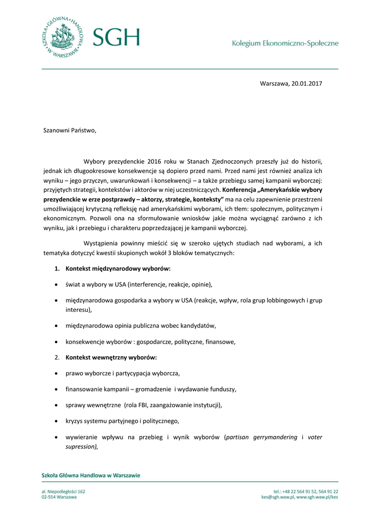 Warszawa, 20.01.2017 Szanowni Państwo, Wybory prezydenckie 2016 roku w Stanach Zjednoczonych przeszły już do historii, jednak ich długookresowe konsekwencje są dopiero przed nami. Przed nami jest również analiza ich wyniku – jego przyczyn, uwarunkowań i konsekwencji – a także przebiegu samej kampanii wyborczej: przyjętych strategii, kontekstów i aktorów w niej uczestniczących. Konferencja „Amerykańskie wybory prezydenckie w erze postprawdy – aktorzy, strategie, konteksty” ma na celu zapewnienie przestrzeni umożliwiającej krytyczną refleksję nad amerykańskimi wyborami, ich tłem: społecznym, politycznym i ekonomicznym. Pozwoli ona na sformułowanie wniosków jakie można wyciągnąć zarówno z ich wyniku, jak i przebiegu i charakteru poprzedzającej je kampanii wyborczej. Wystąpienia powinny mieścić się w szeroko ujętych studiach nad wyborami, a ich tematyka dotyczyć kwestii skupionych wokół 3 bloków tematycznych: 1. Kontekst międzynarodowy wyborów:  świat a wybory w USA (interferencje, reakcje, opinie),  międzynarodowa gospodarka a wybory w USA (reakcje, wpływ, rola grup lobbingowych i grup interesu),  międzynarodowa opinia publiczna wobec kandydatów,  konsekwencje wyborów : gospodarcze, polityczne, finansowe, 2. Kontekst wewnętrzny wyborów:  prawo wyborcze i partycypacja wyborcza,  finansowanie kampanii – gromadzenie i wydawanie funduszy,  sprawy wewnętrzne (rola FBI, zaangażowanie instytucji),  kryzys systemu partyjnego i politycznego,  wywieranie wpływu na przebieg i wynik wyborów (partisan gerrymandering i voter supression),  prawda i postprawda w kampanii (prawdomówność kandydatów i zjawisko fake news) i znaczenie weryfikacji prawdziwości wypowiedzi, 3. Komunikowanie polityczne – strategie, metody i techniki:  Marketing polityczny i organizacja kampanii (w tym i koszty prowadzenia kampanii),  stare i nowe media w kampanii (rola nowych technologii),  strategie komunikacyjne w kampanii,  opinia publiczna wobec kandydatów (nastroje społeczne i ich wpływ na przebieg i wynik wyborów, a także ich zmiana po wyborach),  kultura popularna a wybory,  wsparcie celebryckie dla kandydatów i jego rola w kampanii,  płeć (i szerzej gender) a przebieg i wynik wyborów. Konferencja odbędzie się 11 maja 2017 r. w Szkole Głównej Handlowej w Warszawie. Szczegółowe informacje, a także formularz zgłoszeniowy znajdą Państwo w załączniku i na stronie internetowej Katedry Studiów Politycznych SGH (http://www.sgh.waw.pl/ksp) w zakładce Konferencje i Seminaria. Czekamy na Państwa zgłoszenia i zapraszamy do udziału w konferencji. Z wyrazami szacunku, W imieniu Komitetu Organizacyjnego, Prof. SGH. dr hab. Małgorzata Molęda-Zdziech i dr Jan Misiuna