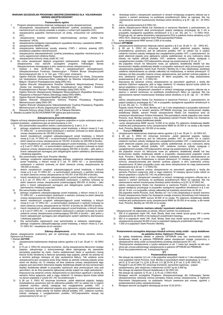 WARUNKI SZCZEGÓLNE PROGRAMU UBEZPIECZENIOWEGO DLA VOLKSWAGEN SERWIS UBEZPIECZENIOWY §1 Postanowienia ogólne 1. Program ubezpieczeniowy obejmuje następujące ryzyka ubezpieczeniowe: 1) obowiązkowe ubezpieczenia odpowiedzialności cywilnej posiadaczy pojazdów mechanicznych za szkody powstałe w związku z ruchem tych pojazdów (OC), 2) ubezpieczenia pojazdów mechanicznych od utraty, zniszczenia lub uszkodzenia (AC), 3) ubezpieczenie kosztów udzielania natychmiastowej pomocy „Hestia Car Assistance” (HCA), 4) ubezpieczenia następstw nieszczęśliwych wypadków kierowcy i pasażerów (NNW), 5) ubezpieczenie MediPlan (MP), 6) ubezpieczenie telefonicznej porady prawnej (TAP) i ochrony prawnej (OP) posiadaczy pojazdów mechanicznych, 7) ubezpieczenia odpowiedzialności cywilnej posiadaczy pojazdów mechanicznych w ruchu zagranicznym (Zielona Karta). 8) ubezpieczenie ochrony utraty zniżki AC i OC 2. Do umów ubezpieczeń objętych programem zastosowanie mają ogólne warunki ubezpieczenia oraz warunki szczególne programu Volkswagen Serwis Ubezpieczeniowy obowiązujące w dniu zawarcia umowy ubezpieczenia tj: 1) Ustawa z dnia 22.05.2003 roku o ubezpieczeniach obowiązkowych, Ubezpieczeniowym Funduszu Gwarancyjnym i Polskim Biurze Ubezpieczycieli Komunikacyjnych (Dz. U. nr 124, poz. 1152 z późń. zmianami), 2) Ogólne Warunki Ubezpieczenia Pojazdów Mechanicznych od Utraty, Zniszczenia lub Uszkodzenia (Autocasco-Diler) należących do Klientów Indywidualnych oraz Małych i Średnich Przedsiębiorców (dalej OWU AC), 3) Ogólne Warunki Ubezpieczenia Kosztów Udzielenia Natychmiastowej Pomocy „Hestia Car Assistance” dla Klientów Indywidualnych oraz Małych i Średnich Przedsiębiorców w Ramach Pakietu Dilerskiego (dalej OWU HCA), 4) Ogólne Warunki Ubezpieczenia Następstw Nieszczęśliwych Wypadków Kierowcy i Pasażerów w Ramach Pakietu Dilerskiego (dalej OWU NNW), 5) Ogólne Warunki Ubezpieczenia MediPlan (dalej OWU MP), 6) Ogólne Warunki Ubezpieczenia Ochrony Prawnej Posiadaczy Pojazdów Mechanicznych (dalej OWU OP) 7) Ogólne Warunki Ubezpieczenia Odpowiedzialności Cywilnej Posiadaczy Pojazdów Mechanicznych w Ruchu Zagranicznym (dalej OWU ZK), 8) Klauzula Ochrony Utraty Zniżki AC i OC w Pakiecie Dilerskim. 3. Składka za pakiet OC/AC/HCA/NNW/TAP płatna jest jednorazowo. §2 Zabezpieczenia przeciwkradzieżowe Objęcie ochroną ubezpieczeniową w ramach programu pojazdów w ryzyku autocasco wraz z ryzykiem kradzieży uzależnione jest od zamontowania w nim: 1) Dla samochodów wszystkich marek z zastrzeżeniem §. 2 pkt 2, 3 i 4. a) jednego urządzenia zabezpieczającego przed kradzieżą, o którym mowa § 3 ust. 31 OWU AC – w samochodach osobowych o wartości rynkowej na dzień zawarcia umowy ubezpieczenia do 100.000 zł (brutto), b) dwóch niezależnych urządzeń zabezpieczających przed kradzieżą, o których mowa § 3 ust. 31 OWU AC – w samochodach osobowych o wartości rynkowej na dzień zawarcia umowy ubezpieczenia od 100.001 zł (brutto) do 300.000 zł (brutto), c) trzech niezależnych urządzeń zabezpieczających przed kradzieżą, o których mowa w § 3 ust.31 OWU AC – w samochodach osobowych o wartości rynkowej na dzień zawarcia umowy ubezpieczenia przekraczającej 300.000 zł (brutto) – jako jedno z trzech zabezpieczeń wymagany jest obligatoryjnie system satelitarny alarmowania i lokalizacji pojazdów. 2) Dla samochodów marki Audi, Porsche i Bentley: a) Jednego urządzenia zabezpieczającego jednego urządzenia zabezpieczającego przed kradzieżą, o którym mowa § 3 ust. 31 OWU AC – w samochodach osobowych o wartości rynkowej na dzień zawarcia umowy ubezpieczenia do 100.000 zł (brutto), b) dwóch niezależnych urządzeń zabezpieczających przed kradzieżą, o których mowa w § 3 ust. 31 OWU AC – w samochodach osobowych, o wartości rynkowej na dzień zawarcia umowy ubezpieczenia od 100.001 zł do 500.000 zł (brutto), c) trzech niezależnych urządzeń zabezpieczających przed kradzieżą, o których mowa w § 3 ust. 31 OWU AC – w samochodach osobowych, o wartości rynkowej na dzień zawarcia umowy ubezpieczenia przekraczającej 500.000 zł (brutto) – jako jedno z trzech zabezpieczeń wymagany jest obligatoryjnie system satelitarny, alarmowania i lokalizacji pojazdów. 3) Dla samochodów marki Skoda: a) jednego urządzenia zabezpieczającego przed kradzieżą, o którym mowa § 3 ust. 31 OWU AC – w samochodach osobowych o wartości rynkowej na dzień zawarcia umowy ubezpieczenia do 150.000 zł (brutto), b) dwóch niezależnych urządzeń zabezpieczających przed kradzieżą, o których mowa § 3 ust. 31 OWU AC – w samochodach osobowych o wartości rynkowej na dzień zawarcia umowy ubezpieczenia od 150.001 zł (brutto) do 300.000 zł (brutto), c) trzech niezależnych urządzeń zabezpieczających przed kradzieżą, o których mowa w § 3 ust.31 OWU AC – w samochodach osobowych o wartości rynkowej na dzień zawarcia umowy ubezpieczenia przekraczającej 300.000 zł (brutto) – jako jedno z trzech zabezpieczeń wymagany jest obligatoryjnie system satelitarny alarmowania i lokalizacji pojazdów 4) Dla samochodów ciężarowych oraz samochodów w nadwoziu ciężarowego jednego urządzenia zabezpieczającego przed kradzieżą, o którym mowa § 3 ust. 31 OWU AC –niezależnie od ich wartości. §3 Zakresy ubezpieczenia Zakres ubezpieczenia uzależniony jest od wybranego przez Klienta wariantu Active, Optimum lub Premium. 1. Wariant ACTIVE: 1) ubezpieczenie każdorazowo obejmuje zakres zgodnie z § 3 ust. 35 pkt 1) – 8) OWU AC, 2) § 15 ust. 2. OWU AC otrzymuje brzmienie: „Sumę ubezpieczenia fabrycznie nowego pojazdu, zakupionego u autoryzowanego dilera zajmującego się zawodowo sprzedażą pojazdów tej marki, można zadeklarować także w wysokości równej kwocie brutto określonej w fakturze sprzedaży tego pojazdu, jednak nie później niż w terminie jednego miesiąca od daty wystawienia faktury. Tak ustalona suma 