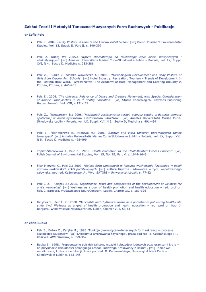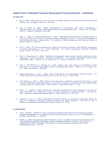 Zakład Teorii i Metodyki Taneczno-Muzycznych Form Ruchowych - Publikacje dr Zofia Pelc • Pelc Z. 2004. ‘Faulty Posture in Girls of the Cracow Ballet School’ [w:] Polish Journal of Environmental Studies, Vol. 13, Suppl. II, Part II, s. 390-392 • Pelc Z. Dubaj W; 2005.: ‘Wpływ choreoterapii na równowagę ciała dzieci niesłyszących i niedosłyszących’ [w:] Annales Universitatis Mariae Curie-Skłodowska Lublin – Polonia, vol. LX, Suppl. XVI, N 4. Sectio D, Medicina s. 283-286 • Pelc Z., Bubka Z., Słomka-Wawreczko A.; 2005.: ‘Morphological Development and Body Posture of Girls from Cracow Art. Schools’ [w:] Hotel Industry, Recreation, Tourism – Trends of Development In the Postindustrial Word, Wydawnictwo The Academy of Hotel Management and Catering Industry in Poznan, Poznań, s. 446-451 • Pelc Z.; 2006. ‘The Universal Relevance of Dance and Creative Movement, with Special Consideration of Kinetic Prophylactics In 21 st Centry Education’ [w:] Studia Choreologica, Rhytmos Publishing House, Poznań, Vol. VIII, s 121-129 • Pelc Z., Piwowarczyk B.; 2006. ‘Możliwości zastosowania terapii poprzez sztukę w domach pomocy społecznej w opinii dyrektorów i instruktorów ośrodków’ [w:] Annales Universitatis Mariae CurieSkłodowska Lublin – Polonia, vol. LX, Suppl. XVI, N 5. Sectio D, Medicina s. 491-494 • Pelc Z., Filar-Mierzwa K., Mierzwa M.; 2006. ‘Zdrowy styl życia tancerzy uprawiających taniec towarzyski’. [w:] Annales Universitatis Mariae Curie-Skłodowska Lublin – Polonia, vol. LX, Suppl. XVI, N 5. Sectio D, Medicina s. 495-499 • Topisz-Starzewska J., Pelc Z.; 2006. ‘Heath Promotion In the Healt-Related Fitness Concept’ Polish Journal of Environmental Studies, Vol. 15, No. 2B, Part V, s. 1644-1645 • Filar-Mierzwa K., Pelc Z.: 2007. Miejsce form tanecznych w lekcjach wychowania fizycznego w opinii uczniów krakowskich szkół podstawowych. [w:] Kultura fizyczna i zdrowotna w życiu współczesnego człowieka, pod red. Kaźmierczak A., Wyd. SATORI – Uniwersytet Łódzki. s. 77-82 • Pelc L. Z., Książek J.: 2008. ‘Significance, tasks and perspectives of the development of wellness for one’s well-being’. [w:] Wellness as a goal of health promotion and health education – red: prof dr. hab. J. Bargiera. Wydawnictwo NeuroCentrum. Lublin, Charter XX, s. 187-196 • Grzybek S., Pelc L. Z.: 2008. ‘Danceable and rhythmical forms as a potential to publicizing healthy life style. [w:] Wellness as a goal of health promotion and health education – red: prof dr. hab. J. Bargiera. Wydawnictwo NeuroCentrum. Lublin, Charter V, s. 53-61 [w:] dr Zofia Bubka • Pelc Z., Bubka Z., Zaręba M.; 1993. ‘Funkcja gimnastyczno-tanecznych form rekreacji w procesie kształcenia studentów’ [w:] ‘Dydaktyka wychowania fizycznego’, praca pod red. B. Czabańskiego i T. Koszyca. AWF Wrocław, s. 359-362 • Bubka Z.; 1998. ‘Propagowanie polskich tańców, muzyki i obrzędów ludowych poza granicami kraju – na przykładzie działalności polonijnego zespołu ludowego Krakowiacy z Reims’ , [w:] Taniec we współczesnej kulturze i edukacji. Praca pod red. D. Kubinowskiego, Uniwersytet Marii Curie – Skłodowskiej Lublin s. 143-145 • Bubka Z., Poznańska A.; 2000. ‘Postawa ciała, rozwój morfologiczny oraz sprawność i wydolność uczniów krakowskich podstawowych szkół muzycznych’ [w:] Wychowanie fizyczne i sport w badaniach naukowych. Praca pod red. W. Osińskiego i R. Muszkiety, AWF Poznań s. 69 • Pelc Z., Bubka Z.; 2000. ‘Wpływ aktywności ruchowej na kształtowanie sylwetki i prawidłowej postawy ciała kobiet uprawiających callanetic’. [w:] Problemy dymorfizmu płciowego w sporcie. Praca pod red. S. Sochy. AWF Katowice s. 255-261 • Bubka Z., Bubka J.: 2002. 'Ćwiczenia muzyczno-ruchowe w realizacji programu nauczania z wychowania fizycznego w szkołach' [w:] Ruch, muzyka i taniec, jako element kultury i edukacji. Wydawnictwo AWF Wrocław s. 91-96 • Pelc Z., Bubka Z., Woźniak D.: 2002. ‘Łączenie diety z aktywnością fizyczną jako sposób na modelowanie sylwetki i doskonalenie sprawności’. [w:] Nowiny Lekarskie nr 4-5/2002 (71), s. 245-248 • Pelc Z.. Bubka Z.; 2004. ‘Rekreacyjno-sportowo-wychowawcza działalność parafialnego klubu ‘Albertus’ w Krakowie’ [w:] ‘Hotelarstwo, gastronomia, turystyka i rekreacja w procesie integracji europejskiej’ Wydawnictwo WSHiG Poznań, s. 481-486 • Pelc Z., Bubka Z., Słomka-Wawreczko A.; 2005.: ‘Morphological Development and Body Posture of Girls from Cracow Art. Schools’ [w:] Hotel Industry, Recreation, Tourism – Trends of Development In the Postindustrial Word, Wydawnictwo The Academy of Hotel Management and Catering Industry in Poznan, Poznań, s. 446-451 • Bubka Z., Pelc Z.; 2005.: ‘Rola polskiego folkloru tanecznego w życiu Polonii’ [w:] Moc tańca z cyklu Ruch, Muzyka, Taniec. (red.) B. Siedlecka i W. Biliński, Wydawnictwo AWF Wrocław, s. 37-39 • Bubka Z., Pelc Z., Proniewicz J.; 2006. ‘Zainteresowanie formami taneczno – muzycznymi studentów kierunku wychowania fizycznego’ [w:] Zarządzanie i usługi w obszarze kultury fizycznej i hotelarstwa. Teoria i praktyka. Pod red. W. Siwińskiego, R. D. Taubera, E. Muchy-Szajek WSHiG Poznań, PSNARiT s. 257-264 • Bubka Z. 2007; Rytm, ruch, muzyka w lekcjach wychowania fizycznego – nie bójmy się tańczyć. [w:] Wydawnictwo monograficzne pod red. A. Kaźmierczaka, A. Makarczuk, A. Myszorek-Szymali. Kultura Fizyczna i Zdrowotna w życiu współczesnego człowieka. SATORI, Łódź. dr Anna Poznańska • Januszewski J., Poznańska A., Matusik S.: 1996: ‘Modyfikacja testu Margarii-Kalamana’, Antropomotoryka nr 14, AWF, Kraków • Bubka Z., Poznańska A.: 2000. 'Postawa ciała , rozwój morfologiczny oraz sprawność i wydolność fizyczna uczniów krakowskich podstawowych szkół muzycznych'. [w:] Wychowanie Fizyczne i Sport w badaniach naukowych. Wydawnictwo AWF Poznań, s.