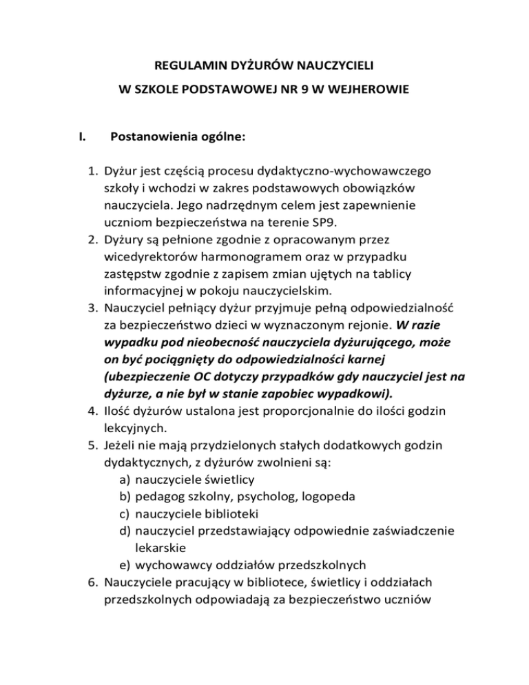 Regulamin dyżurów nauczycieli - Szkoła Podstawowa nr 9 w