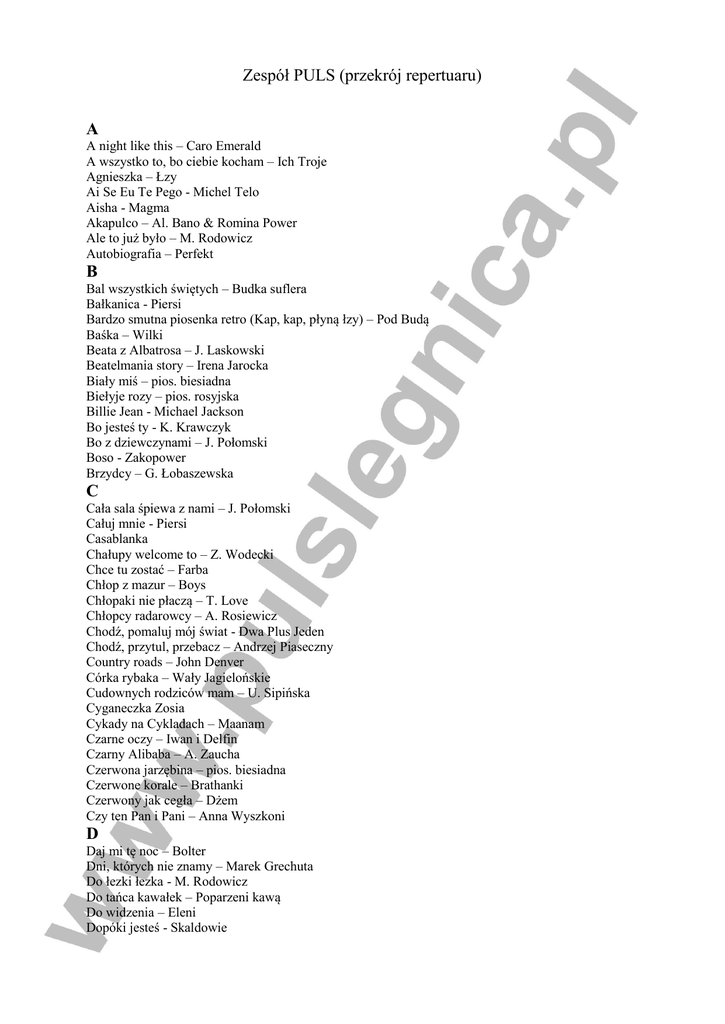 Zespół PULS (przekrój repertuaru) A A night like this – Caro Emerald A wszystko to, bo ciebie kocham – Ich Troje Agnieszka – Łzy Ai Se Eu Te Pego - Michel Telo Aisha - Magma Akapulco – Al. Bano & Romina Power Ale to już było – M. Rodowicz Autobiografia – Perfekt B Bal wszystkich świętych – Budka suflera Bałkanica - Piersi Bardzo smutna piosenka retro (Kap, kap, płyną łzy) – Pod Budą Baśka – Wilki Beata z Albatrosa – J. Laskowski Beatelmania story – Irena Jarocka Biały miś – pios. biesiadna Biełyje rozy – pios. rosyjska Billie Jean - Michael Jackson Bo jesteś ty - K. Krawczyk Bo z dziewczynami – J. Połomski Boso - Zakopower Brzydcy – G. Łobaszewska C Cała sala śpiewa z nami – J. Połomski Całuj mnie - Piersi Casablanka Chałupy welcome to – Z. Wodecki Chce tu zostać – Farba Chłop z mazur – Boys Chłopaki nie płaczą – T. Love Chłopcy radarowcy – A. Rosiewicz Chodź, pomaluj mój świat - Dwa Plus Jeden Chodź, przytul, przebacz – Andrzej Piaseczny Country roads – John Denver Córka rybaka – Wały Jagielońskie Cudownych rodziców mam – U. Sipińska Cyganeczka Zosia Cykady na Cykladach – Maanam Czarne oczy – Iwan i Delfin Czarny Alibaba – A. Zaucha Czerwona jarzębina – pios. biesiadna Czerwone korale – Brathanki Czerwony jak cegła – Dżem Czy ten Pan i Pani – Anna Wyszkoni D Daj mi tę noc – Bolter Dni, których nie znamy – Marek Grechuta Do łezki łezka - M. Rodowicz Do tańca kawałek – Poparzeni kawą Do widzenia – Eleni Dopóki jesteś - Skaldowie Dozwolone do lat osiemnastu – Czerwone Gitary Dziś prawdziwych cyganów już nie ma – pios. Biesiadna F Facet to świnia – Big Cyc G Gdy nie ma dzieci – Kazik i Kult Gdy zapłaczesz – Stachurski Gdybym miał gitarę – pios. biesiadna Gdzie się podziały tamte prywatki – W. Gąsowski Goniąc kormorany – P. Szczepanik Góralka Halka H Happy - Pharell Williams Hej Sokoły – pios. biesiadna Historia pewnej znajomości - Czerwone Gitary I I feel lonely - Sasha I just called to say I love you – Stevie Wonder I’ve had (The time of my live) – pios. z filmu Dirty Dancing It’s my party – Bryan Ferry J Jadą wozy kolorowe - M. Rodowicz Jambolaya (Baju Baju) – A. Jantar Jedzie pociąg z daleka – R. Rynkowski Jest już ciemno - Feel Jesteś szalona – Boys Jeszcze dzień, najwyżej dwa – Czerwone Gitary Jolka, Jolka – Budka suflera Juliet - Lawson K Kaczuchy – mel. tradycyjna Kankan – mel. tradycyjna Kapitańskie tango – Alibabki Kasztany Kawiarenki – I. Jarocka Kazaczok – mel. tradycyjna Kocham cię kochanie moje – Maanam Kolorowe jarmarki – J. Laskowski Kołysanka – Sumptuastic Konik na biegunach – Urszula L L’italiano (Lasciatemi cantare), pios. włoska – Toto Cotugno La bamba – Los Lobos La Paloma – (tango) Lady Carnaval – (samba) Lambada - Kaoma Let`s get loud – Jennifer Lopez Let’s twist again – Chubby Checker Little lies – Fleetwood Mac Live is live – Opus M Macho - Kasa Makarena - Los Del Rio Małgośka – M. Rodowicz Mamma mia – Abba Mamma mia – In Grid Marina – pios. włoska Meksykana Mniej niż zero – Lady Pank Moja cyganko – Don Wasyl Moja mała blondyneczko - Bayer Full Moje jedyne marzenie (Przetańczyć z tobą chcę całą noc) – A. Jantar Monika, dziewczyna ratownika – Wały Jagielońskie Mój jest ten kawałek podłogi - Mr Zoob Mój przyjacielu - K. Krawczyk N Nie bądź taki szybki Bill – K. Sobczyk Nie było ciebie tyle lat – K. Giżowska Nie liczę godzin i lat – A. Rybiński Nie płacz Ewka - Perfekt Niebo z moich stron – Czerwone Gitary Niech żyje bal - M. Rodowicz Niekochanie - Pin Nikt na świecie nie wie, że się kocham w Ewie – Czerwone Gitary Nogi – Czarno Czarni O Od dziś - Paula Ona jest ze snu - Ira Ona tańczy dla mnie - Weekend One way ticket - Eruption Ore ore (My cyganie) – pios. biesiadna Ostatni raz zatańczysz ze mną – K. Krawczyk P Piechotą do lata - Bajm Pocieszanka – A. Rybiński Pod papugami – Cz. Niemen Pomimo burz – Antek Smykiewicz Prawdziwe powietrze - Loka Prawy do lewego - Kayah Prowadź mnie – Kasia Kowalska Prócz Ciebie nic - K. Kijański & Kayah Przeżyj to sam – Lombard Przy kominku – tango R Radio hello - Enej Rock and roll is king – Electric Light Orchestra Rozamunda – mel. tradycyjna Ruda tańczy jak szalona - Czadoman Rudy rydz – H. Majdaniec Rudy się żeni – Big Cyc Rycz mała rycz – Vox S Sen się spełni” – Kombi Serduszko puka w rytmie cha-cha – M. Koterbska Sex bomb – Tom Jones Skrzydlate ręce - Enej Słodkiego, miłego życia – Kombi Stain alive – Bee Gees Statki na niebie – De Mono Strangers in the night – Frank Sinatra Suliko - Eleni Szalona Ruda - DJ Disco Sunny – Boney M Sway – Pussycat Dolls Szczęśliwej drogi już czas – Ryszard Rynkowski Ściernisko – Golec Orkiestra Ślubne prezenty – I. Jarocka T Ta sama chwila – Bajm Tak bardzo się starałem – Czerwone Gitary Tak blisko – Rafał Brzozowski Takie tango – Budka suflera Tańcz, tańcz, tańcz - Long & Junior Ti Amo – Umberto Tozzi Tin Pan Alley – H. Frąckowiak Trzynastego – K. Sobczyk Tylko ty, tylko ja – K. Krawczyk Typ niepokorny – Stachurski U Urke - Wilki V Volare – Gipsy Kings (pios. włoska) W W kinie, w Lublinie – Brathanki Wakacje z blondynką Walc Barbary – walc z filmu Noce i dnie Weselny klimat – Ada Krawczyk Whisky – Dżem Wielka miłość – S. Krajewski Windą do nieba – Dwa Plus Jeden Wiśniowy sad – (cha-cha) Wolność i swoboda – Boys Wonderful world – L. Amstrong Wszystko mi mówi, że mnie ktoś pokochał – Skaldowie Y Your my heart your my soul - Modern Talking Z Z każdym twym oddechem – Stachurski Za jeden uśmiech twój - Sumptuastic Za każdy uśmiech twój – A. Jantar Za tobą pójdę jak na bal – K. Krawczyk Zabiorę Cię właśnie tam – Tomasz Karolak Zawsze gdzieś czeka ktoś – A. Jantar Zawsze z