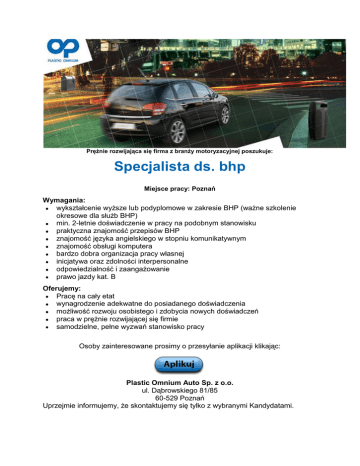 Prężnie rozwijająca się firma z branży motoryzacyjnej poszukuje: Specjalista ds. bhp Miejsce pracy: Poznań Wymagania: wykształcenie wyższe lub podyplomowe w zakresie BHP (ważne szkolenie okresowe dla służb BHP) min. 2-letnie doświadczenie w pracy na podobnym stanowisku praktyczna znajomość przepisów BHP znajomość języka angielskiego w stopniu komunikatywnym znajomość obsługi komputera bardzo dobra organizacja pracy własnej inicjatywa oraz zdolności interpersonalne odpowiedzialność i zaangażowanie prawo jazdy kat. B Oferujemy: Pracę na cały etat wynagrodzenie adekwatne do posiadanego doświadczenia możliwość rozwoju osobistego i zdobycia nowych doświadczeń praca w prężnie rozwijającej się firmie samodzielne, pełne wyzwań stanowisko pracy Osoby zainteresowane prosimy o przesyłanie aplikacji klikając: Plastic Omnium Auto Sp. z o.o. ul. Dąbrowskiego 81/85 60-529 Poznań Uprzejmie informujemy, że skontaktujemy się tylko z wybranymi Kandydatami. Prosimy o dopisanie następującej klauzuli: "Wyrażam zgodę na przetwarzanie moich danych osobowych zawartych w mojej ofercie pracy dla potrzeb niezbędnych do realizacji procesu rekrutacji zgodnie z ustawą z dnia 29 sierpnia 1997 r. o ochronie danych osobowych (Dz. U. z 2002 r. Nr 101, poz. 926, ze zm.)" Źródło / Aplikuj: http://www.pracuj.pl/praca/specjaliste-ds-bhp-poznan,oferta,2723022?ref=gowork