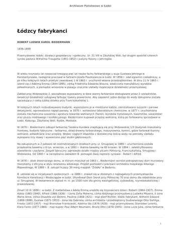 Archiwum Państwowe w Łodzi Łódzcy fabrykanci ROBERT LUDWIK KAROL BIEDERMANN 1836-1899 Przemysłowiec łódzki, działacz gospodarczy i społeczny. Ur. 21 VIII w Zduńskiej Woli, był drugim spośród czterech synów pastora Wilhelma Traugotta (1801-1852) i Justyny Rosiny z Jehringów. W wieku trzynastu lat rozpoczął trwającą pięć lat naukę fachu farbiarskiego u wuja Gustawa Jehringa w Konstantynowie, następnie pracował w farbiarni Józefa Paszkiewicza w Łodzi. W 1856 r. zdał egzamin czeladniczy, a po kilku kolejnych latach praktyki zawodowej 1 III 1863 r. uruchomił własne przedsiębiorstwo. W dniu 11 IV 1863 r. ożenił się z Adelmą Emmą (1844-1895), córką Friedricha Edwarda Brauna, właściciela manufaktury wyrobów półwełnianych, a pieniądze wniesione w posagu znacznie ułatwiły rozpoczęcie działalności przemysłowej. Zakład przy Widzewskiej 2, początkowo wyposażony w dwie wanny farbiarskie obsługiwane przez 2 czeladników, świadczył działalność usługową farbując towary powierzone. Aby zapewnić sobie dostęp do wody dokupiona została sąsiadująca z rzeką Łódką działka przy Franciszkańskiej 1. W kolejnych latach rozbudowywano budynki, wyposażono je w miedziane kadzie, zainstalowano suszarki i parowe dekatyzerki, wprowadzono napęd parowy, w 1870 r. wzniesiono laboratorium chemiczne, w 1877 r. uruchomiona została mechaniczna suszarnia i apretura towarów wełnianych (flaneli, wyrobów trykotowych, kaszmirów, szewiotów) oraz pluszu meblowego i konfekcyjnego. Biedermann kupował przędzę wełnianą, którą po farbowaniu sprzedawał w Łodzi, Koburgu, Zduńskiej Woli, Rydze, Moskwie. W 1879 r. Biedermann odkupił farbiarnię Teodora Kundela znajdującą się przy Widzewskiej 1/3 (budynek mieszkalny frontowy, budynki fabryczne - farbiarnia, skład drewna farbiarskiego, maszynownia, komin), gdzie farbował tkaniny wełniane, półwełniane oraz przędzę. Wobec ciągłych kłopotów z dostateczną ilością wody na potrzeby zakładu wykopano trzy stawy i wywiercono pięć studni głębinowych. Na zakupionych w 2 połowie lat osiemdziesiątych działkach przy ul. Smugowej w 1889 r. uruchomiona została przędzalnia bawełny z 6 tys. wrzecion, a w 1892 r. tkalnia bawełny na 60 krosien. W 1894 r. zelektryfikowano oświetlenie i zasilanie. Zespół fabryczny zajmowało działki między ulicami Północną, Franciszkańską, Smugową i Widzewską. Od 1890 r. w zarządzaniu zakładem B. pomagali dwaj najstarsi synowie - Robert i Alfred. W 1878 r. obok drewnianego domu, w którym mieszkał od 1863 r., Biedermann wzniósł jednopiętrowy dom murowany mieszkalny z oficyną w stylu renesansu włoskiego. Projekt pochodził z pracowni architekta miejskiego Hilarego Majewskiego. W 1888 r. B. zakupił liczący 30 mórg majątek "Źródło" w Bedoniu. B. udzielał się w inicjatywach społecznych - w 1886 r. znalazł się w złożonym z najbogatszych przemysłowców Komitecie Kanalizacji i Wodociągów w Łodzi. Ufundował Dom Sierot przy Północnej 70 oraz domy dla robotników przy ul. Smugowej. W testamencie zapisał m. in. po 1500 rubli dla gminy ewangelickiej, żydowskiej, rzymskokatolickiej i prawosławnej. Zmarł 10 IX 1899 r. w Łodzi. Z małżeństwa z Adelą Emmą urodziło się trzynaścioro dzieci: Robert (1864-1927), Emma Adela (1865-1940), Alfred (1866-1936) - I żona Zofia Malwina, córka łódzkiego przemysłowca Ludwika Meyera, II żona Marta Anna, córka Oswalda von Berens, Paulina (1868-1921) - mąż Józef Richter, łódzki fabrykant, Wilhelm Edward (1869-1888), Gustaw (1871-1953) - żona Ida Gabriela, córka architekta i przedsiębiorcy budowlanego Otto Gehliga, Frieda (1872-1957) - mąż Bronisław Frankowski, Adelma Ida (1876-1928) - mąż przemysłowiec Stanisław Lorentz, Klara Fanni (1877-1966) - mąż kupiec Paul Albert Neumann, Bruno Otto (1878-1945) - żona Luiza Julia, córka farbiarza 1 Archiwum Państwowe w Łodzi Johanna Hermanna Adolfa Stegmanna, Eliza (1879-1901), Hedwig Johanna (1881-1958) - mąż prof. med. Karol Noeggerath, Eugen - zmarł w dzieciństwie. GUSTAW ADOLF GEYER 1844-1893 Przemysłowiec, działacz społeczny i gospodarczy. Ur. 26 I w Łodzi, był trzecim spośród siedmiu synów Ludwika Ferdynanda (1805-1869) i Emilii Szarlotty Karoliny z d. Tűrk (1812-1884). Po ukończeniu łódzkiej Szkoły Realnej odbył praktykę w Anglii w Banku Fridrich Huth, gdzie poznał stosunki panujące w świecie handlowym. Z praktyk powrócił w wieku 25 lat. Ludwik G., z braku kapitału potrzebnego do samodzielnego uruchomienia fabryki po pięcioletnim przestoju związanym z wojną secesyjną oraz Powstaniem Styczniowym, zawarł na okres 10 lat spółkę z Wilhelmem i Bernardem Ginsbergami. Po powrocie z zagranicy Gustaw G. zastąpił chorego ojca, przejmując na siebie wszystkie obowiązki wynikające z umów i pełnił funkcję zarządcy. Jeszcze przed wygaśnięciem umowy z Ginsbergami w 1878 r. stanął na czele zawiązanej przez spadkobierców Ludwika G. spółki rodzinnej. W 1886 r. został prezesem utworzonego Towarzystwa Akcyjnego Wyrobów Bawełnianych "Ludwik Geyer". Już w roku następnym zdołał odbudować potencjał firmy, która znalazła się w czołówce zakładów włókienniczych Królestwa Polskiego, zarówno pod względem wielkości jak i wartości produkcji. Gustaw był najbardziej aktywny z braci na polu gospodarczym. Kiedy tylko udało mu się ustabilizować sytuację finansową rodziny, spłacić część długów oraz zgromadzić większe kapitały, zainwestował je w cegielnię. W okresie dynamicznego i żywiołowego rozwoju Łodzi gwałtownie wzrosło zapotrzebowanie na materiały budowlane. W latach 1874-1979 G. wraz ze wspólnikami prowadził Fabryczne Towarzystwo Cegielni w miejscowości Bruss pod Łodzią. Po ślubie G. użytkował majątek Skęczniew położony w łęczyckiem, na którym zabezpieczony był posag wniesiony przez małżonkę. W 1880 r. kupił majątek ziemski Sikawa, mają