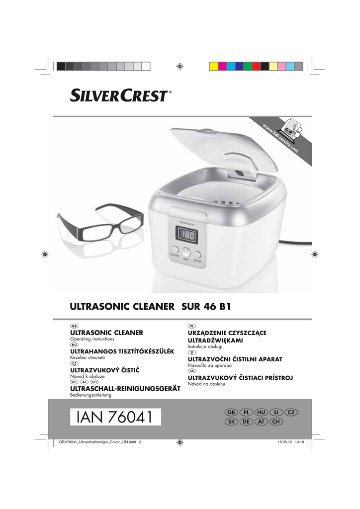 ULTRASONIC CLEANER SUR 46 B1 ULTRASONIC CLEANER Operating instructions ULTRAHANGOS TISZTÍTÓKÉSZÜLÉK Kezelési útmutató ULTRAZVUKOVÝ ČISTIČ Návod k obsluze ULTRASCHALL-REINIGUNGSGERÄT URZĄDZENIE CZYSZCZĄCE ULTRADŹWIĘKAMI Instrukcja obsługi ULTRAZVOČNI ČISTILNI APARAT Navodilo za uporabo ULTRAZVUKOVÝ ČISTIACI PRÍSTROJ Návod na obsluhu Bedienungsanleitung IAN 76041 GRA76041_Ultraschallreiniger_Cover_LB4.indd 2 16.08.12 14:18 __GRA76041_B4.book Seite 1 Montag, 27. August 2012 3:34 15 English..................................................................................... 2 Polski .................................................................................... 12 Magyar ................................................................................. 22 Slovenšina ........................................................................... 34 esky .................................................................................... 42 Slovenina ............................................................................. 52 ID: SUR 46 B1_12_V1.3 Deutsch ................................................................................. 62 __GRA76041_B4.book Seite 2 Montag, 27. August 2012 3:34 15 Overview / Przegld / Áttekintés / Pregled / Pehled / Prehad / Übersicht 1 12 11 2 10 9 8 7 6 A B C D 3 4 5 __GRA76041_B4.book Seite 2 Montag, 27. August 2012 3:34 15 Contents 1. 2. 3. 4. 5. Intended purpose ............................................................................ 3 Safety information ........................................................................... 3 Items supplied ................................................................................. 5 How to use ...................................................................................... 5 Operation ........................................................................................ 5 5.1 Describing the functioning of the ultrasonic cleaning process ...................... 5 5.2 Unsuited for being cleaned by ultrasound ................................................ 5 5.3 Examples of use.................................................................................... 6 5.4 Cleaning process .................................................................................. 7 6. Cleaning .......................................................................................... 8 7. Storage ........................................................................................... 8 8. Disposal .......................................................................................... 8 9. Problem-solving .............................................................................. 9 10. Technical specifications .................................................................... 9 11. Warranty of the HOYER Handel GmbH ............................................. 9 Overview 1 MAX 2 3 4 5 6 7 STOP 8 SET 9 START 10 11 12 2 GB Marking of the maximum filling level Stainless steel tank Power LED is lit during the cleaning process Transparent lid Power cable with mains plug Display Off button interrupting the cleaning process early Setting the cleaning period (180, 300, 480, 600, 090 seconds) On button starting the cleaning process Bracelet holder Basket inset for small parts Spindle for no more than 2 CDs/DVDs (with spacer ring) __GRA76041_B4.book Seite 3 Montag, 27. August 2012 3:34 15 Thank you for your trust! 1. Intended purpose Congratulations on your new ultrasonic cleaner. For a safe handling of the device and in order to get to know the entire scope of features: • • • • • Thoroughly read these operating instructions prior to initial commissioning. Above all, observe the safety instructions! The device should only be used as described in these operating instructions. Keep these operating instructions for reference. If you pass the device on to someone else, please include these instructions. We hope you enjoy your new ultrasonic cleaner! The ultrasonic cleaner is provided for a careful and thorough cleaning of e. g. jewellery, eyeglasses, CDs/DVDs, dentures, shaving heads and more. The device is designed for use in private households. The device must only be used indoors. This device must not be used for commercial purposes. Foreseeable misuse WARNING! Risk of material damage! Not all objects may be cleaned with the device (see “Unsuited for being cleaned by ultrasound” on page 5). 2. Safety information Warnings If necessary, the following warnings will be used in these operating instructions: DANGER! High risk: failure to observe this warning may result in injury to life and limb. WARNING! Moderate risk: failure to observe this warning may result in injury or serious material damage. CAUTION: low risk: failure to observe this warning may result in minor injury or material damage. NOTE: circumstances and specifics that must be observed when handling the device. DANGER for children • Packing materials are not children's toys. Children should not be allowed to play with the plastic bags. There is a risk of suffocation. GB 3 __GRA76041_B4.book Seite 4 Montag, 27. August 2012 3:34 15 • • • This device is not designed to be used by people (including children) with limited physical, sensory or mental capabilities or people without adequate experience and/or understanding unless they are supervised by someone responsible for their safety or are instructed by them on how to use the device. Children must be supervised to ensure that they do not play with the device. Keep the device out of the reach of children. • • • • DANGER of electric shock due to moisture • • • • • Protect the appliance from moisture, water drops and water spray: failure to observe this instruction may result in an electrical shock hazard. The device, the power cable and the mains plug must not be immersed in water or any other liquids. If liquids enter the inside of the device,