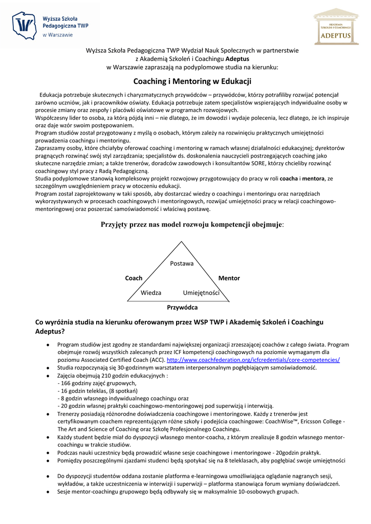 Wyższa Szkoła Pedagogiczna TWP Wydział Nauk Społecznych w partnerstwie z Akademią Szkoleo i Coachingu Adeptus w Warszawie zapraszają na podyplomowe studia na kierunku: Coaching i Mentoring w Edukacji Edukacja potrzebuje skutecznych i charyzmatycznych przywódców – przywódców, którzy potrafiliby rozwijad potencjał zarówno uczniów, jak i pracowników oświaty. Edukacja potrzebuje zatem specjalistów wspierających indywidualne osoby w procesie zmiany oraz zespoły i placówki oświatowe w programach rozwojowych. Współczesny lider to osoba, za którą pójdą inni – nie dlatego, że im dowodzi i wydaje polecenia, lecz dlatego, że ich inspiruje oraz daje wzór swoim postępowaniem. Program studiów został przygotowany z myślą o osobach, którym zależy na rozwinięciu praktycznych umiejętności prowadzenia coachingu i mentoringu. Zapraszamy osoby, które chciałyby oferowad coaching i mentoring w ramach własnej działalności edukacyjnej; dyrektorów pragnących rozwinąd swój styl zarządzania; specjalistów ds. doskonalenia nauczycieli postrzegających coaching jako skuteczne narzędzie zmian; a także trenerów, doradców zawodowych i konsultantów SORE, którzy chcieliby rozwinąd coachingowy styl pracy z Radą Pedagogiczną. Studia podyplomowe stanowią kompleksowy projekt rozwojowy przygotowujący do pracy w roli coacha i mentora, ze szczególnym uwzględnieniem pracy w otoczeniu edukacji. Program został zaprojektowany w taki sposób, aby dostarczad wiedzy o coachingu i mentoringu oraz narzędziach wykorzystywanych w procesach coachingowych i mentoringowych, rozwijad umiejętności pracy w relacji coachingowomentoringowej oraz poszerzad samoświadomośd i właściwą postawę. Przyjęty przez nas model rozwoju kompetencji obejmuje: Postawa Coach Wiedza Mentor Umiejętności Przywódca Co wyróżnia studia na kierunku oferowanym przez WSP TWP i Akademię Szkoleo i Coachingu Adeptus? Program studiów jest zgodny ze standardami największej organizacji zrzeszającej coachów z całego świata. Program obejmuje rozwój wszystkich zalecanych przez ICF kompetencji coachingowych na poziomie wymaganym dla poziomu Associated Certified Coach (ACC). http://www.coachfederation.org/icfcredentials/core-competencies/ Studia rozpoczynają się 30-godzinnym warsztatem interpersonalnym pogłębiającym samoświadomośd. Zajęcia obejmują 210 godzin edukacyjnych : - 166 godziny zajęd grupowych, - 16 godzin teleklas, (8 spotkao) - 8 godzin własnego indywidualnego coachingu oraz - 20 godzin własnej praktyki coachingowo-mentoringowej pod superwizją i interwizją. Trenerzy posiadają różnorodne doświadczenia coachingowe i mentoringowe. Każdy z trenerów jest certyfikowanym coachem reprezentującym różne szkoły i podejścia coachingowe: CoachWise™, Ericsson College The Art and Science of Coaching oraz Szkołę Profesjonalnego Coachingu. Każdy student będzie miał do dyspozycji własnego mentor-coacha, z którym zrealizuje 8 godzin własnego mentorcoachingu w trakcie studiów. Podczas nauki uczestnicy będą prowadzid własne sesje coachingowe i mentoringowe - 20godzin praktyk. Pomiędzy poszczególnymi zjazdami studenci będą spotykad się na 8 teleklasach, aby pogłębiad swoje umiejętności Do dyspozycji studentów oddana zostanie platforma e-learningowa umożliwiająca oglądanie nagranych sesji, wykładów, a także uczestniczenia w interwizji i superwizji – platforma stanowiąca forum wymiany doświadczeo. Sesje mentor-coachingu grupowego będą odbywały się w maksymalnie 10-osobowych grupach. Program Moduły I. II. III. IV. V. VI. Trening podstawowych kompetencji coacha - świadomości siebie i otoczenia Razem 48 Warsztat o charakterze interpersonalno - integracyjnym 30 Warsztat twórczego myślenia i pracy z metaforą 6 Warsztat rozwoju osobistego z zastosowaniem analizy transakcyjnej zarządzanie własną osobą i relacjami 12 Wykorzystanie psychologii w coachingu i mentoringu Razem 6 Psychologia osobowości – inteligencja, temperament i osobowość 2 Mechanizmy procesu zmiany 2 Neuropsychologia w komunikacji, uczenie się dorosłych 2 Wstęp do coachingu i mentoringu Razem10 Podstawy coachingu, tutoringu i mentoringu – rodzaje, formy oraz zastosowanie coachingu i mentoringu, a inne sposoby rozwijania kompetencji 6 Zasady pracy coacha, tutora i mentora – relacje z klientem 2 Etyka zawodu coacha zgodnie ze standardami ICF – wyzwania i trudności w pracy coacha 2 Metodologia prowadzenia coachingu i mentoringu Razem 90 Narzędzia diagnostyczne 6 Modele coachingu i mentoringu 4 Warsztaty umiejętności coacha, tutora i mentora 22 Elementy i mapa procesu coachingowego i mentoringowego 12 Analiza zasobów wewnętrznych i zewnętrznych klienta i organizacji 12 Coaching wartości, przekonań, perspektyw, przywództwa oraz wyzwalaczy 28 Metodyka coachingu grupowego 6 Coaching i mentoring w zastosowaniu Razem 12 Coaching i mentoring kariery 4 Coaching i mentoring rodzicielski 6 Zarządzanie coachingiem i mentoringiem w organizacji 2 Superwizja i obrona Razem 44 Praktyki coachingowe i ewaluacja procesu coachingowego z superwizją 20 Własny proces coachingowy 8 Konsultacje pracy dyplomowej – mój własny styl coachingowy 4 Seminarium pracy dyplomowej – prezentacja sesji coachingowej 12 Terminy zjazdów ZJAZD DATA DZIEŃ GODZINY STYCZEŃ 2013 I 11.I.2013 piątek 9.00 – 18.15 12.I.2013 sobota 9.00 – 18.15 13.I.2013 niedziela 9.00 – 18.15 25.I.2013 piątek 16.00 – 20.45 26.I.2013 sobota 8.30 – 19.30 II LUTY 2013 15.II.2013 piątek 16.00 – 20.45 16.II.2013 sobota 8.30 – 19.30 III MARZEC 2013 15.III.2013 piątek 16.00 – 20.45 16.III.2013 sobota 8.30 – 19.30 IV KWIECIEŃ 2013 19.IV.2013 piątek 16.00 – 20.45 20.IV.2013 sobota 8.30 – 19.30 V MAJ 2013 10.V.2013 piątek 16.00 – 20.45 11.V.2013 sobota 8.30 – 19.30 24.V.2013 piątek 16.00 – 20.45 25.V.2013 sobota 8.30 – 19.30 VI VII CZERWIEC 2013 VIII 14.VI.2013 piątek 16.00 – 20.