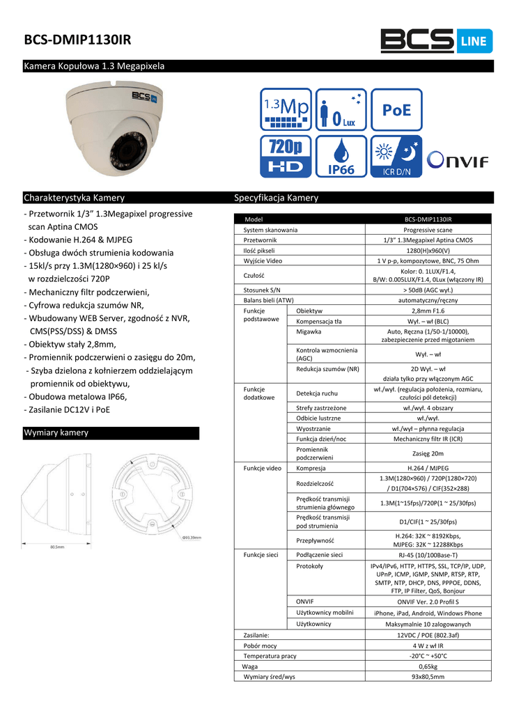 BCS-DMIP1130IR Ka era Kopuło a . Megapi ela Charakterystyka Kamery - Przetwornik / ” . Megapi el progressi e scan Aptina CMOS - Kodowanie H.264 & MJPEG - O sługa d ó h stru ie ia kodo a ia - 15kl/s przy 1.3M(1280×960) i 25 kl/s rozdziel zoś i P - Mechaniczny filtr podczerwieni, - C fro a reduk ja szu ó NR, - W udo a WEB Ser er, zgod ość z NVR, CMS(PSS/DSS) & DMSS - Obiektyw stał 2,8mm, - Promie ik pod zer ie i o zasięgu do 20m, - Sz a dzielo a z koł ierze oddzielają promiennik od obiektywu, - Obudowa metalowa IP66, - Zasilanie DC12V i PoE Specyfikacja Kamery Model BCS-DMIP1130IR System skanowania Progressive scane / ” . Megapi el Apti a CMOS Przetwornik Ilość pikseli 1280(H)x960(V) W jś ie Video 1 V p-p, kompozytowe, BNC, 75 Ohm Kolor: 0. 1LUX/F1.4, B/W: 0.005LUX/F1.4, Lu łą zo Czułość > Stosunek S/N Obiektyw 2,8mm F1.6 Ko pe sa ja tła W ł. – ł BLC) Auto, Rę z a / 0-1/10000), zabezpieczenie przed migotaniem Migawka Kontrola wzmocnienia (AGC) Reduk ja szu ó Funkcje dodatkowe NR W ł. – ł 2D W ł. – ł działa t lko prz łą zo ł./ Detekcja ruchu ł./ ł./ Wyostrzanie ł – pł )asięg Kompresja Prędkość tra s isji stru ie ia głó ego Prędkość tra s isji pod strumienia Protokoł Po ór 1.3M(1~15fps)/720P(1 ~ 25/30fps) D1/CIF(1 ~ 25/30fps) RJ-45 (10/100Base-T) i Uż tko i o il i iPhone, iPad, Android, Windows Phone Maksymalnie 10 zalogowanych 12VDC / POE (802.3af) o 4 W z ł IR Waga - °C ~ + °C 0,65kg iar śred/ × × ONVIF Ver. 2.0 Profil S Uż tko Temperatura pracy W / P / CIF IPv4/IPv6, HTTP, HTTPS, SSL, TCP/IP, UDP, UPnP, ICMP, IGMP, SNMP, RTSP, RTP, SMTP, NTP, DHCP, DNS, PPPOE, DDNS, FTP, IP Filter, QoS, Bonjour ONVIF Zasilanie: × × H.264: 32K ~ 8192Kbps, MJPEG: 32K ~ 12288Kbps ość Podłą ze ie sie i Funkcje sieci m H.264 / MJPEG . M /D Rozdziel zość Przepł ł. a regula ja Mechaniczny filtr IR (ICR) Promiennik podczerwieni Funkcje video ł. o szar ł./ Odbicie lustrzne Fu k ja dzień/ o AGC ł. regula ja położe ia, roz iaru, zułoś i pól detek ji Stref zastrzeżo e Wymiary kamery s IR) ł. auto at z /rę z Balans bieli (ATW) Funkcje podstawowe dB AGC 93x80,5mm