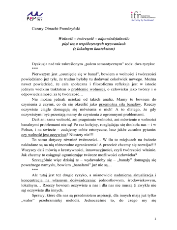 Cezary Obracht-Prondzyński Wolność – twórczość – odpowiedzialność: pięć tez o współczesnych wyzwaniach (z lokalnym kontekstem) Dyskusja nad tak zakreślonym „polem semantycznym” rodzi dwa ryzyka: *** Pierwszym jest „osunięcie się w banał”, bowiem o wolności i twórczości powiedziano już tyle, że trudno byłoby tu dodawać cokolwiek nowego. Można nawet powiedzieć, że cała społeczna i filozoficzna refleksja jest w istocie jednym wielkim traktatem o problemie wolności, o człowieku jako twórcy i o odpowiedzialności za tę twórczość… Nie można jednak uciekać od takich analiz. Mamy tu bowiem do czynienia z czymś, co da się określić jako przemożna siła banałów. Rzeczy oczywiste ciągle domagają się mówienia o nich! A to dlatego, że gdy oczywistymi być przestają mamy do czynienia z ogromnymi problemami. Dziś ani sama wolność, ani pragnienie wolności, ani mówienie o wolności banalnymi problemami nie są! Po raz kolejny, rozglądając się dookoła nas – i w Polsce, i na świecie – zadajemy sobie retoryczne, lecz jakże zasadne pytanie: czy wolność jest oczywista? Niestety nie!!! To samo dotyczy również twórczości… W ilu to miejscach na świecie nakładane są na nią różnorodne ograniczenia! A przecież chcemy się rozwijać!!! Wszyscy dziś mówią o kreatywności, innowacyjności, czyli twórczości właśnie. Jak chcemy to osiągnąć ograniczając twórcze możliwości człowieka? Szczególnie więc dzisiaj te – wydawałoby się – „banały” domagają się poważnego namysłu, bowiem „banałami” już nie są… *** Ale tutaj jest też drugie ryzyko, a mianowicie nadmierna aktualizacja i koncentracja na własnym doświadczeniu: jednostkowym, środowiskowym, lokalnym… Rzeczy bowiem oczywiste u nas i dla nas nie muszą (i zwykle nie są) oczywiste dla innych. Sprawy, które dla nas są przedmiotem aspiracji, dla innych mają już tylko „walor” przebrzmiałej melodii. Jednocześnie to, do czego my się 1 przyzwyczailiśmy i traktujemy jako oczywiste, dla innych jest ciągle tylko i aż przedmiotem marzeń. *** Tak więc rozmawiając wydawałoby się o sprawach tak oczywistych jak wolność, twórczość i odpowiedzialność wkraczamy w sferę nieoczywistości. Dla badacza czy też myśliciela to rzecz radosna, ma bowiem czym się zajmować. Dla praktyków to jednak sytuacja nader trudna – bo skomplikowana, niosąca różnorodne ryzyka związane z dokonywanymi wyborami… I tego – zdaje się – nic nie zmieni. *** Spróbujmy więc podjąć tę refleksję na skrzyżowaniu: „namysłu akademickiego” i realności życia społecznego. Proponuję, abyśmy zastanowili się nad pięcioma tezami dotyczącymi relacji między wolnością, twórczością i odpowiedzialnością. A ponieważ jesteśmy w Gdańsku i na Pomorzu to kontekst lokalny będzie istotny jako egzemplifikacja. Teza I Wolność jest warunkiem niezbędnym twórczości Oczywistość… Ale czy na pewno? A nawet jeśli dla nas taką jest, to czy radzimy sobie z konsekwencjami? Zacznijmy od tego, że ludzkość zawsze rozwijała się przekraczając granice (transgresje). Tyle tylko, że to nigdy nie było (i nie jest dzisiaj) bezbolesne, bezproblematyczne, niekontrowersyjne… Wykraczanie poza horyzonty zawsze wywoływało opór, krytykę, niespokojne pytania o to, jaka ma być nasza przyszłość. I czy są jakieś granice przekraczania granic… (w sztuce, nauce, rozwoju technologicznym, możliwościach wpływania na ludzi, zakresie używania słów…) Wolność jest ryzykowna. Dzisiaj może to „społeczeństwo ryzyka” (U. Beck) jest szczególnie boleśnie uświadamiane, ale każda epoka ma właściwie dla siebie ryzyka. Ryzyko nie jest niczym nowym, ważne jednak jest, abyśmy je odpowiednio odczytywali i potrafili sobie z nim radzić. Bez zgody na ryzyko nie ma wolności. Ale też bardzo trudno (dzisiaj jakby coraz trudniej) jest się zgodzić na ponoszenie ryzyka! Dotyczy to zarówno wymiaru indywidualnego, jak i społecznego. Szczególnie tego drugiego. 2 Bo wolności i twórczości nie należy pojmować tylko indywidualistycznie! Tak naprawdę liczy się zdolność do tworzenia rzeczy społecznie: społecznie ważnych i społecznie (czyli wspólnie) budowanych. Często mówimy, że jesteśmy skrajnie indywidualistyczni, co jeszcze pogłębia polska kultura nieufności (jako dziedzictwo folwarcznej kultury pańszczyźnianej) etc. Zawsze jednak przestrzegam przed prostymi wyjaśnieniami historycznymi, bo one bywają… usprawiedliwieniem. Oto bowiem doświadczenia pomorskie mówią nam co innego. W XIX wieku potrafiliśmy stworzyć w ramach programu samomodernizacji system/strukturę organizacji, firm, działań, projektów!!! I wcale nie było wtedy łatwiej. Nie jesteśmy więc historycznie skazani na nieumiejętność współpracy, na niemożność podejmowania wspólnych wysiłków twórczych, na uwiąd inicjatywy... Nie dawajmy sobie tego wmówić, bo najczęściej za tym kryje się pokusa władzy. Łatwiej bowiem rządzi się zbiorowością zatomizowanych jednostek, nieufnych względem siebie, niż społecznością zintegrowaną, świadomą swojej wolności i twórczo rozbudzoną! Aby z taką społecznością mieć do czynienia trzeba tworzyć odpowiednie warunki – szerokie pole dla twórczości i wzajemnego uczenia się współpracy. To jest podstawowa odpowiedzialność władzy publicznej, od której to odpowiedzialności władza konsekwentnie ucieka (bo tak jest wygodniej) Teza II Dla wolności nie równość jest antynomią, lecz strach Przynajmniej od końca XVIII wieku przyzwyczailiśmy się mówić i myśleć, że albo wolność, albo równość. Wszak mistrz wielu z nas Alexis de Tocqueville mówił, obserwując kolejne spazmy rewolucyjne we Francji, że każdy krok ku równości był jednocześnie krokiem ku zniewoleniu, uwiądowi wolności… Ale doświadczenie historyczne, a szczególnie obserwacja współczesn