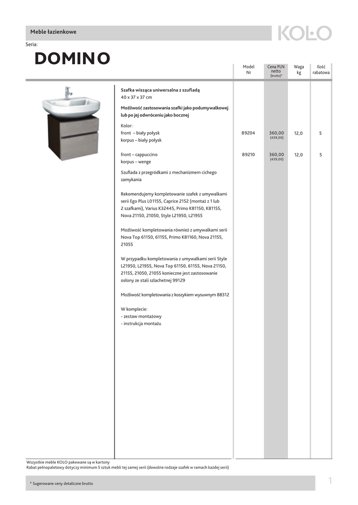 Meble łazienkowe Seria: DOMINO Model Nr Cena PLN netto Waga kg Ilość rabatowa (brutto)* Szafka wisząca uniwersalna z szufladą 40 x 37 x 37 cm Możliwość zastosowania szafki jako podumywalkowej lub po jej odwróceniu jako bocznej Kolor: front – biały połysk korpus – biały połysk front – cappuccino korpus – wenge 89204 360,00 12,0 5 89210 360,00 12,0 5 (439,00) (439,00) Szuflada z przegródkami z mechanizmem cichego zamykania Rekomendujemy kompletowanie szafek z umywalkami serii Ego Plus L01155, Caprice 2152 (montaż z 1 lub 2 szafkami), Varius K32445, Primo K81150, K81155, Nova 21150, 21050, Style L21950, L21955 Możliwość kompletowania również z umywalkami serii Nova Top 61150, 61155, Primo K81160, Nova 21155, 21055 W przypadku kompletowania z umywalkami serii Style L21950, L21955, Nova Top 61150, 61155, Nova 21150, 21155, 21050, 21055 konieczne jest zastosowanie osłony ze stali szlachetnej 99129 Możliwość kompletowania z koszykiem wysuwnym 88312 W komplecie: - zestaw montażowy - instrukcja montażu Wszystkie meble KOLO pakowane są w kartony Rabat pełnopaletowy dotyczy minimum 5 sztuk mebli tej samej serii (dowolne rodzaje szafek w ramach każdej serii) * Sugerowane ceny detaliczne brutto 1 Meble łazienkowe Seria: DOMINO Cena PLN netto Waga kg Ilość rabatowa 405,00 14,0 5 405,00 14,0 5 Model Nr (brutto)* Szafka wisząca uniwersalna z szufladą 50 x 37 x 37 cm Możliwość zastosowania szafki jako podumywalkowej lub po jej odwróceniu jako bocznej Kolor: front – biały połysk korpus – biały połysk front – cappuccino korpus – wenge 89205 89211 (494,00) (494,00) Szuflada z przegródkami z mechanizmem cichego zamykania Rekomendujemy kompletowanie szafek z umywalkami serii Ego Plus L01155, Varius K32445, K31160, K31161, Primo K81150, K81155, K81160, Nova 21150, 21050, 21160, 21060, 21165, Style L21955, L21960 Możliwość kompletowania również z umywalkami serii Style L21950, L21970, Nova Top 61150, 61155, 61165, Nova 21155, 21055 W przypadku kompletowania z umywalkami serii Varius K31160, K31161, Nova Top, Nova konieczne jest zastosowanie osłony ze stali szlachetnej 99130. Możliwość kompletowania z koszykiem wysuwnym 88312 W komplecie: - zestaw montażowy - instrukcja montażu Wszystkie meble KOLO pakowane są w kartony Rabat pełnopaletowy dotyczy minimum 5 sztuk mebli tej samej serii (dowolne rodzaje szafek w ramach każdej serii) 2 * Sugerowane ceny detaliczne brutto Meble łazienkowe Seria: DOMINO Model Nr Cena PLN netto Waga kg Ilość rabatowa (brutto)* Szafka wisząca uniwersalna z szufladą 60 x 37 x 37 cm Możliwość zastosowania szafki jako podumywalkowej lub po jej odwróceniu jako bocznej Kolor: front – biały połysk korpus – biały połysk front – cappuccino korpus – wenge 89206 432,00 17,0 5 89212 432,00 17,0 5 (527,00) (527,00) Szuflada z przegródkami z mechanizmem cichego zamykania Rekomendujemy kompletowanie szafek z umywalkami serii Ego Plus L01155, Varius K32445, Nova Top 61160, Primo K81150, K81155, K81160, Nova 21150, 21050, 21160, 21060, 21165, Style L21960, L21970 Możliwość kompletowania również z umywalkami serii Varius K31160, K31161, Nova Top 61150, 61155, 61165, Nova 21155, 21055, Style L21950, L21955 W przypadku kompletowania z umywalkami serii Varius K31160, K31161, Nova Top konieczne jest zastosowanie osłony ze stali szlachetnej 99130. Możliwość kompletowania z koszykiem wysuwnym 88312 W komplecie: - zestaw montażowy - instrukcja montażu Wszystkie meble KOLO pakowane są w kartony Rabat pełnopaletowy dotyczy minimum 5 sztuk mebli tej samej serii (dowolne rodzaje szafek w ramach każdej serii) * Sugerowane ceny detaliczne brutto 3 Meble łazienkowe Seria: DOMINO Cena PLN netto Waga kg Ilość rabatowa 495,00 20,0 5 495,00 20,0 5 Model Nr (brutto)* Szafka wisząca uniwersalna z szufladą 60 x 37 x 48,5 cm Możliwość zastosowania szafki jako podumywalkowej lub po jej odwróceniu jako bocznej Kolor: front – biały połysk korpus – biały połysk front – cappuccino korpus – wenge 89207 89213 (604,00) (604,00) Szuflada z przegródkami z mechanizmem cichego zamykania Rekomendujemy kompletowanie szafek z umywalkami serii Quattro K61460, Ego K11161, K11169, Varius K31170 Możliwość kompletowania również z umywalkami serii Ego Plus L01160, L01165, Varius K31160, K31161, Style L21950, L21955, L21960, L21970, Twins L51160, L51161 W przypadku kompletowania z umywalkami serii Varius i Twins konieczne jest zastosowanie osłony ze stali szlachetnej 99131 Możliwość kompletowania z koszykiem wysuwnym 88313 W komplecie: - zestaw montażowy - instrukcja montażu Wszystkie meble KOLO pakowane są w kartony Rabat pełnopaletowy dotyczy minimum 5 sztuk mebli tej samej serii (dowolne rodzaje szafek w ramach każdej serii) 4 * Sugerowane ceny detaliczne brutto Meble łazienkowe Seria: DOMINO Model Nr Cena PLN netto Waga kg Ilość rabatowa 315,00 9,0 5 315,00 9,0 5 315,00 9,0 5 315,00 9,0 5 (brutto)* Szafka wisząca uniwersalna z drzwiami, prawa 30 x 37 x 42 cm Możliwość zastosowania szafki jako podumywalkowej lub bocznej Kolor: front – biały połysk korpus – biały połysk front – cappuccino korpus – wenge 89208 89214 89209 89215 (384,00) (384,00) Drzwi z mechanizmem cichego zamykania Rekomendujemy kompletowanie szafek z umywalkami serii Quattro K61490, K61491 (montaż z 1 lub 2 szafkami), Ego Plus L01780, L01781, Varius K31780, K31781 Możliwość kompletowania również z umywalką serii Caprice 2132 W komplecie: - zestaw montażowy - instrukcja montażu Szafka wisząca uniwersalna z drzwiami, lewa 30 x 37 x 42 cm Możliwość zastosowania szafki jako podumywalkowej lub bocznej Kolor: front – biały połysk korpus – biały połysk front – cappuccino korpus – wenge (384,00) (384,00) Drzwi z mechanizmem cichego zamykania Rekomendujemy kompletowanie szafek z umywalkami serii Quattro K61490, K61491 (montaż z 1 lub 2 szafkami), Ego Plus L01780, L01781, Varius K31780, K31781 Możl