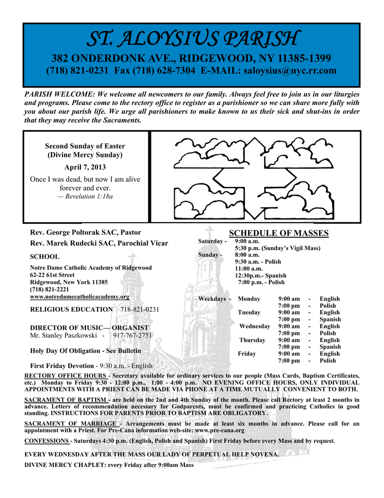 ST. ALOYSIUS PARISH 382 ONDERDONK AVE., RIDGEWOOD, NY 11385-1399 (718) 821-0231 Fax (718) 628-7304 E-MAIL: [email protected] PARISH WELCOME: We welcome all newcomers to our family. Always feel free to join us in our liturgies and programs. Please come to the rectory office to register as a parishioner so we can share more fully with you about our parish life. We urge all parishioners to make known to us their sick and shut-ins in order that they may receive the Sacraments. Second Sunday of Easter (Divine Mercy Sunday) April 7, 2013 Once I was dead, but now I am alive forever and ever. — Revelation 1:18a Rev. George Poltorak SAC, Pastor Rev. Marek Rudecki SAC, Parochial Vicar Saturday - SCHOOL Sunday - Notre Dame Catholic Academy of Ridgewood 62-22 61st Street Ridgewood, New York 11385 (718) 821-2221 www.notredamecatholicacademy.org Weekdays - RELIGIOUS EDUCATION 718-821-0231 DIRECTOR OF MUSIC— ORGANIST Mr. Stanley Paszkowski - 917-767-2751 Holy Day Of Obligation - See Bulletin First Friday Devotion - 9:30 a.m. - English SCHEDULE OF MASSES 9:00 a.m. 5:30 p.m. (Sunday’s Vigil Mass) 8:00 a.m. 9:30 a.m. - Polish 11:00 a.m. 12:30p.m.- Spanish 7:00 p.m. - Polish Monday Tuesday Wednesday Thursday Friday 9:00 am 7:00 pm 9:00 am 7:00 pm 9:00 am 7:00 pm 9:00 am 7:00 pm 9:00 am 7:00 pm - English Polish English Spanish English Polish English Spanish English Polish RECTORY OFFICE HOURS - Secretary available for ordinary services to our people (Mass Cards, Baptism Certificates, etc.) Monday to Friday 9:30 - 12:00 p.m., 1:00 - 4:00 p.m. NO EVENING OFFICE HOURS, ONLY INDIVIDUAL APPOINTMENTS WITH A PRIEST CAN BE MADE VIA PHONE AT A TIME MUTUALLY CONVENIENT TO BOTH. SACRAMENT OF BAPTISM - are held on the 2nd and 4th Sunday of the month. Please call Rectory at least 2 months in advance. Letters of recommendation necessary for Godparents, must be confirmed and practicing Catholics in good standing. INSTRUCTIONS FOR PARENTS PRIOR TO BAPTISM ARE OBLIGATORY. SACRAMENT OF MARRIAGE - Arrangements must be made at least six months in advance. Please call for an appointment with a Priest. For Pre-Cana information web-site: www.pre-cana.org CONFESSIONS - Saturdays 4:30 p.m. (English, Polish and Spanish) First Friday before every Mass and by request. EVERY WEDNESDAY AFTER THE MASS OUR LADY OF PERPETUAL HELP NOVENA. DIVINE MERCY CHAPLET: every Friday after 9:00am Mass PRAY FOR THE SICK Tony Iovino, Jo Trapani, Ignazia Paneduro, Anna Braccioforte, Maria Puma, Nella Elmi, Joseph Scarfo, Helen Bach, Salvador, Eliza Mae & Anecito Sorriano, Annmarie Minervini, Carmello Agosto, Justin Pappas, Marie Megiel, Nicolina Caietta, Angelo Tommolino, Ann Iovino, Baby Anthony Miquel Diaz , Maria Grill, Nina DiGiovanna, Frank Campanella, Dianne Saviano, Sherril Thrasher, Erlinda Roy and Emily Nobleza. SUNDAY–APRIL 7—SUNDAY OF DIVINE MERCY 8:00AM — OLIVIO MAGAGNA - Gabi and Family 9:30AM — DZIEKCZYNNA w 25 - Lecie małżeństwa MARIOLI i JANA 11:00AM — SALVATORE VARCA - Nela & Joe Margiotta 12:30PM — Accion de gracias a la DIVINA MISERICORDIA - De Willian Montesdeoca 7:00OM — KS. PRAŁAT ADAM SUDOŁ Please remember all the sick and homebound in your prayers. MONDAY – APRIL 8—THE ANNUNCIATION OF THE LORD TODAY’S READINGS First Reading — A large number of people gathered, bringing the sick, and all were cured (Acts 5:12-16). Psalm — Give thanks to the Lord for he is good, his love is everlasting (Psalm 118). Second Reading — Do not be afraid. I am the first and the last, the one who lives (Revelation 1:9-11a, 12-13, 17 -19). Gospel — The risen Christ comes to his disciples with peace and the Spirit. The absent Thomas doubts (John 20:19-31). 9:00AM – LENA D’ALESSANDRO - Kay 7:00PM – TADEUSZ GLINSKI TUESDAY – APRIL 9 9:00AM – CHARLES SIGNORELLI - Wife & Children 7:00PM – MATILDE MONTESUMA (1 año de fallecida) de Edith Herrera con Familia WEDNESDAY– APRIL 10 REFLECTION 9:00AM – ANNA STAUDER—Stauder Family 7:00PM – DANUTA TURCZYŃSKA Did you notice? Today is called the “Second Sunday of Easter,” not the “First Sunday after Easter.” Our celebration of Easter is not over. These Sundays of Easter continue to present the mystery of Jesus Christ’s victory. The readings begin with the “signs and wonders” abounding in those earliest days. Sick people lay in the street, hoping that at least Peter’s “shadow might fall on one or another of them.” Then, in a powerful passage from the book of Revelation, the visionary falls down “as though dead” upon seeing the victorious Christ. But Christ extends a gentle touch: “Do not be afraid . . . once I was dead, but now I am alive forever.” In the Gospel, that same Christ appears and breathes on the disciples, and gently leads Thomas to believe. This Christ— more powerful than any evil force, victorious over death itself— touches us and whispers, “Do not be afraid.” Copyright © J. S. Paluch Co. THURSDAY– APRIL 11—ST. STANISLAUS 9:00AM – RODOLFO G. ROY— Rosalinda M Roy 7:00PM – MIGUEL DeORVILLE — de hija Nidia FRIDAY— APRIL 12 9:00AM – GIUSEPPE GRIMALDI— Anna Gandolfo 7:00PM — FOR ALL THE PEOPLE OF THE PARISH SATURDAY— APRIL 13 9:00AM – KENNETH A LOWE JR. - Aunt Ruth 5:30PM — GIOVANNI MONREALE— Rosalia Monreale THANK YOU! DZIĘKUJĘ !GRACIAS !SALAMAT ! A Special Thank You to Everyone who came and made our Church sparkle and decorate for the Easter Celebration. SUNDAY–APRIL 14— THIRD SUNDAY OF EASTER 8:00AM — MILAGROS SERRANO - Husband Johnny Go 9:30AM — STANISŁAWA KOSIEC - Syn I Żona 11:00AM — LAMBERTO FLORES JR.— Al & Linda Dimatulac 12:30PM — SACARIA BELEZ Y ROBERTO VENTURA—de Familia Hidalgo 7:00OM — WŁADYSŁAWA i ALBERT SONNECK W 2 ROCZ. - A Heartfelt Thank You goes to our EucharisticMinisters, Lectors, our Ushers, Stanley our Music Director, who made Holy Week and Easter special in our Church. Annual Catholic Appeal 2013 The Sacramental Bread and Wine for the week of A