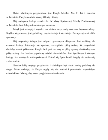 Moim ulubionym przyjacielem jest Patryk Mettler. Ma 11 lat i mieszka w Jarocinie. Patryk ma dwie siostry Oliwię i Zosię. Mój najlepszy kolega chodzi do IV klasy Społecznej Szkoły Podstawowej w Jarocinie. Jest dobrym i sumiennym uczniem. Patryk jest szczupły i wysoki, ma zielone oczy, mały nos oraz brązowe włosy. Szybko się porusza, jest gadatliwy, często żartuje i się śmieje. Zazwyczaj nosi ubiór sportowy. Mój wspaniały kolega jest miłym i grzecznym chłopcem. Jest ambitny, ale czasami leniwy. Interesuje się sportem, szczególnie piłką nożną. W przyszłości chciałby zostać piłkarzem. Patryk lubi grać ze mną w piłkę ręczną, siatkówkę oraz piłkę nożną. Jest bardzo popularny wśród rówieśników. Jest życzliwym i dobrym kolegą. Jest zdolny do wielu poświęceń. Potrafi się fajnie bawić i nigdy nie można się z nim nudzić. Bardzo lubię mojego przyjaciela i chciałbym być choć trochę podobny do niego. Mam nadzieję, że Patryk nigdy się nie zmieni i pozostanie wspaniałym człowiekiem. Marzę, aby nasza przyjaźń trwała wiecznie.