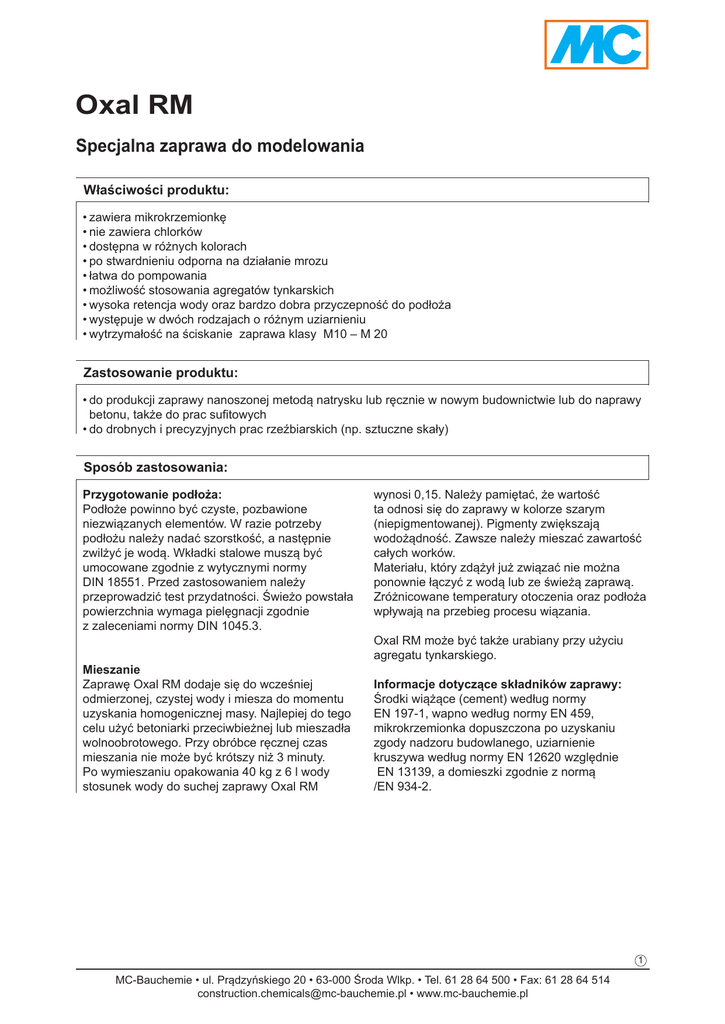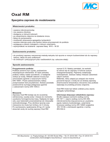 Oxal RM Specjalna zaprawa do modelowania Właściwości produktu: •zawiera mikrokrzemionkę •nie zawiera chlorków •dostępna w różnych kolorach •po stwardnieniu odporna na działanie mrozu •łatwa do pompowania •możliwość stosowania agregatów tynkarskich •wysoka retencja wody oraz bardzo dobra przyczepność do podłoża •występuje w dwóch rodzajach o różnym uziarnieniu •wytrzymałość na ściskanie zaprawa klasy M10 – M 20 Zastosowanie produktu: •do produkcji zaprawy nanoszonej metodą natrysku lub ręcznie w nowym budownictwie lub do naprawy betonu, także do prac sufitowych •do drobnych i precyzyjnych prac rzeźbiarskich (np. sztuczne skały) Sposób zastosowania: Przygotowanie podłoża: Podłoże powinno być czyste, pozbawione niezwiązanych elementów. W razie potrzeby podłożu należy nadać szorstkość, a następnie zwilżyć je wodą. Wkładki stalowe muszą być umocowane zgodnie z wytycznymi normy DIN 18551. Przed zastosowaniem należy przeprowadzić test przydatności. Świeżo powstała powierzchnia wymaga pielęgnacji zgodnie z zaleceniami normy DIN 1045.3. Mieszanie Zaprawę Oxal RM dodaje się do wcześniej odmierzonej, czystej wody i miesza do momentu uzyskania homogenicznej masy. Najlepiej do tego celu użyć betoniarki przeciwbieżnej lub mieszadła wolnoobrotowego. Przy obróbce ręcznej czas mieszania nie może być krótszy niż 3 minuty. Po wymieszaniu opakowania 40 kg z 6 l wody stosunek wody do suchej zaprawy Oxal RM wynosi 0,15. Należy pamiętać, że wartość ta odnosi się do zaprawy w kolorze szarym (niepigmentowanej). Pigmenty zwiększają wodożądność. Zawsze należy mieszać zawartość całych worków. Materiału, który zdążył już związać nie można ponownie łączyć z wodą lub ze świeżą zaprawą. Zróżnicowane temperatury otoczenia oraz podłoża wpływają na przebieg procesu wiązania. Oxal RM może być także urabiany przy użyciu agregatu tynkarskiego. Informacje dotyczące składników zaprawy: Środki wiążące (cement) według normy EN 197-1, wapno według normy EN 459, mikrokrzemionka dopuszczona po uzyskaniu zgody nadzoru budowlanego, uziarnienie kruszywa według normy EN 12620 względnie EN 13139, a domieszki zgodnie z normą /EN 934-2. 1 MC-Bauchemie • ul. Prądzyńskiego 20 • 63-000 Środa Wlkp. • Tel. 61 28 64 500 • Fax: 61 28 64 514 [email protected] • www.mc-bauchemie.pl Techniczne właściwości produktu Oxal RM: Parametr Jednostka miary Wartość Uwagi Typy produktu Oxal RM-L Oxal RM-H Uziarnienie mm 0-1,2 0-4 Proporcje mieszania l ok. 5-6 ok. 4,8-5,5 wody na 40 kg zaprawy Stosunek wody do suchej zaprawy * 0,14 – 0,15 0,12-0,13 Wydajność l ok. 22 ok. 22 na opakowanie 40 kg Klasy zaprawy M 10-15 M 20 Główny obszar zastosowania drobne prace rzeźbiarskie (dekoracje) obciążone mechanicznie/statycznie sztuczne skały (skałki wspinaczkowe i na placu zabaw) °C ≥ + 5 - +30 Warunki obróbki - temperatura powietrza i podłoża (zróżnicowane temperatury wpływają na przebieg wiązania i twardnienie) Cechy produktu Oxal RM: Skład cement, wapno, mikrokrzemionka, mineralne materiały wypełniające Forma dostawy worek 40 kg 1 paleta (30 worków po 40 kg) Barwa szara, inne kolory na zamówienie Składowanie Składowanie 12 miesięcy w suchych miejscach w oryginalnie zamkniętych opakowaniach. Chronić przed mrozem! Usuwanie odpadów W trosce o środowisko naturalne opakowania należy dokładnie opróżniać. Dane odnośnie właściwości/jakości produktu bazują na doświadczeniach przeprowadzonych w laboratorium i w praktyce mogą się różnić. Aby ustalić, czy produkt nadaje się do zastosowania w konkretnym przypadku należy przeprowadzić próby wstępne/testy przydatności w podanych warunkach zastosowania. * podane wartości stosunku wody do suchej zaprawy odnoszą się do zaprawy w kolorze szarym (niepigmentowanej). Pigmenty zwiększają wodożądność. Uwaga! Wszelkie informacje zawarte w niniejszej karcie oparte są na naszym doświadczeniu i najlepszej wiedzy, jednakże nie mogą być traktowane jako prawnie wiążące. Należy bezwzględnie każdorazowo stosować się do prawodawstwa miejscowego, w zakresie przeznaczenia oraz zastosowania w obiektach budowlanych. Przy spełnieniu powyższych wymogów odpowiadamy za poprawność przekazanych informacji w ramach naszych Ogólnych Warunków Sprzedaży, Dostaw i Płatności. Wszelkie doradztwo ze strony naszych Współpracowników, odbiegające od treści naszych kart technicznych, jest wiążące jedynie w przypadku pisemnego ich potwierdzenia. W każdym przypadku należy stosować się do ogólnie obowiązujących zasad sztuki budowlanej. Wydanie 02/15. Niniejszy druk został zaktualizowany pod względem technicznym. Tym samym unieważnia się dotychczasowe wydania i nie wolno ich stosować. W przypadku wydania nowej karty, zaktualizowanej pod względem technicznym, niniejsze wydanie traci ważność. MC-Bauchemie • ul. Prądzyńskiego 20 • 63-000 Środa Wlkp. • Tel. 61 28 64 500 • Fax: 61 28 64 514 [email protected] • www.mc-bauchemie.pl 2