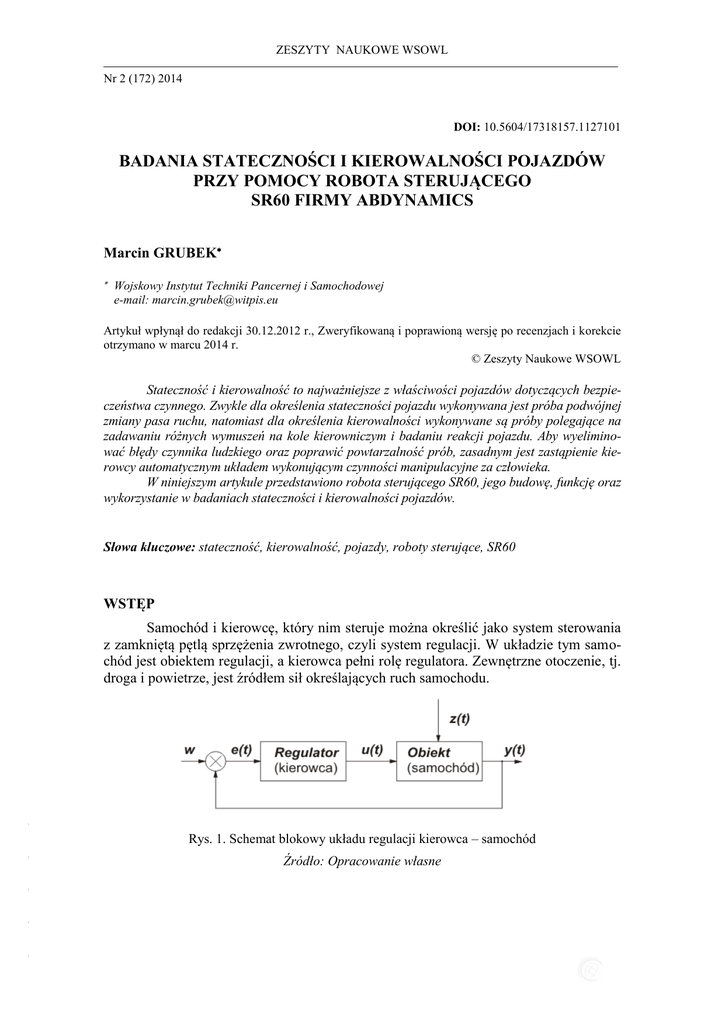 ZESZYTY NAUKOWE WSOWL Nr 2 (172) 2014 ISSN 1731-8157 DOI: 10.5604/17318157.1127101 BADANIA STATECZNOŚCI I KIEROWALNOŚCI POJAZDÓW PRZY POMOCY ROBOTA STERUJĄCEGO SR60 FIRMY ABDYNAMICS Marcin GRUBEK Wojskowy Instytut Techniki Pancernej i Samochodowej e-mail: [email protected] Artykuł wpłynął do redakcji 30.12.2012 r., Zweryfikowaną i poprawioną wersję po recenzjach i korekcie otrzymano w marcu 2014 r. © Zeszyty Naukowe WSOWL Stateczność i kierowalność to najważniejsze z właściwości pojazdów dotyczących bezpieczeństwa czynnego. Zwykle dla określenia stateczności pojazdu wykonywana jest próba podwójnej zmiany pasa ruchu, natomiast dla określenia kierowalności wykonywane są próby polegające na zadawaniu różnych wymuszeń na kole kierowniczym i badaniu reakcji pojazdu. Aby wyeliminować błędy czynnika ludzkiego oraz poprawić powtarzalność prób, zasadnym jest zastąpienie kierowcy automatycznym układem wykonującym czynności manipulacyjne za człowieka. W niniejszym artykule przedstawiono robota sterującego SR60, jego budowę, funkcję oraz wykorzystanie w badaniach stateczności i kierowalności pojazdów. Słowa kluczowe: stateczność, kierowalność, pojazdy, roboty sterujące, SR60 WSTĘP - Samochód i kierowcę, który nim steruje można określić jako system sterowania z zamkniętą pętlą sprzężenia zwrotnego, czyli system regulacji. W układzie tym samochód jest obiektem regulacji, a kierowca pełni rolę regulatora. Zewnętrzne otoczenie, tj. droga i powietrze, jest źródłem sił określających ruch samochodu. - - - - Rys. 1. Schemat blokowy układu regulacji kierowca – samochód Źródło: Opracowanie własne Marcin GRUBEK Jednak taki system, w którym człowiek jest regulatorem, niesie za sobą niski poziom dokładności i powtarzalności. W jednakowych warunkach różni kierowcy lub nawet ten sam kierowca, lecz w różnym stanie psychofizycznym, niejednakowo kierują samochodem. W ten sposób powstają rozbieżności między pożądanymi a rzeczywistymi parametrami ruchu, zależne od niedoskonałości kierowcy. Wyeliminowanie błędów człowieka wymaga zastosowania automatycznego systemu kierowania pojazdem. W Wojskowym Instytucie Techniki Pancernej i Samochodowej w tym celu wykorzystywany jest robot sterujący SR 60 firmy ABDynamics. 1. OPIS ROBOTA STEROWNICZEGO SR60 1.1. Budowa robota SR60 W budowie robota SR60 można wyróżnić cztery podstawowe układy składowe: układ zasilania; układ sterowania; układ ruchu; układ sensorów. Widok robota przedstawiono na rysunku 2. Schemat blokowy robota przedstawiono na rysunku 3. a) b) - Źródło: [1] - Rys. 2. Robot sterujący. a) system inercyjno satelitarny RT 3002, b) jednostka centralna, c) kierownica pomiarowa z kolumną ustalającą - - c) - 114 BADANIA STATECZNOŚCI I KIEROWALNOŚCI POJAZDÓW PRZY POMOCY ROBOTA … Rys. 3. Schemat blokowy robota sterującego SR60 Źródło: Opracowanie własne SR60 posiada budowę modułową. Układy zasilania, sterownia, sensorów oraz jednostka kinematyczna znajdują się w osobnych urządzeniach. Robot zasilany jest z akumulatora badanego pojazdu. Dodatkowo posiada wbudowany akumulator 12 V oraz przetworniki, które umożliwiają zasilenie pozostałych układów robota. Pracą robota steruje komputer o wysokiej mocy obliczeniowej. Niezawodność działania jednostki centralnej zapewnia zastosowany tu System Czasu Rzeczywistego. Układ ruchu, zadający wymuszenia na kole kierowniczym, to bezszczotkowy silnik prądu stałego o maksymalnym momencie 70 Nm, maksymalnej prędkości obrotu 2500°/s oraz rozdzielczości kątowej 0,00076°. Standardowo robot posiada sensory umożliwiające odczyt kąta obrotu kierownicy oraz momentu na kole kierowniczym. W takiej konfiguracji urządzenie nie otrzymuje informacji o stanie pojazdu, co pozwala jedynie na sterowanie pojazdem w otwartej pętli sprzężenia zwrotnego. Stosując nawigację inercyjno-satelitarną RT 3002 firmy OXTS robot jest w stanie sterować pojazdem w układzie z zamkniętą pętlą sprzężenia zwrotnego. 1.2 Metody programowania W metodzie „Play-back” urządzenie jest uczone przez kierowcę sekwencji ruchów, które ma wykonać. Układ sterowania zapamiętuje co ok. 20 ms kolejne kąty obrotów i prędkości, z jakimi są wykonywane. Po przejściu do normalnego trybu pracy robot odtwarza zaprogramowane wymuszenie na kole kierowniczym. - - - - Programowanie robota SR60 może odbywać się na trzy sposoby: Play-back; Off-line: Teach-in; Wbudowane makra. - 115 Marcin GRUBEK Podczas programowania „Teach-in” operator wytycza ścieżkę, po której ma poruszać się sterowany przez robota pojazd. W interaktywnym oprogramowaniu operator buduje trasę składającą się z odcinków, łuków, okręgów oraz innych kształtów. Jednostka sterująca robota przetwarza punkty ścieżki na współrzędne GPS, a następnie tak steruje ruchem kierownicy, aby poruszający się pojazd możliwie jak najdokładniej przebył zaprogramowaną trasę. Oprogramowanie operatora umożliwia skorzystanie z biblioteki standardowych wymuszeń, np. wymuszenia okresowe, tj. przebieg sinusoidalny, trójkątny, prostokątny oraz inne. Operator, wybierając dane wymuszenie, ma możliwość modyfikowania go poprzez określanie takich parametrów, jak: amplituda, częstotliwość, ilość okresów, czasów narastania i opadania oraz opóźnień. 1.3. Dokładność i powtarzalność Bardzo istotnymi parametrami opisującymi manipulatory i roboty są dokładność i powtarzalność. Z definicji dokładność manipulatora określa jak blisko manipulator może dojść do zadanego punktu w przestrzeni roboczej. Powtarzalność jest wielkością określającą jak blisko manipulator może dojść do pozycji uprzednio osiągniętej. W przypadku robota SR60 dokładnością możemy nazwać stopień zgodności między zaprogramowanym przebiegiem wymuszenia na kole kierowniczym a rzeczywistym przebiegiem wymuszenia. Powtar