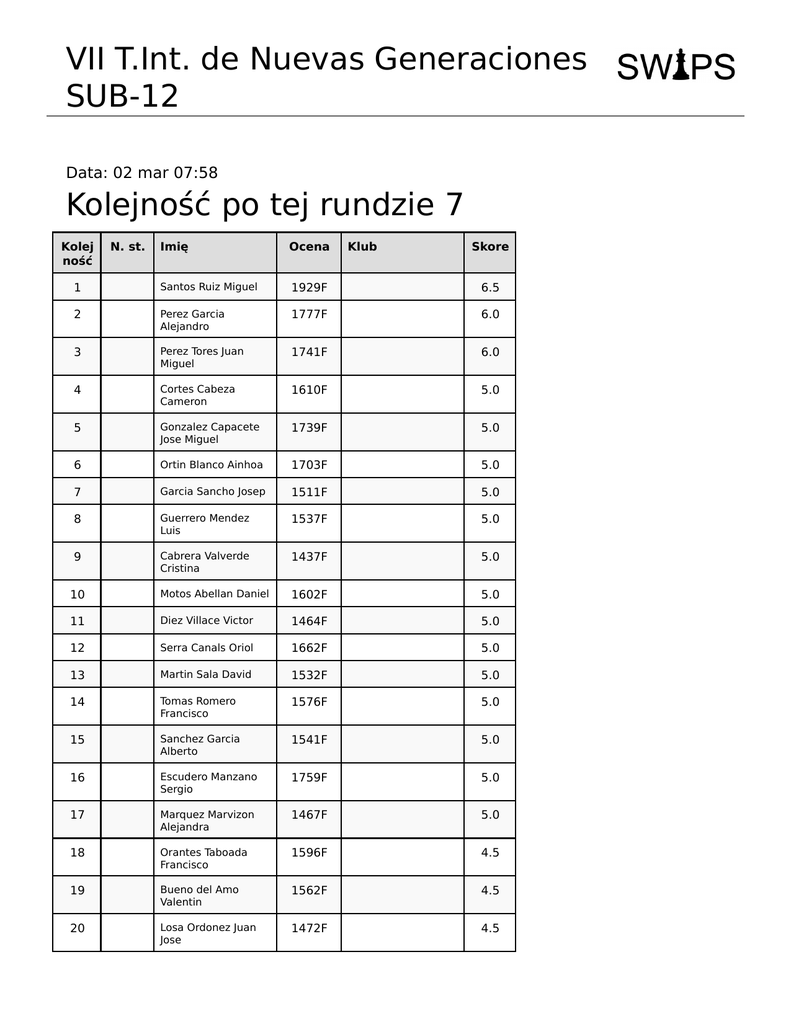 VII T.Int. de Nuevas Generaciones SUB-12 Data: 02 mar 07:58 Kolejność po tej rundzie 7 Kolej ność N. st. Imię Ocena Klub Skore 1 Santos Ruiz Miguel 1929F 6.5 2 Perez Garcia Alejandro 1777F 6.0 3 Perez Tores Juan Miguel 1741F 6.0 4 Cortes Cabeza Cameron 1610F 5.0 5 Gonzalez Capacete Jose Miguel 1739F 5.0 6 Ortin Blanco Ainhoa 1703F 5.0 7 Garcia Sancho Josep 1511F 5.0 8 Guerrero Mendez Luis 1537F 5.0 9 Cabrera Valverde Cristina 1437F 5.0 10 Motos Abellan Daniel 1602F 5.0 11 Diez Villace Victor 1464F 5.0 12 Serra Canals Oriol 1662F 5.0 13 Martin Sala David 1532F 5.0 14 Tomas Romero Francisco 1576F 5.0 15 Sanchez Garcia Alberto 1541F 5.0 16 Escudero Manzano Sergio 1759F 5.0 17 Marquez Marvizon Alejandra 1467F 5.0 18 Orantes Taboada Francisco 1596F 4.5 19 Bueno del Amo Valentin 1562F 4.5 20 Losa Ordonez Juan Jose 1472F 4.5 Kolej ność N. st. Imię Ocena Klub Skore 21 Porlan Minarro Antonio 1488F 4.5 22 Pelyushenko Anton 1687F 4.5 23 Aledo Yanguas Javier 1707F 4.5 24 Zapata Caparros Sergio 1676F 4.5 25 Ortin Blanco Inigo 1578F 4.5 26 Martinez Bernardo Aitor 0 4.0 27 Gonzalvez Tamarit Ivan 1594F 4.0 28 Herreros Ruiz Jorge Alejandro 1419F 4.0 29 Guerrero Mendez Jesus 1284F 4.0 30 Perez Gisbert Santiago 1527F 4.0 31 Gomez Sanjuan Hector Fernando 1541F 4.0 32 Lledo Moll Carles 0 4.0 33 Lucas Leon Angel 0 4.0 34 Alcaraz Moreno Sergio 1645F 4.0 35 Trigueros Lorca Irene 0 4.0 36 Martin Cabrerizo Francisco Davi 1510F 4.0 37 Martin Perez Pau 1565F 4.0 38 Tamaral Fernandez Miguel 0 4.0 39 Lacruz Algarate Alvaro 0 3.5 40 Rodriguez Garcia Miguel 1330F 3.5 41 Bou Belda Jaume 1448F 3.5 42 Romero Cruz Juan 1478F 3.5 43 Martinez Fernandez Adrian 0 3.5 44 Perez Roales Miguel 0 3.5 45 Aledo Yanguas David 1410F 3.5 46 Marquez Marvizon Ana 0 3.5 47 Nicolas Zapata Gines 1364F 3.5 Kolej ność N. st. Imię Ocena Klub Skore 48 Garcia Acosta Carla 1415F 3.5 49 Estefano Rilova Fernando 0 3.5 50 Villacorta Nicolas David 0 3.5 51 Galiana Fernandez Adrian 1460F 3.5 52 Quinonero Padilla Maria 1381F 3.5 53 Noblejas Carreto Victor 0 3.0 54 Martinez Robles Pablo Javier 0 3.0 55 Mallol Descarrega Gerard 0 3.0 56 Espinosa Edo Marc 0 3.0 57 Salleras Mercader Josep M. 0 3.0 58 Garcia Alvarez Paula 0 3.0 59 Vazquez Teodoro Alex 0 3.0 60 Cabrera Valverde Jose David 1552F 3.0 61 De La Pena Garcia Blanca 1472F 3.0 62 Alcaniz Perez Javier 1467F 3.0 63 Serra Ujaldon Pau 1430F 3.0 64 Navas Cervera Anabel 1433F 2.5 65 Navarro Rico Lluis 0 2.5 66 Redondo Benavente Ana 1444F 2.5 67 Perez Fonolleras Oliver 0 2.5 68 Jijon Yampuezan Germania 0 2.5 69 Pujante Martinez Rafael 0 2.5 70 Beltran Quiles Andreu 0 2.5 71 Navas Cervera Eduardo 0 2.0 72 Leiva Lazaro Miranda 0 2.0 Kolej ność N. st. Imię Ocena Klub Skore 73 Torrijos Garcia Borja 0 2.0 74 Monteblanco Pinero Raul Santiag 0 2.0 75 Lopez Garcia Maria Pilar 0 2.0 76 Gonzalvez Tamarit Ruben 1400F 2.0 77 Oropesa Serrano Manuel 0 2.0 78 Valdezate Garcia Diana 0 2.0 79 Barbera Espi Laura 0 2.0 80 Espinosa Cancino Monica 1524F 2.0 81 Pujo Velez David 0 1.5 82 Castillo Martinez Aran 0 1.0 83 Bou Belda Oscar 0 1.0 84 Barkov Naglia Ilya 0 1.0 85 Cribilles Perez Maria 0 1.0 86 Ramos Gonzalez Javier 0 1.0 87 De Torres Lopez Ruben 1345F 1.0 88 Yoldi Azcona Alicia 0 1.0 89 Martinez Yakovlev Alejandro 0 0.5 90 Lopez Navarro Jorge 0 0.5 91 Ferraro Martinez Carlo 0 0.5 92 Espinosa Sivera Joel Josep 0 0.0 93 Bueno del Amo Enrique 0 0.0 94 Cano Lopez Marcos 0 0.0 Created by www.swips.eu