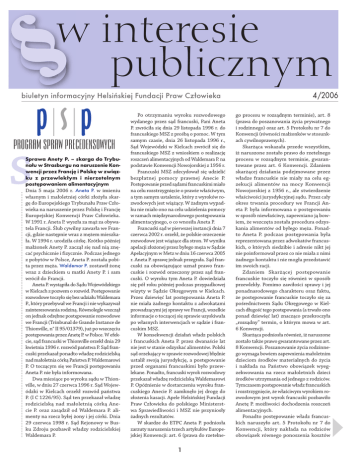 w interesie publicznym biuletyn informacyjny Helsińskiej Fundacji Praw Człowieka S Sprawa Anety P. – skarga do Trybunału w Strasburgu na naruszenie Konwencji przez Francję i Polskę w związku z przewlekłym i nierzetelnym postępowaniem alimentacyjnym Dnia 5 maja 2006 r. Aneta P. w imieniu własnym i małoletniej córki złożyła skargę do Europejskiego Trybunału Praw Człowieka na naruszenie przez Polskę i Francję Europejskiej Konwencji Praw Człowieka. W 1991 r. Aneta P. wyszła za mąż za obywatela Francji. Ślub cywilny zawarła we Francji, gdzie następnie wraz z mężem mieszkała. W 1994 r. urodziła córkę. Krótko później małżonek Anety P. zaczął się nad nią znęcać psychicznie i fizycznie. Podczas jednego z pobytów w Polsce, Aneta P. została pobita przez męża. Waldemar P. zostawił żonę wraz z dzieckiem u matki Anety P. i sam wrócił do Francji. Aneta P. wystąpiła do Sądu Wojewódzkiego w Kielcach z pozwem o rozwód. Postępowanie rozwodowe toczyło się bez udziału Waldemara P., który przebywał we Francji i nie wykazywał zainteresowania rodziną. Równolegle wszczął on jednak odrębne postępowanie rozwodowe we Francji (Trinbunal de Grande Instance de Thionville, n° II 95/01379), już po wszczęciu postępowania przez Anetę P. w Polsce. W efekcie, sąd francuski w Thionville orzekł dnia 29 kwietnia 1996 r. rozwód państwa P. Sąd francuski przekazał ponadto władzę rodzicielską nad małoletnia córką Państwa P. Waldemarowi P. O toczącym się we Francji postępowaniu Aneta P. nie była informowana. Dwa miesiące po wyroku sądu w Thionville, w dniu 27 czerwca 1996 r. Sąd Wojewódzki w Kielcach orzekł rozwód państwa P. (I C 1226/95). Sąd ten przekazał władzę rodzicielską nad małoletnią córką Anecie P. oraz zasądził od Waldemara P. alimenty na rzecz byłej żony i jej córki. Dnia 29 czerwca 1998 r. Sąd Rejonowy w Busku Zdroju pozbawił władzy rodzicielskiej Waldemara P. Po otrzymaniu wyroku rozwodowego wydanego przez sąd francuski, Pani Aneta P. zwróciła się dnia 29 listopada 1996 r. do francuskiego MSZ z prośbą o pomoc. W tym samym czasie, dnia 26 listopada 1996 r., Sąd Wojewódzki w Kielcach zwrócił się do francuskiego MSZ z wnioskiem o realizację roszczeń alimentacyjnych od Waldemara P. na podstawie Konwencji Nowojorskiej z 1956 r. Francuski MSZ zdecydował się udzielić bezpłatnej pomocy prawnej Anecie P. Postępowanie przed sądami francuskimi miało na celu rozstrzygnięcie o prawie właściwym, a tym samym ustalenie, który z wyroków rozwodowych jest wiążący. W żadnym wypadku nie miało ono na celu udzielenia pomocy w ramach międzynarodowego postępowania alimentacyjnego, o co wnosiła Aneta P. Francuski sąd w pierwszej instancji dnia 7 czerwca 2002 r. orzekł, że polskie orzeczenie rozwodowe jest wiążące dla stron. W wyniku apelacji złożonej przez byłego męża w Sądzie Apelacyjnym w Metz w dniu 16 czerwca 2005 r. Aneta P. sprawę jednak przegrała. Sąd francuski za obowiązujące uznał prawo francuskie i rozwód orzeczony przez sąd francuski. O wyroku tym Aneta P. dowiedziała się pół roku później podczas przypadkowej wizyty w Sądzie Okręgowym w Kielcach. Przez dziewięć lat postępowania Aneta P. nie miała żadnego kontaktu z adwokatami prowadzącymi jej sprawy we Francji, wszelkie informacje o toczącej się sprawie uzyskiwała po własnych interwencjach w sądzie i francuskim MSZ. W konsekwencji działań władz polskich i francuskich Aneta P. przez dwanaście lat nie jest w stanie odzyskać alimentów. Polski sąd orzekający w sprawie rozwodowej błędnie ustalił swoją jurysdykcję, a postępowanie przed organami francuskimi było przewlekane. Ponadto, francuski wyrok rozwodowy przekazał władzę rodzicielską Waldemarowi P. Opóźnienie w dostarczeniu wyroku francuskiego Anecie P. zamknęło jej drogę do złożenia kasacji. Apele Helsińskiej Fundacji Praw Człowieka do polskiego Ministerstwa Sprawiedliwości i MSZ nie przyniosły żadnych rezultatów. W skardze do ETPC Aneta P. podniosła zarzuty naruszenia trzech artykułów Europejskiej Konwencji: art. 6 (prawa do rzetelne- 1 4/2006 go procesu w rozsądnym terminie), art. 8 (prawa do poszanowania życia prywatnego i rodzinnego) oraz art. 5 Protokołu nr 7 do Konwencji (równości małżonków w stosunkach cywilnoprawnych). Skarżąca wskazała przede wszystkim, iż naruszone zostało prawo do rzetelnego procesu w rozsądnym terminie, gwarantowane przez art. 6 Konwencji. Zdaniem skarżącej działania podejmowane przez władze francuskie nie miały na celu egzekucji alimentów na mocy Konwencji Nowojorskiej z 1956 r., ale stwierdzenie właściwości jurysdykcyjnej sądu. Przez cały okres trwania procedury we Francji Aneta P. była informowana o postępowaniu w sposób niewłaściwy, zapewniano ją bowiem, że wszczęta została procedura odzyskania alimentów od byłego męża. Ponadto Aneta P. podczas postępowania była reprezentowana przez adwokatów francuskich, o których siedzibie i adresie nikt jej nie poinformował przez co nie miała z nimi żadnego kontaktu i nie mogła przedstawić im swoich racji. Zdaniem Skarżącej postępowanie francuskie toczyło się również w sposób przewlekły. Pomimo zawiłości sprawy i jej ponadnarodowego charakteru oraz faktu, że postępowanie francuskie toczyło się za pośrednictwem Sądu Okręgowego w Kielcach długość tego postępowania (a trwało ono ponad dziewięć lat) znacząco przekroczyła „rozsądny” termin, o którym mowa w art. 6 Konwencji. Skarżąca podniosła również, iż naruszone zostało także prawo gwarantowane przez art. 8 Konwencji. Poszanowanie życia rodzinnego wymaga bowiem zapewnienia małoletnim dzieciom środków materialnych do życia i nakłada na Państwo obowiązek wyegzekwowania na rzecz małoletnich dzieci środków utrzymania od jednego z rodziców. Tymczasem postępowanie władz francuskich i rozstrzygnięcie, ż
