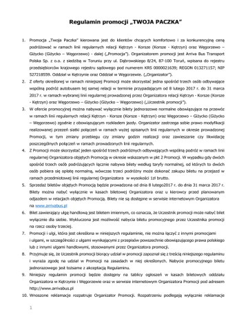 Regulamin promocji „TWOJA PACZKA” 1. Promocja „Twoja Paczka” kierowana jest do klientów chcących komfortowo i za konkurencyjną ceną podróżować w ramach linii regularnych relacji Kętrzyn - Korsze (Korsze - Kętrzyn) oraz Węgorzewo – Giżycko (Giżycko – Węgorzewo) - dalej („Promocja”). Organizatorem promocji jest Arriva Bus Transport Polska Sp. z o.o. z siedzibą w Toruniu przy ul. Dąbrowskiego 8/24, 87-100 Toruń, wpisana do rejestru przedsiębiorców krajowego rejestru sądowego pod numerem KRS 0000021639; REGON 013271157; NIP 527218559. Oddział w Kętrzynie oraz Oddział w Węgorzewie. („Organizator”). 2. Z oferty określonej w ramach niniejszej Promocji może skorzystać jedna spośród trzech osób odbywające wspólną podróż autobusem tej samej relacji w terminie przypadającym od 8 lutego 2017 r. do 31 marca 2017 r. w ramach wybranej linii regularnej prowadzonej przez Organizatora relacji Kętrzyn - Korsze (Korsze - Kętrzyn) oraz Węgorzewo – Giżycko (Giżycko – Węgorzewo) („Uczestnik promocji”). 3. W ofercie promocyjnej można nabywać wyłącznie bilety jednorazowe normalne obowiązujące na przewóz w ramach linii regularnych relacji Kętrzyn - Korsze (Korsze - Kętrzyn) oraz Węgorzewo – Giżycko (Giżycko – Węgorzewo) zgodnie z obowiązującym rozkładem jazdy. Organizator zastrzega sobie prawo modyfikacji realizowanej przezeń siatki połączeń w ramach wyżej opisanych linii regularnych w okresie prowadzonej Promocji, w tym zmiany przebiegu czy zmiany godzin realizacji oraz zawieszanie czy likwidację poszczególnych połączeń w ramach prowadzonych linii regularnych. 4. Z Promocji może skorzystać jeden spośród trzech podróżnych odbywających wspólną podróż w ramach linii regularnej Organizatora objętych Promocją w okresie wskazanym w pkt 2 Promocji. W wypadku gdy dwóch spośród trzech osób podróżujących łącznie nabywa bilety według taryfy normalnej, od których to dwóch osób pobiera się opłatę normalną, wówczas trzeci podróżny może dokonać zakupu biletu na przejazd w ramach przedmiotowej linii regularnej Organizatora w wysokości 1zł brutto. 5. Sprzedaż biletów objętych Promocją będzie prowadzona od dnia 8 lutego2017 r. do dnia 31 marca 2017 r. Bilety można nabyć wyłącznie w kasach biletowej Organizatora oraz u kierowcy przed planowanym odjazdem w relacjach objętych Promocją. Bilety nie są dostępne w serwisie internetowym Organizatora na www.arrivabus.pl 6. Bilet zawierający ulgę handlową jest biletem imiennym, co oznacza, że Uczestnik promocji może nabyć bilet wyłącznie dla siebie. Wykluczona jest możliwość nabycia biletu promocyjnego przez Uczestnika promocji na rzecz osoby trzeciej. 7. Promocji i ulgi, która jest określona w niniejszych regulaminie, nie można łączyć z innymi promocjami i ulgami, w szczególności z ulgami wynikającymi z przepisów powszechnie obowiązującego prawa polskiego lub z innymi ulgami handlowymi, stosowanymi przez Organizatora promocji. 8. Przyjmuje się, że Uczestnik promocji biorący udział w promocji zapoznał się z treścią niniejszego regulaminu i wyraża zgodę na udział w Promocji na zasadach w niej określonych. Nabycie promocyjnego biletu jednorazowego jest tożsame z akceptacją Regulaminu. 9. Niniejszy regulamin promocji będzie dostępny na tablicy ogłoszeń w kasach biletowych oddziału Organizatora w Kętrzynie i Węgorzewie oraz w serwisie internetowym Organizatora Promocji pod adresem http://www.arrivabus.pl 10. Wnoszone reklamacje rozpatruje Organizator Promocji. Rozpatrzeniu podlegają wyłącznie reklamacje 1 zgłoszone w formie pisemnej na adres oddziału Organizatora Promocji (Arriva Bus Transport Sp. z o.o. w Toruniu Oddział w Kętrzynie ul. Bydgoska 24, 11-400 Kętrzyn oraz Arriva Bus Transport Sp. z o.o. w Toruniu Oddział w Węgorzewie ul. Sienkiewicza 2, 11-600 Węgorzewo). Pisemna reklamacja powinna zawierać minimum: imię, nazwisko, dokładny adres Uczestnika Promocji, opis i wskazanie przyczyn reklamacji. 11. Reklamacje rozpatrywane są w terminie 14 dni od daty ich zgłoszenia. W przypadku, gdy reklamacja wymaga uzupełnienia termin na jej rozpatrzenie zaczyna bieg od daty jej prawidłowego uzupełnienia. 12. Organizator Promocji może odmówić rozpatrzenia reklamacji wniesionej po upływie 30 dni od daty zakupu jednorazowego biletu promocyjnego. 13. Prawa i obowiązki Organizatora Promocji i Uczestników promocji określone są wyłącznie w niniejszym regulaminie oraz we właściwych przepisach obowiązującego prawa. Wszelkie informacje dostępne w materiałach reklamowych mają jedynie charakter informacyjny. 14. Organizator Promocji zastrzega sobie prawo do zmiany treści regulaminu, w tym przedłużenia okresu trwania Promocji. Informacja o zmianie Regulaminu każdorazowo będzie zamieszczana zgodnie z pkt. 10. 2