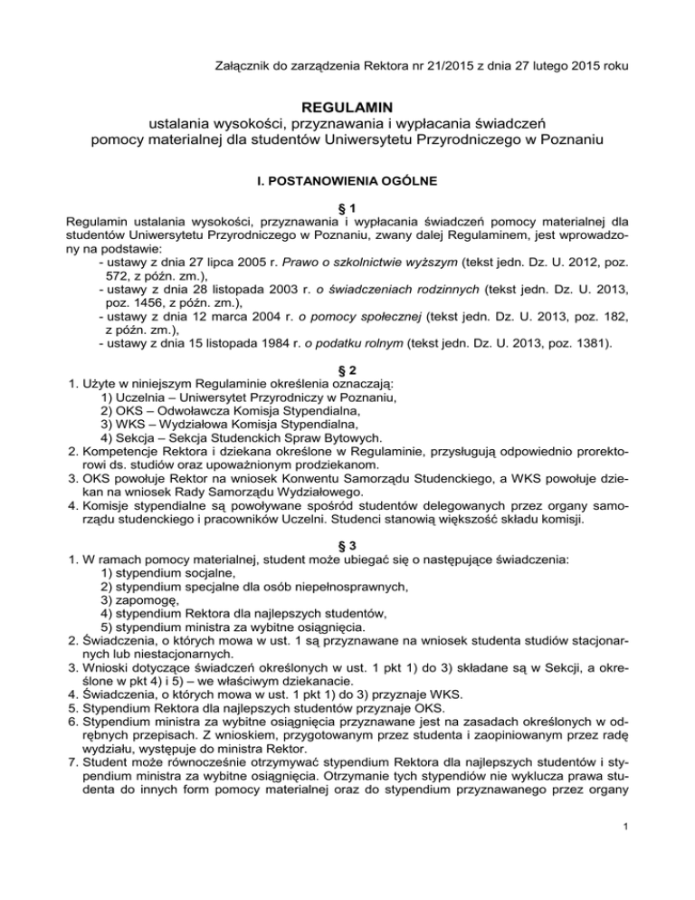 Załącznik do zarządzenia Rektora nr 21/2015 z dnia 27 lutego 2015 roku REGULAMIN ustalania wysokości, przyznawania i wypłacania świadczeń pomocy materialnej dla studentów Uniwersytetu Przyrodniczego w Poznaniu I. POSTANOWIENIA OGÓLNE §1 Regulamin ustalania wysokości, przyznawania i wypłacania świadczeń pomocy materialnej dla studentów Uniwersytetu Przyrodniczego w Poznaniu, zwany dalej Regulaminem, jest wprowadzony na podstawie: - ustawy z dnia 27 lipca 2005 r. Prawo o szkolnictwie wyŜszym (tekst jedn. Dz. U. 2012, poz. 572, z późn. zm.), - ustawy z dnia 28 listopada 2003 r. o świadczeniach rodzinnych (tekst jedn. Dz. U. 2013, poz. 1456, z późn. zm.), - ustawy z dnia 12 marca 2004 r. o pomocy społecznej (tekst jedn. Dz. U. 2013, poz. 182, z późn. zm.), - ustawy z dnia 15 listopada 1984 r. o podatku rolnym (tekst jedn. Dz. U. 2013, poz. 1381). §2 1. UŜyte w niniejszym Regulaminie określenia oznaczają: 1) Uczelnia – Uniwersytet Przyrodniczy w Poznaniu, 2) OKS – Odwoławcza Komisja Stypendialna, 3) WKS – Wydziałowa Komisja Stypendialna, 4) Sekcja – Sekcja Studenckich Spraw Bytowych. 2. Kompetencje Rektora i dziekana określone w Regulaminie, przysługują odpowiednio prorektorowi ds. studiów oraz upowaŜnionym prodziekanom. 3. OKS powołuje Rektor na wniosek Konwentu Samorządu Studenckiego, a WKS powołuje dziekan na wniosek Rady Samorządu Wydziałowego. 4. Komisje stypendialne są powoływane spośród studentów delegowanych przez organy samorządu studenckiego i pracowników Uczelni. Studenci stanowią większość składu komisji. §3 1. W ramach pomocy materialnej, student moŜe ubiegać się o następujące świadczenia: 1) stypendium socjalne, 2) stypendium specjalne dla osób niepełnosprawnych, 3) zapomogę, 4) stypendium Rektora dla najlepszych studentów, 5) stypendium ministra za wybitne osiągnięcia. 2. Świadczenia, o których mowa w ust. 1 są przyznawane na wniosek studenta studiów stacjonarnych lub niestacjonarnych. 3. Wnioski dotyczące świadczeń określonych w ust. 1 pkt 1) do 3) składane są w Sekcji, a określone w pkt 4) i 5) – we właściwym dziekanacie. 4. Świadczenia, o których mowa w ust. 1 pkt 1) do 3) przyznaje WKS. 5. Stypendium Rektora dla najlepszych studentów przyznaje OKS. 6. Stypendium ministra za wybitne osiągnięcia przyznawane jest na zasadach określonych w odrębnych przepisach. Z wnioskiem, przygotowanym przez studenta i zaopiniowanym przez radę wydziału, występuje do ministra Rektor. 7. Student moŜe równocześnie otrzymywać stypendium Rektora dla najlepszych studentów i stypendium ministra za wybitne osiągnięcia. Otrzymanie tych stypendiów nie wyklucza prawa studenta do innych form pomocy materialnej oraz do stypendium przyznawanego przez organy 1 samorządu terytorialnego oraz pracodawców, a takŜe pochodzących za środków funduszy strukturalnych Unii Europejskiej. §4 1. Stypendium socjalne przyznawane jest na rok akademicki. 2. Stypendium specjalne dla osób niepełnosprawnych przyznawane jest na okres waŜności orzeczenia potwierdzającego niepełnosprawność, nie dłuŜej niŜ na dany rok akademicki. 3. Zapomoga, która jest świadczeniem jednorazowym, moŜe być przyznana studentowi nie częściej niŜ 2 razy w roku akademickim. 4. Stypendium Rektora dla najlepszych studentów przyznawane jest na rok akademicki, z wyjątkiem przypadku, gdy ostatni lub pierwszy rok studiów, zgodnie z planem trwają jeden semestr. §5 1. Świadczenia pomocy materialnej przyznawane na okres roku akademickiego wypłacane są comiesięcznie od października do czerwca. 2. W sytuacji, gdy na koncie funduszu pomocy materialnej wystąpi nadwyŜka, Rektor moŜe zdecydować o dodatkowej wypłacie stypendium. 3. Świadczenia pomocy materialnej przekazywane są na konto bankowe studenta. §6 1. Wysokość świadczeń wymienionych w § 3 ust. 1 zaleŜy od wysokości funduszu pomocy materialnej dla studentów i doktorantów, w tym dotacji z budŜetu państwa. 2. Podziału dotacji z budŜetu państwa oraz ustalenie wysokości świadczeń wymienionych w § 3 ust. 1 pkt 1) do 4) dokonuje Rektor w porozumieniu z Konwentem Samorządu Studenckiego i uczelnianym organem samorządu doktorantów. 3. Łączna miesięczna wysokość stypendium socjalnego i stypendium Rektora dla najlepszych studentów nie moŜe być większa niŜ 90% najniŜszego wynagrodzenia zasadniczego asystenta ustalonego w przepisach o wynagradzaniu nauczycieli akademickich. §7 1. Student, studiujący jednocześnie na więcej niŜ jednym kierunku (takŜe w róŜnych uczelniach), moŜe otrzymać świadczenia o których mowa w § 3 ust. 1 tylko na jednym, wskazanym przez siebie kierunku studiów. W trakcie roku akademickiego, wyklucza się moŜliwość zmiany kierunku, na którym student ubiega się o świadczenia. 2. Studentowi, który po ukończeniu jednego kierunku studiów kontynuuje naukę na drugim kierunku, nie przysługują świadczenia, o których mowa w § 3 ust. 1, chyba Ŝe kontynuuje on studia po ukończeniu studiów pierwszego stopnia w celu uzyskania tytułu zawodowego magistra lub równorzędnego, jednakŜe nie dłuŜej niŜ przez okres 6 semestrów. 3. Studentowi, który kontynuuje naukę na innej specjalności tego samego kierunku, takŜe nie przysługuje pomoc materialna. 4. Student jest zobowiązany do złoŜenia oświadczenia o niepobieraniu świadczeń pomocy materialnej na więcej niŜ jednym kierunku. 5. Student traci prawo do świadczeń, o których mowa w § 3 ust. 1 pkt 1 – 4, ostatniego dnia miesiąca, w którym ukończył studia lub został skreślony z listy studentów lub został zawieszony w prawach studenta na skutek orzeczenia Komisji Dyscyplinarnej. 6. Student skierowany na studia do innej uczelni w kraju lub zagranicą (np. MostAR, Erasmus), nie traci uprawnień do otrzymywania świadczenia pomocy materialnej. II. STYPENDIUM SOCJALNE §8 1. Stypendium socjalne ma prawo otrzymać student znajdujący się w trudn