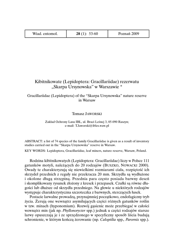 Wiad. entomol. 28 (1): 53-60 Poznań 2009 Kibitnikowate (Lepidoptera: Gracillariidae) rezerwatu „Skarpa Ursynowska” w Warszawie * Gracillariidae (Lepidoptera) of the “Skarpa Ursynowska” nature reserve in Warsaw Tomasz JAWORSKI Zakład Ochrony Lasu IBL, ul. Braci Leśnej 3, 05-090 Raszyn; e-mail: [email protected] ABSTRACT: a list of 74 species of the family Gracillariidae is given as a result of inventory studies carried out in the “Skarpa Ursynowska” reserve in Warsaw. KEY WORDS: Lepidoptera, Gracillariidae, leaf miners, nature reserve, Warsaw, Poland. Rodzina kibitnikowatych (Lepidoptera: Gracillariidae) liczy w Polsce 111 gatunków motyli, należących do 20 rodzajów (B USZKO, NOWACKI 2000). Owady te charakteryzują się niewielkimi rozmiarami ciała, rozpiętość ich skrzydeł przednich z reguły nie przekracza 20 mm. Skrzydła są wydłużone i okolone długą strzępiną. Przednia para często posiada barwny deseń i skomplikowany rysunek złożony z kresek i przepasek. Czułki są równe długości lub dłuższe od skrzydła przedniego. Na głowie u niektórych rodzajów występuje charakterystyczna szczoteczka z barwnych, sterczących łusek. Postacie larwalne prowadzą, przynajmniej początkowo, endofagiczny tryb życia. Żerują one wewnątrz asymilujących części różnych gatunków roślin w tzw. minach (hyponomium). Rozwój gąsienic może przebiegać w całości wewnątrz min (jak np. Phyllonorycter spp.) jednak u części rodzajów starsze larwy opuszczają je i ze sprzędzonego w specyficzny sposób liścia budują schronienie, w którym kończą żerowanie (np. Caloptilia spp., Parornix spp.). 54 T. JAWORSKI Przepoczwarczenie może mieć miejsce wewnątrz miny, w miejscu żerowania w sprzędzonym liściu, na jego powierzchni lub pod zagiętym brzegiem blaszki liściowej. Krajowe gatunki mają od jednego do trzech pokoleń w ciągu roku. W latach 2005–2008 prowadzono inwentaryzację Gracillariidae, na terenie rezerwatu „Skarpa Ursynowska” (UTM: EC07). Obiekt ten, funkcjonujący jako rezerwat przyrody od roku 1996, położony jest w obrębie stołecznej gminy Ursynów. Obejmuje on fragment skarpy wiślanej wraz z leżącymi u jej podnóża łąkami i torfowiskami. Zbiorów min i połowów motyli dokonywano też w parku SGGW, bezpośrednio sąsiadującym z terenem rezerwatu. Dane zawarte w niniejszej pracy uzyskiwano głównie na podstawie hodowli motyli z zebranych min. Oprócz tego odławiano dorosłe osobniki z pni drzew oraz kosząc siatką entomologiczną roślinność zielną i niżej położone gałęzie drzew. W niektórych przypadkach dokonywano oznaczenia zebranych min za pomocą klucza autorstwa M. BEIGER (2004). Nazewnictwo i układ taksonów przyjęto za opracowaniem BUSZKO i NOWACKIEGO (2000). W poniższym wykazie podano także gatunki roślin żywicielskich, na których dokonywano zbioru i obserwacji min i żerowisk. Przegląd gatunków Parectopa ononidis (ZELL.) – miny 25 VII 2007 na Trifolium pratense L. Gatunek znany z nielicznych stanowisk w różnych częściach kraju (BUSZKO, NOWACKI 2000). Parectopa robiniella CLEM. – miny 14 VII 2007 na Robinia pseudacacia L., e.l. 30 VII 2007. Gatunek północnoamerykański, do Europy zawleczony w latach 70 ubiegłego wieku (CSÓKA 2003; IVINSKIS, RIMŠAITE 2008). Caloptilia populetorum (ZELL.) – żerowiska larw na Betula pendula ROTH, e.l. 17 X 2007, gąsienica 9 X 2007. Caloptilia roscipennella (H BN .) – żerowiska larw na Juglans regia L., e.l. 13 VII 2007, gąsienica 28 VI 2007. Dotychczas spotykany w południowej części kraju (BUSZKO, NOWACKI 2000; BEIGER 2004). Caloptilia elongella (L.) – żerowiska larw na Alnus glutinosa (L.) GAERTN., e.l. 24 VII 2007, gąsienica 8 VII 2007. Caloptilia betulicola (M. HER.) – żerowiska larw na Betula pendula, żerowiska larw w X 2007. Caloptilia rufipennella (HBN.) – żerowiska larw na Acer pseudoplatanus L., e.l. 14 VII 2007, gąsienica 23 VI 2007. Caloptilia hemidactylella (DEN. et SCHIFF.) – żerowiska larw na Acer platanoides L., e.l. 8 IX 2007, gąsienica 21 VIII 2007. KIBITNIKOWATE REZERWATU „SKARPA URSYNOWSKA” W WARSZAWIE 55 Caloptilia alchimiella (SCOP.) – żerowiska larw na Quercus robur L., imago 11 V 2007 na pniu dębu. Caloptilia stigmatella (FABR.) – żerowiska larw na Salix caprea L., e.l. 8 IX 2007, gąsienica 21 VIII 2007. Caloptilia falconipennella (HBN.) – żerowiska larw na Alnus glutinosa, e.p. 9 IX 2007, poczwarka 1 IX 2007. Caloptilia fidella (REUTTI) – żerowiska larw na Humulus lupulus L., e.l. 14 IX 2007, gąsienica 1 IX 2007. Gatunek południowoeuropejski, aktualnie wykazuje ekspansję w kierunku północym. W Polsce po raz pierwszy stwierdzony w roku 2006 (BUSZKO, inf. ustna). Gracillaria syringella (FABR.) – Fraxinus excelsior L., e.l. 24 VI 2007, gąsienica 6 VI 2007. Znany z całej Polski. Aspilapteryx tringipennella (ZELL.) – miny na Plantago lanceolata L., miny w VIII 2007. Eucalybites auroguttella (STEPH.) – miny i żerowiska larw na Hypericum perforatum L., imago 2 V 2006. Calybites phasianipennella (HBN.) – żerowiska larw na Lysimachia vulgaris L., e.l. 22 VII 2007, gąsienica 13 VII 2007. Calybites quadrisignella (ZELL.) – miny i żerowiska larw na Rhamnus catharticus L., e.l. 13 VII 2007, gąsienica 24 VI 2007. Acrocercops brongniardella (FABR.) – Quercus robur, Q. petraea (MATT.) LIEBL., imago 23 VI 2005. Znany z różnych części kraju. Leucospilapteryx omissella (STT.) – miny na Artemisia vulgaris L., e.l. 10 I 2008, gąsienica 16 IX 2007. Do niedawna znany głównie z zachodniej części Polski (BUSZKO, NOWACKI 2000). Obecnie wykazuje ekspansję w kierunku wschodnim (BUSZKO, inf. ustna). Callisto denticulella (THNBG.) – miny i żerowiska larw na Malus domestica BORB., e.l 6 II 2008, gąsienica 8 VII 2007. Pospolity w całym kraju. Parornix carpinella (FREY) – żerowiska larw na Carpinus betulus L., e.l 12 I 2008, gąsienica 21 VIII 2007. Parornix anglicella (STT.)