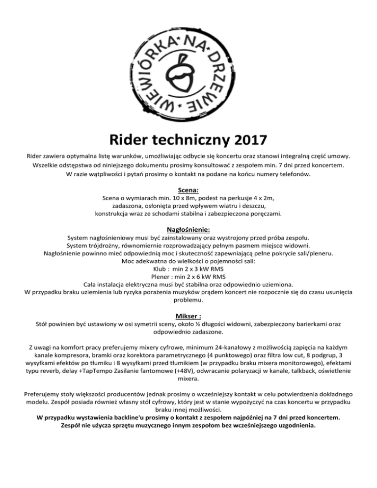 Rider techniczny 2017 Rider zawiera optymalna listę warunków, umożliwiając odbycie się koncertu oraz stanowi integralną część umowy. Wszelkie odstępstwa od niniejszego dokumentu prosimy konsultować z zespołem min. 7 dni przed koncertem. W razie wątpliwości i pytań prosimy o kontakt na podane na końcu numery telefonów. Scena: Scena o wymiarach min. 10 x 8m, podest na perkusje 4 x 2m, zadaszona, osłonięta przed wpływem wiatru i deszczu, konstrukcja wraz ze schodami stabilna i zabezpieczona poręczami. Nagłośnienie: System nagłośnieniowy musi być zainstalowany oraz wystrojony przed próba zespołu. System trójdrożny, równomiernie rozprowadzający pełnym pasmem miejsce widowni. Nagłośnienie powinno mieć odpowiednią moc i skuteczność zapewniającą pełne pokrycie sali/pleneru. Moc adekwatna do wielkości o pojemności sali: Klub : min 2 x 3 kW RMS Plener : min 2 x 6 kW RMS Cała instalacja elektryczna musi być stabilna oraz odpowiednio uziemiona. W przypadku braku uziemienia lub ryzyka porażenia muzyków prądem koncert nie rozpocznie się do czasu usunięcia problemu. Mikser : Stół powinien być ustawiony w osi symetrii sceny, około ½ długości widowni, zabezpieczony barierkami oraz odpowiednio zadaszone. Z uwagi na komfort pracy preferujemy mixery cyfrowe, minimum 24-kanałowy z możliwością zapięcia na każdym kanale kompresora, bramki oraz korektora parametrycznego (4 punktowego) oraz filtra low cut, 8 podgrup, 3 wysyłkami efektów po tłumiku i 8 wysyłkami przed tłumikiem (w przypadku braku mixera monitorowego), efektami typu reverb, delay +TapTempo Zasilanie fantomowe (+48V), odwracanie polaryzacji w kanale, talkback, oświetlenie mixera. Preferujemy stoły większości producentów jednak prosimy o wcześniejszy kontakt w celu potwierdzenia dokładnego modelu. Zespół posiada również własny stół cyfrowy, który jest w stanie wypożyczyć na czas koncertu w przypadku braku innej możliwości. W przypadku wystawienia backline'u prosimy o kontakt z zespołem najpóźniej na 7 dni przed koncertem. Zespół nie użycza sprzętu muzycznego innym zespołom bez wcześniejszego uzgodnienia. System monitorowy: Organizator koncertu powinien zapewnić: 3 monitory podłogowe + 4 monitory bezprzewodowe IEM (Shure, Sennheiser) oraz linię dla perkusisty (bez drumfill'a) - wszystko wysyłane przed tłumikiem. W przypadku większych imprez plenerowych mile widziany jest dodatkowy odsłuch typu sidefill (z możliwością opóźnienia w tym momencie monitorów podłogowych). - Odsłuchy: Przy każdym torze są wymienione orientacyjne proporcje instrumentów. Tor 1 [WEDGE] - Stopa, werbel, główny wokal, gitara solowa z przodu Tor 2 [WEDGE] - Stopa, werbel, hihat, odrobina basu, odrobina wokalu perkusisty + gitara rytmiczna i główny wokal z przodu Tor 3 [IEM] - Mix perkusji, gitara rytmiczna, główny wokal, wokal basisty, bas z przodu Tor 4 [LINIA] - Mix perkusji, bas, gitara rytmiczna, główny wokal, wokal perkusisty, gitara solowa i odrobina sekcji dętej Tor 5 [WEDGE] - Główny wokal, conga + KORG z przodu Tor 6 [IEM] - Mix perkusji , bas, gita solowa, główny wokal, saksofon, trąbka, puzon z przodu Tor 7 [IEM] - Mix perkusji , bas, gita solowa, główny wokal, trąbka, puzon, saksofon z przodu Tor 8 [IEM] - Mix perkusji , bas, gita solowa, główny wokal, saksofon, puzon , trąbka z przodu KONTAKT Menager Realizator Technika Radek Kuczyński +48 604 982 001 Kamil Wójcik +48 728 486 698 Bartłomiej Szatkowski +48 661 576 515 [email protected] [email protected] [email protected] [email protected] INPUT 1 2 3 4 5 6 7 8 9 10 11 12 13 14 15 16 17 18 19 20 21 22 GRP 1 GRP 2 GRP 3 GRP 4 GRP 5 GRP 6 INPUT LIST INSTRUMENT MICROPHONE BD B52/D6/e902 SD SM57/i5/e905 Tom 10' e604/e904/D2 Tom 14' e604/e904/D4 Tom 16' e604/e904/D4 HH SM81/e614/ADX-51 OH L SM81/e614/ADX-51 OH R SM81/e614/ADX-51 BASS DiBox GTR LEAD SM57/e906/i5 GTR RYTHM SM57/e906/i5 TROMBONE ATM350/E908B WIRELESS SAXOPHONE ATM350/E908B WIRELESS TRUMPET ATM350/E908B WIRELESS CONGA SM57/ADX-51 CONGA SM57/ADX-51 KORG WAVEDRUM DiBox VOC LEAD SM58 MISIEK VOC BACK. SM58 HERMAN VOC BACK. SM58 DAVE KEY L DiBox KEY R DiBox DRUMS BASS GTR BRASS VOC FX STAGE