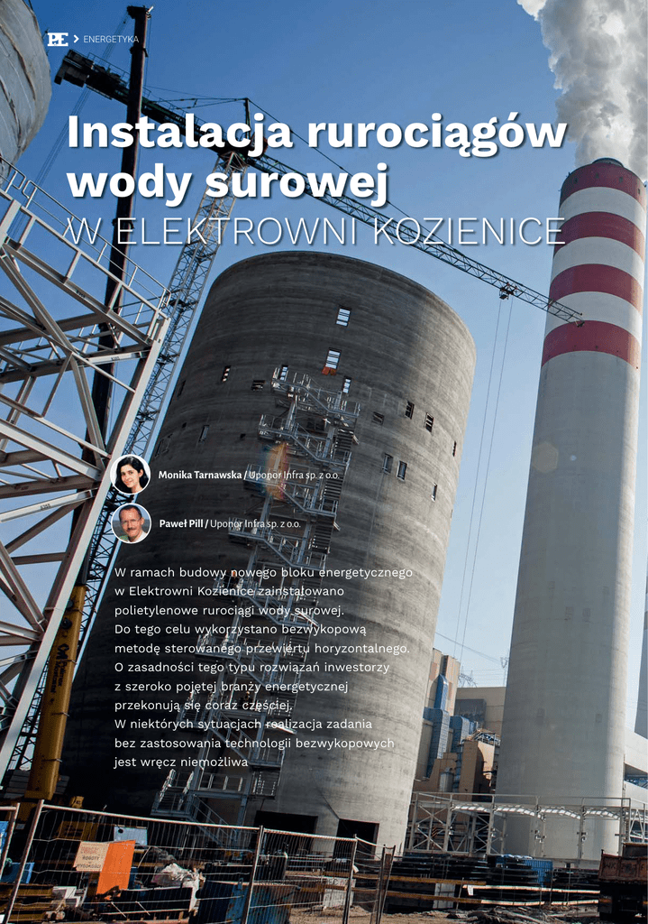 ENERGETYKA Instalacja rurociągów wody surowej W ELEKTROWNI KOZIENICE Monika Tarnawska / Uponor Infra sp. z o.o. Paweł Pill / Uponor Infra sp. z o.o. W ramach budowy nowego bloku energetycznego w Elektrowni Kozienice zainstalowano polietylenowe rurociągi wody surowej. Do tego celu wykorzystano bezwykopową metodę sterowanego przewiertu horyzontalnego. O zasadności tego typu rozwiązań inwestorzy z szeroko pojętej branży energetycznej przekonują się coraz częściej. W niektórych sytuacjach realizacja zadania bez zastosowania technologii bezwykopowych jest wręcz niemożliwa 60 KWIECIEŃ - CZERWIEC / 2 / 2016 / 17 ENERGETYKA Paliwa i Energetyka Grupa Enea jest czołowym producentem, dystrybutorem i sprzedawcą energii elektrycznej oraz cieplnej. Jest trzecią co do wielkości grupą energetyczną w Polsce, a jej udział w krajowym rynku sprzedaży energii elektrycznej wynosi 13%. Podmiotem odpowiedzialnym za cały obszar wytwarzania w Grupie jest Enea Wytwarzanie S.A., największy w Polsce wytwórca energii produkowanej na bazie węgla kamiennego. Spółka zarządza Elektrownią Kozienice, posiadającą 10 wysokosprawnych bloków energetycznych o łącznej mocy osiągalnej 2919 MW, co daje około 8% udziału w tym rynku. Zainstalowana moc oraz lokalizacja sprawiają, że kozienicka siłownia jest jednym z najważniejszych ogniw Krajowego Systemu Elektroenergetycznego. Jedenasty blok energetyczny w Elektrowni Kozienice Największą i najnowszą inwestycją Grupy Enea jest jedenasty blok energetyczny w Elektrowni Kozienice. Jego moc to 1075 MW brutto. Będzie to najnowocześniejsza w Polsce i Europie tego typu jednostka opalana węglem. Dzięki zaawansowanym innowacyjnym technologiom blok będzie pracował na nadkrytyczne parametry pary, co pozwoli na uzyskanie tej samej ilości energii przy znacznie mniejszym zużyciu węgla. Ograniczy to emisję zanieczyszczeń do środowiska i zagwarantuje stosunkowo niskie koszty wytworzenia energii. Nowy blok zaprojektowano jako jednostkę całkowicie niezależną, posiadającą własną infrastrukturę. Dzięki zamkniętemu systemowi obiegu wody jego moc nie będzie uzależniona np. od temperatury wody w Wiśle. Budowa rozpoczęła się pod koniec 2013 r. Generalnym wykonawcą inwestycji zostało konsorcjum firm Mitsubishi Hitachi Power Systems Europe GmbH (MHPSE) i Polimex-Mostostal SA. W ciągu 2,5 roku, po wzmocnieniu gruntu żelbetowymi palami, powstały główne obiekty nowego bloku kozienickiej elektrowni, w tym chłodnia kominowa, kocioł wraz z pylonami komunikacyjnymi, instalacja odsiarczania spalin, kotłownia, maszynownia, budynek urządzeń elektrycznych oraz zbiorniki retencyjne popiołów. Zakończenie prac i oddanie bloku do użytku planowane jest na drugą połowę 2017 r. Dotychczas realizacja inwestycji przebiega zgodnie z planem. Rurociąg wody surowej Istotnym elementem nowego bloku energetycznego jest rurociąg wody surowej, zaopatrujący stację przygotowania wody, którego podwykonawcą zostało Przedsiębiorstwo Budowlano-Melioracyjne TOLOS. Obiekt ten będzie się składać z kilku elementów, takich jak: – rurociąg grawitacyjny doprowadzający mechanicznie wstępnie oczyszczoną wodę z ujęcia wody zimnej do pompowni wody surowej; do jego budowy wykorzystano rury Weholite DN1000 SN8 produkcji Uponor Infra oraz studzienki rewizyjne Weho DN1800 wykonane dla potrzeb konserwacji rurociągu; – dwa wloty ujęciowe wody surowej, pobieranej z istniejącego kanału doprowadzającego wodę chłodzącą z rzeki Wisły do pompowni bloków 500 MW; do ich budowy użyto rur ciśnieniowych PE100 DN 1000 SDR 17; – pompownia wody surowej; – rurociąg ciśnieniowy, łączący pompownię wody surowej ze stacją przygotowania wody; do jego budowy zastosowano rury PE100 DN800 SDR22 układane w wykopie oraz PE100 DN800 SDR17 dla rurociągu ułożonego metodą HDD (ang. Horizontal Directional Drilling) pod dnem kanału zrzutowego. Moc nowego bloku w Elektrowni Kozienice wyniesie 1075 MW brutto. Będzie to najnowocześniejsza w Europie tego typu jednostka opalana węglem Instalacja rurociągu metodą HDD Pierwsza sekcja rurociągu ciśnieniowego PE100 PN7,5 SDR22 d. 800 x 36,4 mm o długości 405 m została ułożona w wykopie. W przypadku montażu drugiej sekcji konieczne było wykorzystanie technologii bezwykopowej – metody sterowanego przewiertu horyzontalnego. W ten sposób wykonano przekroczenie kanału odpływowego z Elektrowni Kozienice i zainstalowano przewód o długości 236 m z rur PE100 PN10 SDR17 d. 800 x 47,4 mm. KWIECIEŃ - CZERWIEC / 2 / 2016 / 17 61 ENERGETYKA Początkowo planowano, że zadanie to zostanie zrealizowane z zastosowaniem technologii swobodnego zatapiania w wykopie otwartym w nurcie kanału zrzutowego przy niskich poziomach wód w rzece Wiśle. Technologia ta wymagałaby zastosowania specjalistycznego sprzętu (koparki na platformie pływającej, barek do odwozu urobku i przywozu zasypek) oraz dużego zakresu robót ziemnych, co generowałoby duże koszty. Zdecydowano o zmianie metody budowy. Podjęto decyzję o wykorzystaniu rur PEHD zamiast GRP, a zaproponowana technologia bezwykopowa (horyzontalny przewiert sterowany) i instalacja przewodu z rur polietylenowych okazała się optymalnym rozwiązaniem. Prace wiertnicze rozpoczęto w czerwcu 2015 r. od wykonania otworów pilotażowych pod kanałem. Po wykonaniu wiercenia pilotowego za pomocą świdra trójgryzowego przystąpiono do rozwiercenia otworu rozwiertakiem. Maksymalna głębokość przewiertu wynosiła 26,1 m. Następnie w utworzony otwór wprowadzono rury polietylenowe, wcześniej połączone metodą zgrzewania doczołowego w odcinek o długości 236 m. Rury wyprodukowano w fabryce Uponor Infra w Kleszczowie i dostarczono na miejsce instalacji w dłuższych niż standardowe, 15-metrowych odcinkach, w celu zminimalizowania liczby zgrzewów. Prace instalacyjne przebiegały bez zakłóceń, trwały około 10 godz. i zakończyły się sukcese