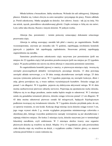 Młoda kobieta z brzuszkiem. Jakby nieobecna. Wchodzi do sali zabiegowej. Zdejmuje płaszcz. Kładzie się. Lekarz chwyta za ostre narzędzia i przystępuje do pracy. Potem odkłada je. Poród zakończony. Matka spogląda na dziecko. Jest zdrowe. Joasia - tak jej na imię. Nie ma nóżek, rączek, prawidłowo ukształtowanej główki. Ciepło owinięta w folię nic nie mówi. Leży sobie taka śliczna. Razem z innymi dziećmi. W jednym worku. Aborcja (łac. poronienie) – termin potoczny oznaczający dokonanie sztucznego przerwania ciąży. Aborcja to zabieg usuwający zarodek lub płód z macicy po zagnieżdżeniu. Środki wczesnoporonne, używane po stosunku (do 72 godzin), zapobiegają uwolnieniu komórek jajowych z jajników lub zapobiegają zapłodnieniu. Stosowane później zapobiegają zagnieżdżeniu się zarodka. Samoistne przedwczesne zakończenie ciąży nazywane jest poronieniem (jeśli ma miejsce do 22 tygodnia ciąży) lub porodem przedwczesnym (jeśli ma miejsce po 22 tygodniu ciąży). W języku polskim nie używa się słowa aborcja w znaczeniu poronienie samoistne. Po zagnieżdżeniu komórki jajowej w macicy, w pierwszym miesiącu ciąży tworzą się zawiązki poszczególnych układów wewnętrznych, poczętego dziecka. 13 dnia powstają zawiązki układu nerwowego, a w 20 dniu zostają ukształtowane zawiązki mózgu. 25 dnia zaczyna rytmicznie pulsować serce. W 5 tygodniu pojawiają się zawiązki kończyn, dłoni i stóp, głowa powiększa się, a twarz nabiera wyraźniejszych kształtów. Dziecko osiąga już ponad 1 cm długości. W 6 tygodniu pojawia się elektryczna aktywność mózgu. W 41 dniu można zaobserwować pierwsze odruchy nerwowe. Pojawiają się spontaniczne ruchy dziecka. Odbywa się to na długo przedtem, zanim matka będzie mogła to odnotować. W 2 miesiącu ustala się gonadalna tożsamość płciowa, dziecko osiąga wówczas ponad 1,5 cm długości. W 43 dniu można odnotować pierwsze oznaki fal mózgowych, będących fizjologicznym podłożem tworzącej się świadomości dziecka. W 7 tygodniu dziecko przykłada palec do ust, co sprawia wrażenie, że ssie kciuk. Kończąc drugi miesiąc życia dziecko osiąga wzrost 3 cm, jego waga wynosi około 2 g, swoim wyglądem przypomina miniaturowego człowieka o określonej płci, którego wszystkie podstawowe narządy wewnętrzne są już ukształtowane i zajmują właściwe miejsce. Do końca 2 miesiąca życia, dziecko nazywane jest w terminologii lekarskiej zarodkiem, czyli embrionem. W 3 miesiącu okolice twarzy oraz organów płciowych dziecka są wrażliwe na dotyk. Między 14 a 15 tygodniem już cała powierzchnia ciała dziecka staje się wrażliwa na dotyk, z wyjątkiem czubka i boków głowy, co stanowi ochronę przed bólem w czasie rodzenia się. -1- A więc kiedy zaczyna się ludzkie życie? Problematyka dopuszczalności i wykonywania aborcji jest wysoce kontrowersyjna w oczach części społeczeństwa i jest przedmiotem różnych ocen moralnych. Wykonywanie zabiegu aborcji wiąże się z dużym sprzeciwem wielu osób oraz środowisk, między innymi związanych z Kościołem katolickim i Kościołami protestanckimi (tzw. "obrońcy życia", ruchy pro-life). Z drugiej strony, aborcja jest akceptowana przez ludzi, którzy decyzję o ewentualnym przerwaniu ciąży pozostawiają kobiecie. W religii katolickiej aborcja stanowi grzech śmiertelny i wiąże się z automatyczną ekskomuniką. W przekonaniu takich religii jak katolicyzm, prawosławie i większość wyznań protestanckich, płód jest istotą ludzką, aborcja zaś jest zabójstwem naruszającym prawa osoby nienarodzonej. Jest to grzech śmiertelny określany jako „wołający o pomstę do nieba”. Środowiska popierające swobodę decydowania o wykonaniu lub nie, zabiegu aborcji (ruchy pro-choice), nie zgadzają się z tym stanowiskiem i sprzeciwiają się wprowadzaniu zakazu dokonywania aborcji. Radykalne stanowisko opowiada się za brakiem ograniczeń w dopuszczalności aborcji do określonego etapu rozwoju płodu (aborcja "na życzenie"). Jego argumentem jest prawo kobiety do swobodnego wyboru odnośnie swojego stanu ciąży, uznawane przez zwolenników tej opcji za wartość. Stanowisko umiarkowane opowiada się za dopuszczalnością aborcji jedynie pod pewnymi określonymi warunkami (jak ciąża w wyniku zgwałcenia, trudne warunki życiowe lub materialne kobiety, uszkodzenia lub wady genetyczne płodu). Wyraźny zakaz dokonywania aborcji znajdował się w Przysiędze Hipokratesa: Nikomu, nawet na żądanie, nie dam śmiercionośnej trucizny, ani nikomu nie będę jej doradzał, podobnie też nie dam nigdy niewieście środka poronnego. W tekście Deklaracji Genewskiej fragment ten został zastąpiony następującym zdaniem: zachowam najwyższy szacunek dla życia ludzkiego. W tekście Przyrzeczenia Lekarskiego, które jest dziś składane przez lekarzy w Polsce, odpowiedni fragment brzmi: przyrzekam: (...) -służyć życiu i zdrowiu ludzkiemu; W Polsce problematyka warunków dopuszczalności aborcji jest od lat 90. XX wieku przedmiotem debaty publicznej. Istotny wpływ na społeczne postrzeganie aborcji ma stanowisko Kościoła katolickiego. Problematyka aborcji wywołuje silne emocje, których wyrazem jest między innymi język debat, odnoszący się do "zabijania nienarodzonych" z -2- jednej strony, a do "prawie kobiet do decydowania o swoim ciele" z drugiej. Kwestia aborcji podnoszona jednak bywa często w doraźnych celach politycznych. Wejście w życie ustawy z dnia 7 stycznia 1993 r. o planowaniu rodziny, ochronie płodu ludzkiego i warunkach dopuszczalności przerywania ciąży (Dz. U. z 1993 r. Nr 17, poz. 78) ograniczyło dostęp do zabiegów przerywania ciąży - odtąd można dokonywać legalnej aborcji przy zaistnieniu jednej z określonych przesłanek: 1. ciąża stanowi zagrożenie dla życia lub zdrowia kobiety ciężarnej (do chwili osiągnięcia przez płód zdolności do samodzielnego życia poza org