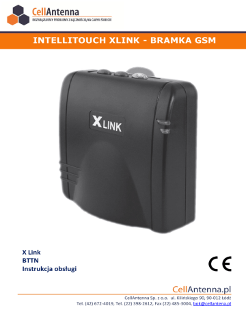INTELLITOUCH XLINK - BRAMKA GSM X Link BTTN Instrukcja obsługi CellAntenna Sp. z o.o. ul. Kilińskiego 90, 90-012 Łódź Tel. (42) 672-4019, Tel. (22) 398-2612, Fax (22) 485-3004, [email protected] 1. Wg rysunku OSTRZEŻENIE Ponieważ XLink zasila Państwa telefony domowe, prosimy nigdy nie podłączać gniazda słuchawki Xlink do naziemnej linii telefonicznej, czy to bezpośrednio, czy przez inny telefon. Jeśli zaczyna pulsować czerwone światełko, to znaczy, że Xlink został podłączony do aktywnej linii telefonicznej. Trzeba natychmiast odłączyć kabel i sprawdzić ustawienia. Wiecej informacji na: www.myxlink.com UWAGA: Port USB używany jest do konfiguracji funkcji specjalnych i wgrywania nowego oprogramowania. Więcej informacji na: www.myxlink.com CellAntenna Sp. z o.o. ul. Kilińskiego 90, 90-012 Łódź Tel. (42) 672-4019, Tel. (22) 398-2612, Fax (22) 485-3004, [email protected] Sposoby instalacji urządzenia CellAntenna Sp. z o.o. ul. Kilińskiego 90, 90-012 Łódź Tel. (42) 672-4019, Tel. (22) 398-2612, Fax (22) 485-3004, [email protected] 2. Proszę wcisnąć przycisk LINIA do momentu, aż zacznie pulsować. 3. Uruchamianie łączności A. Proszę uruchomić Bluetooth na telefonie komórkowym lub odszukać urządzenia Bluetooth. Może wystąpić konieczność wybrania opcji „Handsfree” lub „Zestaw słuchawkowy”. W celu właściwego wyboru proszę zapoznać się z instrukcją swojego telefonu. UWAGA: W trakcie szukania urządzeń Bluetooth, proszę wybrać opcję „Handsfree” jeśli jest dostępna w telefonie komórkowym. Proszę wyłączyć opcję „Auto Answer” jeśli jest włączona B. Proszę wybrać Xlink Gateway C. Proszę wprowadzić numer PIN, jeśli telefon wyświetli taką instrukcję. CellAntenna Sp. z o.o. ul. Kilińskiego 90, 90-012 Łódź Tel. (42) 672-4019, Tel. (22) 398-2612, Fax (22) 485-3004, [email protected] X LINK Szybki start Dziękujemy za zakup Xlink Bluetooth Cellular Gateway. Pozwala on na routowanie połączeń komórkowych przez telefoniczny system domowy. Ta instrukcja pomoże Państwu w szybkim uruchomieniu urządzenia, ale zalecane jest zalogowanie na www.myxlink.com, do zakładki „Support” aby uzyskać informację na temat wszystkich możliwości urządzenia, opcji ustawień oraz porad instalacyjnych. Zawartość opakowania: Xlink BTTN Zasilacz Kabel telefoniczny Elementy podświetlane – oznaczenia Zielone, stałe (Rys. 1) – oznacza, że urządzenie jest zasilane i pracuje normalnie. Czerwone, pulsujące (Rys. 1) – oznacza, że do urządzenia, do niewłaściwego gniazda, podłączona jest stacjonarna linia telefoniczna. Należy niezwłocznie odłączyć kable telefoniczne, aż czerwone światło zgaśnie. W czasie ponownego podłączania należy upewnić się, że linia telefoniczna zostanie podłączona do właściwego gniazda, tak jak to pokazano na diagramie. Niebieskie (Rys. 2) Stałe – oznacza, że Xlink jest połączony z telefonem komórkowym na tej linii. Pulsujące szybko – oznacza, że linia znajduje się w fazie parowania. Proszę użyć telefonu komórkowego do znalezienia połączenia z Xlink Pulsujące wolno – oznacza, że linie zostały sparowane, ale telefon komórkowy znajduje się poza zasięgiem. Parowanie telefonu komórkowego z Xlink Proszę zapoznać się z ilustracją nr. 1 na pierwszej stronie: 1. Proszę połączyć Xlink zgodnie ze wskazówkami z ilustracji ze str.1 2. Proszę przycisnąć jeden z przycisków liniowych (Rys. 2) przez ok. 6 sekund aż zacznie pulsować niebieskim światłem. 3. A i B (Rys. 2): proszę odszukać i uruchomić opcję Bluetooth w telefonie komórkowym do momentu, w którym pojawi się komunikat, że telefon „znalazł” Xlink. W celu uzyskania informacji dodatkowych wskazane jest zapoznać się z instrukcją obsługi telefonu komórkowego. C: Proszę wprowadzić numer PIN: 0-0-0-0 Uwaga: Rozparowanie można uzyskać poprzez ponowne wciśnięcie przycisku linii przez około 6 sekund aż do uzyskania pulsującego, niebieskiego światła. CellAntenna Sp. z o.o. ul. Kilińskiego 90, 90-012 Łódź Tel. (42) 672-4019, Tel. (22) 398-2612, Fax (22) 485-3004, [email protected] Wybieranie numeru telefonicznego na telefonie stacjonarnym Na jakimkolwiek telefonie stacjonarnym powiązanym z Xlink proszę wybrać numer telefonu, z którym chcemy się połączyć, w taki sposób, jak dotychczas. Jeśli w słuchawce pojawi się dźwięk sygnalizujący błąd połączenia ( seria szybkich dźwięków), oznacza to, że żaden telefon komórkowy nie jest dostępny. Proszę upewnić się, że przynajmniej jeden telefon komórkowy jest sparowany z Xlink i znajduje się w zasięgu Bluetooth. Xlink domyślnie najpierw wybierze numer telefonu na linii stacjonarnej, a w drugiej kolejności użyje telefonu komórkowego. Aby wybrać połączenie przez konkretny telefon komórkowy proszę wybrać numer linii (1,2 lub 3), z którą telefon komórkowy jest sparowany, nacisnąć przycisk „flash” (lub wybrać standardowy sposób na zmianę linii w opcji Rozmowa Oczekująca) na telefonie, a następnie wybrać numer telefonu, z którym chcemy się połączyć. Aby użyć opcji Szybkie Wybieranie swojego telefonu komórkowego (np.: „naciśnij 1 aby połączyć się ze skrzynką głosową”) proszę wziąć którykolwiek telefon stacjonarny, opcjonalnie wybrać linię (w sposób opisany powyżej) i wybrać właściwą cyfrę i # na tym telefonie stacjonarnym. Aby skorzystać z opcji „wybieranie głosowe” proszę wziąć telefon stacjonarny, opcjonalnie wybrać linię (w sposób opisany powyżej), nacisnąć # # i wypowiedzieć numer telefonu lub postąpić zgodnie z instrukcjami z telefonu komórkowego. Odbieranie rozmów Każdy stacjonarny telefon połączony z Xlink ma inny wzór dźwiękowy, pozwalający na łatwe rozróżnienie, który z nich dzwoni. UWAGA: wiele telefonów bezprzewodowych nie posiada tej usługi. Xlink może zostać skonfigurowany w taki sposób, aby 