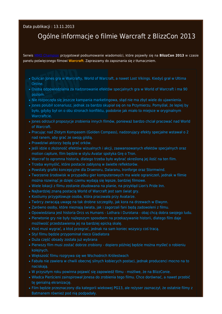 Data publikacji : 13.11.2013 Ogólne informacje o filmie Warcraft z BlizzCon 2013 Serwis MMO Champion przygotował podsumowanie wiadomości, które pojawiły się na BlizzCon 2013 w czasie panelu poświęconego filmowi Warcraft. Zapraszamy do zapoznania się z tłumaczniem. ● ● ● ● ● ● ● ● ● ● ● ● ● ● ● ● ● ● ● ● ● ● ● ● ● ● ● ● Duncan Jones gra w Warcrafty, World of Warcraft, a nawet Lost Vikings. Kiedyś grał w Ultima Online. Osoba odpowiedzialna za nadzorowanie efektów specjalnych gra w World of Warcraft i ma 90 poziom. Nie rozpoczęła się jeszcze kampania marketingowa, stąd nie ma zbyt wiele do ujawnienia. Jones polubił scenariusz, jednak za bardzo skupiał się on na Przymierzu. Pomyślał, że lepiej by było, gdyby był on o obu stronach konfliktu, podobnie jak miało to miejsce w oryginalnym Warcraftcie. Jones odrzucił propozycje zrobienia innych filmów, ponieważ bardzo chciał pracować nad World of Warcraft. Pracując nad Złotym Kompasem (Golden Compass), nadzorujący efekty specjalne wstawał o 2 nad ranem, aby grać ze swoją gildią. Prawdziwi aktorzy będą grać orków. Jeśli idzie o złożoność efektów wizualnych i akcji, zaawansowanych efektów specjalnych oraz motion capture, film będzie w stylu Avatar spotyka Grę o Tron. Warcraf to ogromna historia, dlatego trzeba było wybrać określoną jej ilość na ten film. Trzeba wymyślić, które postacie zabłysną w świetle reflektorów. Powstały grafiki koncepcyjne dla Draenoru, Dalaranu, Ironforge oraz Stormwind. Tworzenie środowisk w przypadku gier komputerowych ma wiele ograniczeń, jednak w filmie można rozwinąć je dzięki czemu wydają się lepsze, bardziej filmowe. Wiele lokacji z filmu zostanie zbudowana na planie, na przykłąd Lion's Pride Inn. Najbardziej znaną postacią World of Warcraft jest sam świat gry. Kostiumy przygotowuje osoba, która pracowała przy Avatarze. Twórcy zwracają uwagę na tak drobne szczegóły, jak kora na drzewach w Elwynn. Zarówno osoby, które nieznają świata, jak i zagorzali fani będą zadowoleni z filmu. Opowiedziana jest historia Orcs vs Humans - Lothara i Durotana - obaj chcą dobra swojego ludu. Pierwtonie gry nie były najlepszym sposobem na przekazywanie historii, dlatego film daje możliwość przedstawienia jej na bardziej epicką skalę. Ktoś musi wygrać, a ktoś przegrać, jednak na sam koniec wszyscy coś tracą. Styl filmu będzie przypominał nieco Gladiatora Duża część obsady została już wybrana Pierwszy film musi zostać dobrze zrobiony - dopiero później będzie można myśleć o robieniu kolejnych. Większość filmu rozgrywa się we Wschodnich Królestwach Fabuła nie zawiera w chwili obecnej silnych kobiecych postaci, jednak producenci mocno na to naciskają. W przyszłym roku powinna pojawić się zapowiedź filmu - możliwe, że na BlizzConie. Władca Pierścieni zainspirował Jonesa do zrobienia tego filmu. Chce dorównać, a nawet przebić tę genialną ekranizację. Film będzie przeznaczony dla kategorii wiekowej PG13, ale reżyser zaznaczył, że ostatnie filmy z Batmanem również pod nią podpadały. Przy okazji przypominamy, że jakiś czas temu Blizzard ogłosił, że film Warcraft pojawi się w kinach 18 grudnia 2015 roku! Autor: Sigmar Liczba wyświetleń strony: 4040 Data publikacji : 13.11.2013 Tagi: film, Warcraft Movie, BlizzCon 2013 Komentarz (4) dodaj komentarz Nie wiem co mam o tym myśleć, niby jest A, niby jest B, ale żeby z tych przechwałków coś na serio wyszło, a nie jakiś krach.~shaylo 2013/11/15 12:53 Z jednej strony zapewniają że wszystko fajnie wyjdzie no ale z drugiej nie widziałem za wiele udanych ekranizacji gier tym bardziej trochę mnie przeraża to PG13 No nic mam nadzieje że wyjdzie coś w stylu Władcy Pierścieni a nie coś typu Złoty Kompas.~Frezko11 2013/11/15 21:02 Władca Pierścieni i seria o Batmanie to PG13 więc nie ma się czym martwić. Jelita na ekranie nie wyglądają zbyt dobrze tak apropos.~Matstry 2013/11/17 14:24 Ta ale patrząc na ostatnie posunięcia Blizzarda np Mist of Pandaria to trochę jest o co się martwić.~Frezko11 2013/11/17 21:10 dodaj komentarz Pozostałe nowości Zapowiedź zmian w klasach - Mnich Legion wkroczył w fazę alfa testów w czasie których dostępna jest póki co jedynie lokacja startowa łowców demonów, a my przyglądamy się temu, jakich zmian doczeka się klasa, która stosunkowo niedawno pojawiła się w World of Warcraft. Oto co na najnowszy dodatek Blizzard przygotował dla mnichów.Data publikacji: 24.11.20150 Zapowiedź zmian w klasach - Wojownik Po krótkiej przerwie wracamy z tłumaczeniami blogów poświęconych zmianom, jakie pojawią się w klasach w nadchodzącym dodatku do World of Warcraft. Oto czego powinni spodziewać się wojownicy z Azeroth w LegionieData publikacji: 23.11.20150 Zapowiedź zmian w klasach - Szaman Kolejna zapowiedzieć, która pojawiła się jakiś czas temu na łamach oficjalnej strony społecznościowej dotyczy szamana. Największe zmiany w przypadku tej klasy dotknęły totemy oraz system zasobów specjalizacji Elemental oraz EnhancementData publikacji: 16.11.20150 11 urodziny World of Warcraft World of Warcraft obchodzi już swoje 11 urodziny. Z tej okazji Blizzard przygotował kilka zabawek, które powinny wszystkim przypomnieć sam początek przygody w świecie Azeroth - w rolach głównych Edwin VanCleef, Hogger, murlok oraz Windfury (w wersji nadmuchiwanej).Data publikacji: 16.11.20150 Zapowiedź zmian w klasach - Rycerz śmierci Kolejna zapowiedź opublikowana na łamach oficjalnej strony społecznościowej World of Warcraft poświęcona jest klasie rycerzy śmierci. Poniżej znajdziecie informacje między innymi o ujednoliceniu wszystkich run oraz nowej umiejętności specjalizacji Blood, która została zainspirowana Lordem Marrowgarem z Icecrown Citadel.Data publikacji: 15.11.20150 Wszystkie nowości