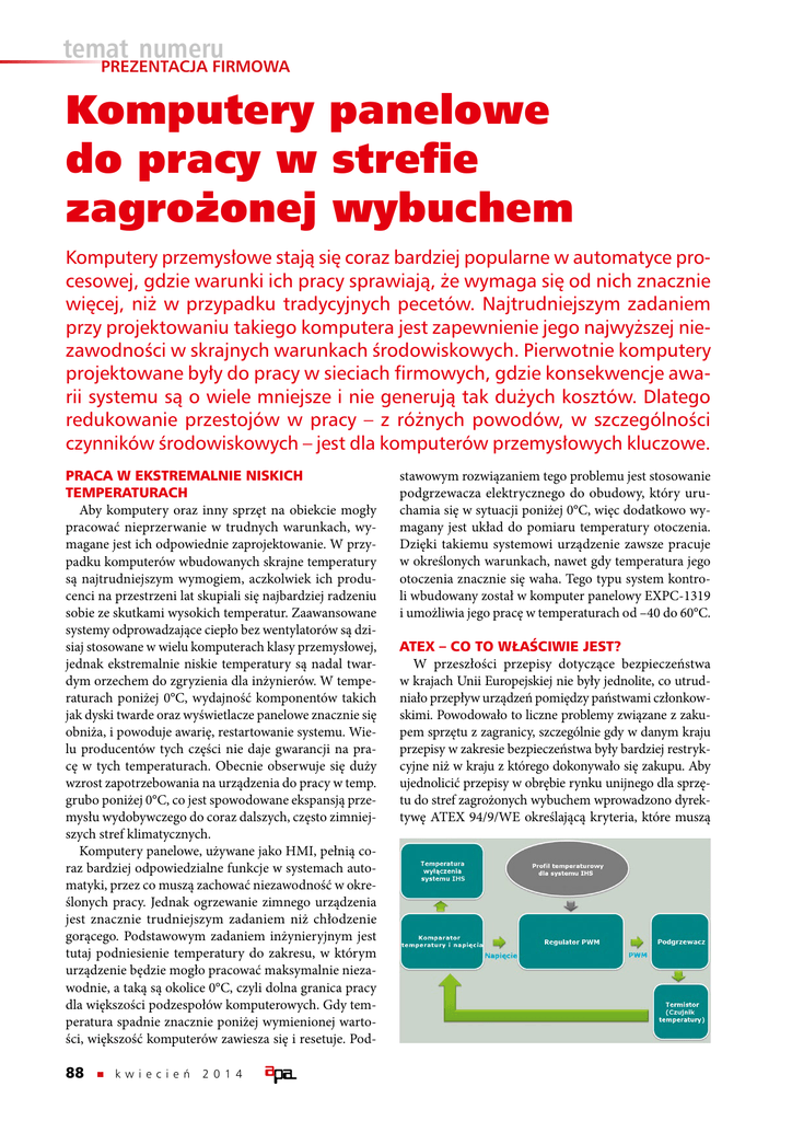 temat numeru PREZENTACJA FIRMOWA Komputery panelowe do pracy w strefie zagrożonej wybuchem Komputery przemysłowe stają się coraz bardziej popularne w automatyce procesowej, gdzie warunki ich pracy sprawiają, że wymaga się od nich znacznie więcej, niż w przypadku tradycyjnych pecetów. Najtrudniejszym zadaniem przy projektowaniu takiego komputera jest zapewnienie jego najwyższej niezawodności w skrajnych warunkach środowiskowych. Pierwotnie komputery projektowane były do pracy w sieciach firmowych, gdzie konsekwencje awarii systemu są o wiele mniejsze i nie generują tak dużych kosztów. Dlatego redukowanie przestojów w pracy – z różnych powodów, w szczególności czynników środowiskowych – jest dla komputerów przemysłowych kluczowe. PRACA W EKSTREMALNIE NISKICH TEMPERATURACH Aby komputery oraz inny sprzęt na obiekcie mogły pracować nieprzerwanie w trudnych warunkach, wymagane jest ich odpowiednie zaprojektowanie. W przypadku komputerów wbudowanych skrajne temperatury są najtrudniejszym wymogiem, aczkolwiek ich producenci na przestrzeni lat skupiali się najbardziej radzeniu sobie ze skutkami wysokich temperatur. Zaawansowane systemy odprowadzające ciepło bez wentylatorów są dzisiaj stosowane w wielu komputerach klasy przemysłowej, jednak ekstremalnie niskie temperatury są nadal twardym orzechem do zgryzienia dla inżynierów. W temperaturach poniżej 0°C, wydajność komponentów takich jak dyski twarde oraz wyświetlacze panelowe znacznie się obniża, i powoduje awarię, restartowanie systemu. Wielu producentów tych części nie daje gwarancji na pracę w tych temperaturach. Obecnie obserwuje się duży wzrost zapotrzebowania na urządzenia do pracy w temp. grubo poniżej 0°C, co jest spowodowane ekspansją przemysłu wydobywczego do coraz dalszych, często zimniejszych stref klimatycznych. Komputery panelowe, używane jako HMI, pełnią coraz bardziej odpowiedzialne funkcje w systemach automatyki, przez co muszą zachować niezawodność w określonych pracy. Jednak ogrzewanie zimnego urządzenia jest znacznie trudniejszym zadaniem niż chłodzenie gorącego. Podstawowym zadaniem inżynieryjnym jest tutaj podniesienie temperatury do zakresu, w którym urządzenie będzie mogło pracować maksymalnie niezawodnie, a taką są okolice 0°C, czyli dolna granica pracy dla większości podzespołów komputerowych. Gdy temperatura spadnie znacznie poniżej wymienionej wartości, większość komputerów zawiesza się i resetuje. Pod- 88 k wiec ie ń 2 0 1 4 stawowym rozwiązaniem tego problemu jest stosowanie podgrzewacza elektrycznego do obudowy, który uruchamia się w sytuacji poniżej 0°C, więc dodatkowo wymagany jest układ do pomiaru temperatury otoczenia. Dzięki takiemu systemowi urządzenie zawsze pracuje w określonych warunkach, nawet gdy temperatura jego otoczenia znacznie się waha. Tego typu system kontroli wbudowany został w komputer panelowy E XPC-1319 i umożliwia jego pracę w temperaturach od –40 do 60°C. ATEX – CO TO WŁAŚCIWIE JEST? W przeszłości przepisy dotyczące bezpieczeństwa w krajach U nii Europejskiej nie były jednolite, co utrudniało przepływ urządzeń pomiędzy państwami członkowskimi. Powodowało to liczne problemy związane z zakupem sprzętu z zagranicy, szczególnie gdy w danym kraju przepisy w zakresie bezpieczeństwa były bardziej restrykcyjne niż w kraju z którego dokonywało się zakupu. Aby ujednolicić przepisy w obrębie rynku unijnego dla sprzętu do stref zagrożonych wybuchem wprowadzono dyrektywę A TEX 94/9/WE określającą kryteria, które muszą temat numeru PREZENTACJA FIRMOWA być spełnione, aby urządzenia mogły pracować w lokalizacjach o określonym stopniu zagrożeniu. Od lipca 2003 jest ona obowiązkowa dla wszystkich organizacji w UE. Omawiana dyrektywa klasyfikuje urządzenia na grupy oraz kategorie, przynależność urządzenia do danej grupy (I lub II) określa rodzaj zagrożenia wybuchem oraz miejsce stosowania. Co to jest atmosfera wybuchowa? Zdefiniowana jest ona jako mieszanina powietrza i łatwopalnych substancji takich jak gazy, opary, kurz i pył, które znajdują się w określonych warunkach atmosferycznych i spalają w całej objętości, gdy nastąpi ich zapłon. Jeśli chodzi o miejsca, które określa A TEX, to występują tu dwie główne grupy: I – praca w kopalniach oraz naziemnych częściach kopalń zagrożonych wybuchem, I I – praca na powierzchni, w obszarach zagrożonych wybuchem gazów, par, mgieł lub pyłów. W grupie drugiej występują też podgrupy określające dokładniejszy charakter zagrożenia. ATEX definiuje również typ zagrożenia, czyli tak naprawdę rodzaj atmosfery wybuchowej: G – gazy ciecze i opary, D – łatwopalne pyły. Dodatkowo wprowadzone jest też dla każdej z tych grup oznaczenie częstotliwości występowania danego zagrożenia. Spełnienie tych wysokich wymagań jest wyjątkowo trudne, szczególnie w przypadku komputerów przemysłowych. KOMPUTER PANELOWY EXPC-1319 Przemysł wydobywczy ciągle rozwija się, a procesy wydobycia ulegają coraz większej automatyzacji. Aczkolwiek w najbardziej odpowiedzialnych zadaniach nadal to człowiek podejmuje ostateczną decyzję. Interfejsy HMI zostały stworzone, aby ułatwić komunikację człowieka z maszyną, czyli w praktyce do kontroli i odczytu sterowanym procesem. Ostatnio coraz częściej stosuje się komputery panelowe, które mogą pełnić właśnie funkcję H MI lub wizualizacyjne, czyli np. związane z oprogramowaniem SCADA przedstawiającym stan maszyny czy parametry procesu. Komputer firmy M oxa – EXPC-1319 został stworzony właśnie do takich aplikacji, czyli wszędzie tam, gdzie panują trudne warunki. Najważniejsze parametry fizyczne komputera EXPC-1319 to wysoka odporność na kurz i wodę, co zapewnia obudowa o stopniu ochrony I P66 lub, wg oznaczeń N EMA 4X, co odpowiada wypływowi wody wynoszącym 65 GMP (0,0041m3/s), z jednocalowej dyszy oddalon