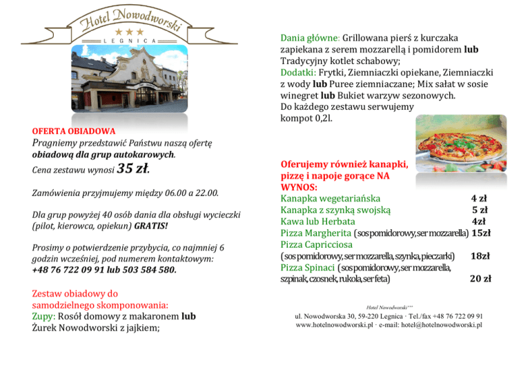 Dania główne: Grillowana pierś z kurczaka zapiekana z serem mozzarellą i pomidorem lub Tradycyjny kotlet schabowy; Dodatki: Frytki, Ziemniaczki opiekane, Ziemniaczki z wody lub Puree ziemniaczane; Mix sałat w sosie winegret lub Bukiet warzyw sezonowych. Do każdego zestawu serwujemy kompot 0,2l. OFERTA OBIADOWA Pragniemy przedstawić Państwu naszą ofertę obiadową dla grup autokarowych. Cena zestawu wynosi 35 zł. Zamówienia przyjmujemy między 06.00 a 22.00. Dla grup powyżej 40 osób dania dla obsługi wycieczki (pilot, kierowca, opiekun) GRATIS! Prosimy o potwierdzenie przybycia, co najmniej 6 godzin wcześniej, pod numerem kontaktowym: +48 76 722 09 91 lub 503 584 580. Zestaw obiadowy do samodzielnego skomponowania: Zupy: Rosół domowy z makaronem lub Żurek Nowodworski z jajkiem; Oferujemy również kanapki, pizzę i napoje gorące NA WYNOS: Kanapka wegetariańska 4 zł Kanapka z szynką swojską 5 zł Kawa lub Herbata 4zł Pizza Margherita (sospomidorowy,ser mozzarella) 15zł Pizza Capricciosa (sospomidorowy, ser mozzarella, szynka,pieczarki) 18zł Pizza Spinaci (sospomidorowy, ser mozzarella, szpinak, czosnek, rukola, serfeta) 20 zł Hotel Nowodworski*** ul. Nowodworska 30, 59-220 Legnica · Tel./fax +48 76 722 09 91 www.hotelnowodworski.pl · e-mail: [email protected]