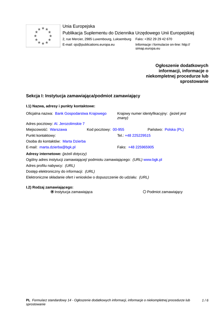 Unia Europejska Publikacja Suplementu do Dziennika Urzędowego Unii Europejskiej 2, rue Mercier, 2985 Luxembourg, Luksemburg Faks: +352 29 29 42 670 E-mail: [email protected] Informacje i formularze on-line: http:// simap.europa.eu Ogłoszenie dodatkowych informacji, informacje o niekompletnej procedurze lub sprostowanie Sekcja I: Instytucja zamawiająca/podmiot zamawiający I.1) Nazwa, adresy i punkty kontaktowe: Oficjalna nazwa: Bank Gospodarstwa Krajowego Krajowy numer identyfikacyjny: (jeżeli jest znany) _____ Adres pocztowy: Al. Jerozolimskie 7 Miejscowość: Warszawa Kod pocztowy: 00-955 Punkt kontaktowy: _____ Państwo: Polska (PL) Tel.: +48 225229515 Osoba do kontaktów: Marta Dzierba E-mail: [email protected] Faks: +48 225965905 Adresy internetowe: (jeżeli dotyczy) Ogólny adres instytucji zamawiającej/ podmiotu zamawiającego: (URL) www.bgk.pl Adres profilu nabywcy: (URL) _____ Dostęp elektroniczny do informacji: (URL) _____ Elektroniczne składanie ofert i wniosków o dopuszczenie do udziału: (URL) _____ I.2) Rodzaj zamawiającego: Instytucja zamawiająca Podmiot zamawiający PL Formularz standardowy 14 - Ogłoszenie dodatkowych informacji, informacje o niekompletnej procedurze lub sprostowanie 1/6 Sekcja II: Przedmiot zamówienia II.1.1) Nazwa nadana zamówieniu: Centralny System Bankowy II.1.2) Krótki opis zamówienia lub zakupu: (podano w pierwotnym ogłoszeniu) Przedmiotem zamówienia jest udzielenie prawa do korzystania i instalacja oprogramowania składającego się na nowy Centralny System Bankowy (dalej zwany również „Systemem” lub „systemem CSB”), wraz z dostawą (sprzedażą i udzieleniem gwarancji) niezbędnej infrastruktury sprzętowej. Przedmiotem zamówienia objęte są również usługi związane z wdrożeniem dostarczonego Systemu oraz usługi gwarancyjne i serwisowe, świadczone po uruchomieniu produkcyjnym systemu CSB. System CSB, którego funkcjonalność zostanie szczegółowo określona w SIWZ, to rozwiązanie, które zastąpi obecnie stosowane rozwiązania informatyczne w zakresie: • bezpośredniej obsługi klienta Zamawiającego (Zamawiający w treści niniejszego dokumentu określony również jako: „Bank” lub „BGK”); • administrowania „produktami” Banku (w szczególności umowami kredytowymi, umowami depozytowymi i rachunkami bieżącymi klientów Banku), • wsparcia procesów biznesowych związanych z obsługa klientów Banku i posiadanych przez nich produktów; • funkcjonalności księgi głównej Banku; • spełnienia wymogów regulacyjnych i sprawozdawczych nałożonych na Bank. Zamówienie będzie obejmować zarówno uruchomienie produkcyjne systemu CSB, jak również jego integrację w ramach Architektury Korporacyjnej Banku. Opis Architektury Korporacyjnej Banku zostanie zawarty w SIWZ. Przedmiotem zamówienia jest w szczególności: • dostarczenie wersji instalacyjnej i instalacja oprogramowania Centralnego Systemu Bankowego wraz z udzieleniem prawa do korzystania z tego oprogramowania, • dostawa (sprzedaż i udzielenie gwarancji) infrastruktury sprzętowej, niezbędnej do instalacji i produkcyjnego działania CSB; • wsparcie wdrożenia Centralnego Systemu Bankowego; • świadczenie usług gwarancyjnych i serwisowych przez okres 36 miesięcy od uruchomienia produkcyjnego systemu z opcją przedłużenia o kolejne 24 miesiące. . W zakresie wsparcia wdrożenia systemu CSB, Zamawiający oczekuje, że Wykonawca zaoferuje: • wykonanie niezbędnych modyfikacji Systemu w obszarach, dla których wymagane przez Zamawiającego funkcje nie będą realizowane w ramach standardowej funkcjonalności oferowanego systemu CSB; • wykonanie migracji danych pomiędzy dotychczasowym systemem posiadanym przez Bank, a Systemem CSB • wsparcie procesu wdrożenia systemu CSB poprzez uczestnictwo w pracach związanych z parametryzacją, dostosowaniem do potrzeb (customisation) i integracją systemu CSB, oraz udział w procesie budowania kompetencji i w przekazywaniu wiedzy do Banku w zakresie niezbędnym dla wdrożenia oraz efektywnego wykorzystywania produkcyjnego systemu. w wymiarze do 7000 osobodni z zastrzeżeniem, iż Zamawiający gwarantuje realizację 4500 osobodni. W pozostałym zakresie przewiduje się prawo opcji; Całość wymagań zarówno w zakresie funkcjonalnym jak i poza funkcjonalnym zostanie szczegółowo opisana w dokumentach drugiego etapu postępowania. II.1.3) Wspólny Słownik Zamówień (CPV) Główny przedmiot Dodatkowe przedmioty Słownik główny 72268000 72267000 72212000 72200000 Słownik uzupełniający (jeżeli dotyczy) PL Formularz standardowy 14 - Ogłoszenie dodatkowych informacji, informacje o niekompletnej procedurze lub sprostowanie 2/6 Słownik główny 72416000 72000000 48600000 48800000 48820000 Słownik uzupełniający (jeżeli dotyczy) PL Formularz standardowy 14 - Ogłoszenie dodatkowych informacji, informacje o niekompletnej procedurze lub sprostowanie 3/6 Sekcja IV: Procedura IV.1)Rodzaj procedury (podano w pierwotnym ogłoszeniu) Otwarta Ograniczona Ograniczona przyspieszona Negocjacyjna Negocjacyjna przyspieszona Dialog konkurencyjny Negocjacyjna z uprzednim ogłoszeniem Negocjacyjna bez uprzedniego ogłoszenia Negocjacyjna z publikacją ogłoszenia o zamówieniu Negocjacyjna bez publikacji ogłoszenia o zamówieniu Udzielenie zamówienia bez uprzedniej publikacji ogłoszenia o zamówieniu w Dzienniku Urzędowym Unii Europejskiej IV.2)Informacje administracyjne IV.2.1)Numer referencyjny: (podano w pierwotnym ogłoszeniu) BZP/101/DRI/2014 IV.2.2)Dane referencyjne ogłoszenia w przypadku ogłoszeń przesłanych drogą elektroniczną: Pierwotne ogłoszenie przesłane przez eNotices TED eSender Login: ENOTICES_wydzam Dane referencyjne ogłoszenia: 2014-146380 rok i numer dokumentu IV.2.3)Ogłoszenie, którego dotyczy niniejsza publikacja: Numer ogłoszenia w Dz.U.: 2014/S 216-382384 z dnia: 08/11/2014 (dd/mm/rrrr) IV.2.4)Data wysłania pierwotnego ogłoszenia: 04/11/2014 (dd/mm/rr
