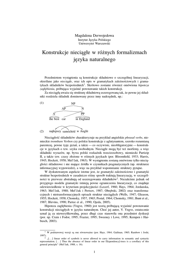 Magdalena Derwojedowa Instytut Języka Polskiego Uniwersytet Warszawski Konstrukcje nieciągłe w różnych formalizmach języka naturalnego Przedmiotem wystąpienia są konstrukcje składniowe o szczególnej linearyzacji, określane jako nieciągłe, oraz ich opis w gramatykach zależnościowych i gramatykach składników bezpośrednich1 . Skrótowo zostanie również omówiona hipoteza zagłębienia, próbująca wyjaśnić powstawanie takich konstrukcji. Za nieciągłą uważa się strukturę składniową uszeregowaną tak, że pewne jej składniki rozdziela składnik dominowany przez inny nadrzędnik, np.: (1) NP dddddddZZZZZZZ N AP ddddddd]]]]]]]]]j]j]j]j]j j A’ jjj eePP ee eYYYYY hhhhVVVV jjjj the best car in England $ najlepszy samochód w Anglii (2) Nieciągłość składników charakteryzuje na przykład angielskie phrasal verbs, niemieckie trennbare Verben czy polskie konstrukcje z aglutynantem, szeroko rozumianą parentezę, pewne typy pytań, a także — co oczywiste, nieobligatoryjnie — konstrukcje w językach o tzw. szyku swobodnym. Nieciągłe mogą być też morfemy, a więc składniki wyrazów, np. bywa polski rozkaźnik trzecioosobowy, niemiecki Partizip II, a także tzw. czasy złożone w różnych językach (por. Bloomfield, 1933; Harris, 1945; Hockett, 1958; Mel’čuk, 1963). W wystąpieniu zostaną omówione tylko nieciągłości składniowe i nie mające źródła w czynnikach pragmatycznych (np. strukturze informacyjnej wypowiedzi), a więc na przykład wspomnianie struktury pytajne. W dyskutowanym aspekcie istotne jest, że gramatyki zależnościowe i gramatyki struktur bezpośrednich w zasadniczo różny sposób traktują linearyzację, w szczególności te pierwsze abstrahują od uszeregowania składników2 . Niezależnie jednak od przyjętego modelu gramatyki istnieją pewne ograniczenia linearyzacji, co znajduje odzwierciedlenie w kryterium projekcyjności (Lecerf, 1960; Hays, 1964; Jordanska, 1963; Mel’čuk, 1988; Mel’čuk i Pertsov, 1987; Obrębski, 2002) oraz transformacyjnych i nietransformacyjnych opisach struktur nieciągłych (Wells, 1947; Gleason, 1955; Hockett, 1958; Chomsky, 1957, 1965; Postal, 1964; Chomsky, 1981; Bunt et al., 1987; Blevins, 1990; Partee et al., 1990; Ojeda, 2005). Hipoteza zagłębienia (Yngve, 1960) jest teorią próbującą wyjaśnić powstawanie konstrukcji nieciągłych w języku naturalnym. Choć jej autor, V. Yngve, ostatecznie uznał ją za nieweryfikowalną, przez długi czas stanowiła ona przedmiot dyskusji (por. np. Crain i Fodor, 1995; Frazier, 1995; Sweeney i Love, 1995; Kempen i Harbusch, 2003). 1 W podstawowej wersji są one równoważne (por. Hays, 1964; Gaifman, 1965; Rambow i Joshi, 1997). 2 „[. . . ] linear order of symbols is never allowed to carry information in semantic and syntactic representation; [. . . ] Thus the absence of linear order in our D[ependency]-trees is a corollary of this general principle” (Mel’čuk, 1988, s. 16). 1 Literatura Blevins J.P., Syntactic Complexity. Evidence for Discontinuity and Multidomination. Rozprawa doktorska, University of Massachusets, Amherst 1990. Bloomfield L., Language. New York 1933. Bunt H., Thesingh J. i van der Sloot K., Discontinuous constituent in trees, rules, and parsing. [w:] Proceedings of the 3rd conference of the EACL, s. 203–210, Copenhagen 1987. Chomsky N., Syntactic Structures. Mouton & Co. 1957. Chomsky N., Aspects of Theory of Syntax. MIT Press 1965. (Zagadnienia teorii składni, tłum. I. Jakubczak, Wrocław 1982). Chomsky N., Lectures on Government and Binding. Dodrecht 1981. Crain S. i Fodor J.D., How Can Grammar Help Parsers. [w:] Dowty, Kartunnen i Zwicky (1987), s. 94–128. Dowty, R., L. Kartunnen i A. Zwicky (red.), Natural Language Processing, Cambridge University Press 1995. Frazier L., Syntactic Complexity. [w:] Dowty, Kartunnen i Zwicky (1987), s. 145–172, Gaifman H., Dependency Systems And Phrase-Structure Systems. Information and Control, 8 s. 304–307 1965. Gleason H.A., An Introduction to Descriptive Linguistics. New York: Holt 1955. Harris Z.S., Discontinuous Morphemes. Language, 21 (3) s. 121–127 1945. Hays D.G., Dependency Theory: a Formalism and Some Observations. Language, 40 (4) s. 511–525 1964. Hockett C., A Course in Modern Linguistic. New York: Macmillan 1958. (Kurs językoznawstwa współczesnego, tłum. Z. Topolińska i M. Jurkowski, Warszawa 1968). Jordanska L., O nekotoryh svo$istvah pravil~no$i sintaksiqesko$i struktury. Voprosy zykoznani, 4 s. 103–112 1963. Kempen G. i Harbusch K., Word order scrambling as a consequence of incremental sentence production. [w:] K. Härtl T. Holden i H. Tappe (red.), Mediating between Concepts and Grammar, s. 141–164, Berlin: Mouton De Gruyter 2003. Lecerf Y., Programme des conflits, modèle des conflits. La Traduction Automatique, 4–5 1960. Mel~quk I.A., O «vnutrienno$i fleksii» v indoevrope$iskih i semitskih zykah. Voprosy zykoznani, 3 1963. Mel’čuk I.A., Dependency Syntax: Theory and Practice. State University of New York Press 1988. Mel’čuk I.A. i Pertsov N., Surface Syntax of English. A Formal Model within the Meaning-Text Framework, Linguistic and Literary Studies in Eastern Europe 13. John Benjamins 1987. Obrębski T., Automatyczna analiza składniowa języka polskiego z wykorzystaniem gramatyki zależnościowej. Rozprawa doktorska, IPI PAN 2002. Ojeda A., Discontinuous Constituents. [w:] K. Brown (red.) Encyclopedia of Language and Linguistics, t. 1–14, t. 3, wyd 2., s. 624–630, Elsevier 2005, Partee B.H., ter Meulen A. i Wall R., Mathematical Methods in Linguistics. Dordrecht, Boston, London: Kluwer Academic Publishers 1990. Postal P., Constituent Structure: a Study of Contemporary Models of Syntactic Description. Bloomington 1964. Rambow O. i Joshi, A.,A Formal Look at Dependency Grammars and Phrase-Structure Grammars, with Special Consideration of Word-Order Phenomena. [w:] L. Wanner (red.), Recent Issues in Meaning-Text Theory, s. 167