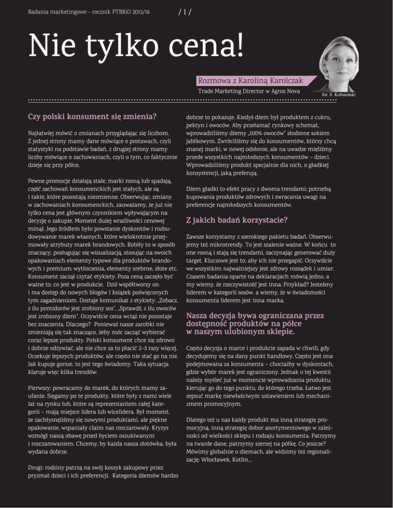 Badania marketingowe - rocznik PTBRiO 2015/16 //47 1 // Nie tylko cena! Rozmowa z Karoliną Karolczak Trade Marketing Director w Agros Nova Czy polski konsument się zmienia? Najłatwiej mówić o zmianach przyglądając się liczbom. Z jednej strony mamy dane mówiące o postawach, czyli statystyki na podstawie badań, z drugiej strony mamy liczby mówiące o zachowaniach, czyli o tym, co faktycznie dzieje się przy półce. Pewne promocje działają stale, marki rosną lub spadają, część zachowań konsumenckich jest stałych, ale są i takie, które pozostają niezmienne. Obserwując, zmiany w zachowaniach konsumenckich, zauważamy, że już nie tylko cena jest głównym czynnikiem wpływającym na decyzję o zakupie. Moment dużej wrażliwości cenowej minął. Jego źródłem było powstanie dyskontów i rozbudowywanie marek własnych, które wielokrotnie przejmowały atrybuty marek brandowych. Robiły to w sposób znaczący, posługując się wizualizacją, stosując na swoich opakowaniach elementy typowe dla produktów brandowych i premium: wytłoczenia, elementy srebrne, złote etc. Konsument zaczął czytać etykiety. Poza ceną zaczęło być ważne to, co jest w produkcie. Dziś współtworzy on i ma dostęp do nowych blogów i książek poświęconych tym zagadnieniom. Dostaje komunikat z etykiety: „Zobacz, z ilu pomidorów jest zrobiony sos”, „Sprawdź, z ilu owoców jest zrobiony dżem”. Oczywiście cena wciąż nie pozostaje bez znaczenia. Dlaczego? Ponieważ nasze zarobki nie zmieniają się tak znacząco, żeby móc zacząć wybierać coraz lepsze produkty. Polski konsument chce się zdrowo i dobrze odżywiać, ale nie chce za to płacić 2–3 razy więcej. Oczekuje lepszych produktów, ale często nie stać go na nie. Jak kupuje gorsze, to jest tego świadomy. Taka sytuacja klaruje więc kilka trendów: Pierwszy: powracamy do marek, do których mamy zaufanie. Sięgamy po te produkty, które były z nami wiele lat na rynku lub, które są reprezentantem całej kategorii – mają miejsce lidera lub wicelidera. Był moment, że zachłysnęliśmy się nowymi produktami, ale piękne opakowanie, wspaniały claim nas rozczarowały. Kryzys wzmógł naszą obawę przed byciem oszukiwanym i rozczarowaniem. Chcemy, by każda nasza złotówka, była wydana dobrze. Drugi: rodziny patrzą na swój koszyk zakupowy przez pryzmat dzieci i ich preferencji. Kategoria dżemów bardzo dobrze to pokazuje. Kiedyś dżem był produktem z cukru, pektyn i owoców. Aby przełamać rynkowy schemat, wprowadziliśmy dżemy „100% owoców” słodzone sokiem jabłkowym. Zwróciliśmy się do konsumentów, którzy chcą znanej marki, w nowej odsłonie, ale na uwadze mięliśmy przede wszystkich najmłodszych konsumentów – dzieci. Wprowadziliśmy produkt specjalnie dla nich, o gładkiej konsystencji, jaką preferują. Dżem gładki to efekt pracy z dwoma trendami: potrzebą kupowania produktów zdrowych i zwracania uwagi na preferencje najmłodszych konsumentów. Z jakich badań korzystacie? Zawsze korzystamy z szerokiego pakietu badań. Obserwujemy też mikrotrendy. To jest szalenie ważne. W końcu to one rosną i stają się trendami, zaczynając generować duży target. Kluczowe jest to, aby ich nie przegapić. Oczywiście we wszystkim najważniejszy jest zdrowy rozsądek i umiar. Czasem badania oparte na deklaracjach mówią jedno, a my wiemy, że rzeczywistość jest inna. Przykład? Jesteśmy liderem w kategorii sosów, a wiemy, że w świadomości konsumenta liderem jest inna marka. Nasza decyzja bywa ograniczana przez dostępność produktów na półce w naszym ulubionym sklepie. Często decyzja o marce i produkcie zapada w chwili, gdy decydujemy się na dany punkt handlowy. Często jest ona podejmowana za konsumenta – chociażby w dyskontach, gdzie wybór marek jest ograniczony. Jednak o tej kwestii należy myśleć już w momencie wprowadzania produktu, kierując go do tego punktu, do którego trzeba. Łatwo jest zepsuć markę niewłaściwym ustawieniem lub mechanizmem promocyjnym. Dlatego też u nas każdy produkt ma inną strategię promocyjną, inną strategię dobor asortymentowego w zależności od wielkości sklepu i rodzaju konsumenta. Patrzymy na twarde dane, patrzymy szerzej na półkę. Co jeszcze? Mówimy globalnie o dżemach, ale widzimy też regionalizację: Włocławek, Kotlin... Badania marketingowe - rocznik PTBRiO 2015/16 /2/ To też ciekawe, bo 30-letnia konsumentka, która jest corem waszej grupy docelowej, nie ma prawa tego wiedzieć. Rozumiem, że to przechodzi z matki na córkę. Spróbujmy podsumować zaobserwowane trendy. Już wiemy, że na pewno nie zawsze cena jest determinantą wyboru marki. Co zatem poza nią jest czynnikiem wpływającym na decyzję? Trend widoczny w krajach zachodnich: skupienie na kreowaniu własnego wizerunku poprzez budowanie samoświadomości, postaw wewnętrznych. Mniej liczą się doznania tu i teraz. Ważna jest wartość trwała, która z nami zostanie. Płacę za efekty, które zostanę ze mną w przyszłości. Są one zależne tylko ode mnie, zostaną ze mną niezależnie od zmian zewnętrznych. Płacę cenę za to, że dłużej będę stabilną i silną jednostką. Liczy się hart ducha, nie etykietka i bluza adidasa. Efektem jest wzrost suplementów diety czy wszelkich produktów, które budują nas od środka. Zawsze cena versus jakość. Płacąc określoną cenę, zgadzamy się na określoną jakość. Płacąc najmniej, zgadzamy się na rozwodnienie albo mniejszą wydajność. Wybierając markę z półki środkowej, którą wybiera tak zwany konsument racjonalny, zgadzamy się zapłacić określoną cenę i mamy określone wymagania. Jeżeli marka spełnia te wymagania, konsument do niej wraca. W przypadku produktów z najwyższej półki, konsument zgadza się zapłacić więcej w zamian za selektywność, za wartości dodane. Trend matko-córek: dzieci i ich świadomość oraz preferencje mocno wpływają 