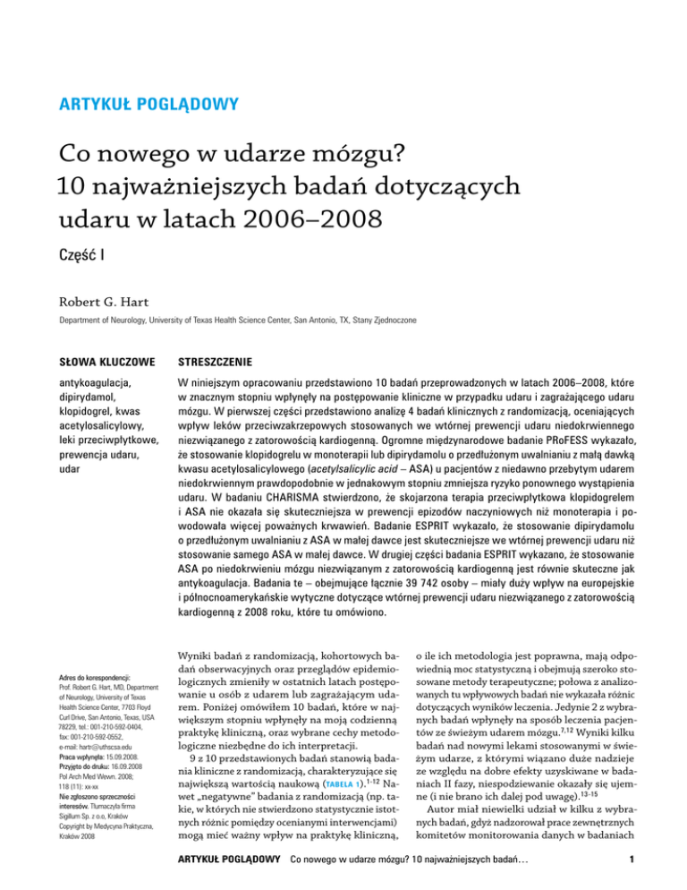 ARTYKUŁ POGLĄDOWY Co nowego w udarze mózgu? 10 najważniejszych badań dotyczących udaru w latach 2006–2008 Część I Robert G. Hart Department of Neurology, University of Texas Health Science Center, San Antonio, TX, Stany Zjednoczone SŁOWA KLUCZOWE STRESZCZENIE antykoagulacja, dipirydamol, klopidogrel, kwas acetylosalicylowy, leki przeciwpłytkowe, prewencja udaru, udar W niniejszym opracowaniu przedstawiono 10 badań przeprowadzonych w latach 2006–2008, które w znacznym stopniu wpłynęły na postępowanie kliniczne w przypadku udaru i zagrażającego udaru mózgu. W pierwszej części przedstawiono analizę 4 badań klinicznych z randomizacją, oceniających wpływ leków przeciwzakrzepowych stosowanych we wtórnej prewencji udaru niedokrwiennego niezwiązanego z zatorowością kardiogenną. Ogromne międzynarodowe badanie PRoFESS wykazało, że stosowanie klopidogrelu w monoterapii lub dipirydamolu o przedłużonym uwalnianiu z małą dawką kwasu acetylosalicylowego (acetylsalicylic acid – ASA) u pacjentów z niedawno przebytym udarem niedokrwiennym prawdopodobnie w jednakowym stopniu zmniejsza ryzyko ponownego wystąpienia udaru. W badaniu CHARISMA stwierdzono, że skojarzona terapia przeciwpłytkowa klopidogrelem i ASA nie okazała się skuteczniejsza w prewencji epizodów naczyniowych niż monoterapia i po‑ wodowała więcej poważnych krwawień. Badanie ESPRIT wykazało, że stosowanie dipirydamolu o przedłużonym uwalnianiu z ASA w małej dawce jest skuteczniejsze we wtórnej prewencji udaru niż stosowanie samego ASA w małej dawce. W drugiej części badania ESPRIT wykazano, że stosowanie ASA po niedokrwieniu mózgu niezwiązanym z zatorowością kardiogenną jest równie skuteczne jak antykoagulacja. Badania te – obejmujące łącznie 39 742 osoby – miały duży wpływ na europejskie i północnoamerykańskie wytyczne dotyczące wtórnej prewencji udaru niezwiązanego z zatorowością kardiogenną z 2008 roku, które tu omówiono. Adres do korespondencji: Prof. Robert G. Hart, MD, Department of Neurology, University of Texas Health Science Center, 7703 Floyd Curl Drive, San Antonio, Texas, USA 78229, tel.: 001‑210‑592‑0404, fax: 001‑210‑592‑0552, e‑mail: [email protected] Praca wpłynęła: 15.09.2008. Przyjęto do druku: 16.09.2008 Pol Arch Med Wewn. 2008; 118 (11): xx‑xx Nie zgłoszono sprzeczności interesów. Tłumaczyła firma Sigillum Sp. z o.o, Kraków Copyright by Medycyna Praktyczna, Kraków 2008 Wyniki badań z randomizacją, kohortowych ba dań obserwacyjnych oraz przeglądów epidemio logicznych zmieniły w ostatnich latach postępo wanie u osób z udarem lub zagrażającym uda rem. Poniżej omówiłem 10 badań, które w naj większym stopniu wpłynęły na moją codzienną praktykę kliniczną, oraz wybrane cechy metodo logiczne niezbędne do ich interpretacji. 9 z 10 przedstawionych badań stanowią bada nia kliniczne z randomizacją, charakteryzujące się największą wartością naukową (TABELA 1 ).1‑12 Na wet „negatywne” badania z randomizacją (np. ta kie, w których nie stwierdzono statystycznie istot nych różnic pomiędzy ocenianymi interwencjami) mogą mieć ważny wpływ na praktykę kliniczną, o ile ich metodologia jest poprawna, mają odpo wiednią moc statystyczną i obejmują szeroko sto sowane metody terapeutyczne; połowa z analizo wanych tu wpływowych badań nie wykazała różnic dotyczących wyników leczenia. Jedynie 2 z wybra nych badań wpłynęły na sposób leczenia pacjen tów ze świeżym udarem mózgu.7,12 Wyniki kilku badań nad nowymi lekami stosowanymi w świe żym udarze, z którymi wiązano duże nadzieje ze względu na dobre efekty uzyskiwane w bada niach II fazy, niespodziewanie okazały się ujem ne (i nie brano ich dalej pod uwagę).13‑15 Autor miał niewielki udział w kilku z wybra nych badań, gdyż nadzorował prace zewnętrznych komitetów monitorowania danych w badaniach ARTYKUŁ POGLĄDOWY Co nowego w udarze mózgu? 10 najważniejszych badań… 1 Tabela 1 10 najważniejszych badań dotyczących udaru mózgu przeprowadzonych w latach 2006–2008 1 Klopidogrel vs dipirydamol o przedłużonym uwalnianiu z kwasem acetylosalicylowym w małej dawce mają podobną skuteczność po udarze niedokrwiennym (badanie PRoFESS)1 2 Skojarzona terapia przeciwpłytkowa klopidogrelem i kwasem acetylosalicylowym nie jest skuteczniejsza niż monoterapia w prewencji epizodów naczyniowych i wywołuje więcej poważnych krwawień (badanie CHARISMA)2 3 Dipirydamol o przedłużonym uwalnianiu z kwasem acetylosalicylowym w małej dawce są skuteczniejsze niż sam kwas acetylosalicylowy w małej dawce we wtórnej prewencji udaru (badanie ESPRIT)3 4 Kwas acetylosalicylowy jest tak samo skuteczny jak antykoagulacja po niedokrwieniu mózgu niezwiązanym z zatorowością kardiogenną (badanie ESPRIT)4 5 Skala punktowa ABCD2 pozwala ocenić krótkoterminowe ryzyko udaru po napadzie przemijającego niedokrwienia mózgu5 6 Atorwastatyna w dużej dawce zmniejsza ryzyko ponownego udaru, ale z dużym prawdopodobieństwem zwiększa ryzyko krwawienia do OUN (badanie SPARCL)6 7 Dożylne podanie tkankowego aktywatora plazminogenu jest korzystne po upływie 3–4,5 h od wystąpienia objawów udaru (badanie ECASS III)7 8 Stosowanie warfaryny u pacjentów w zaawansowanym wieku z migotaniem przedsionków jest skuteczne i bezpieczne (badanie BAFTA)8 9 Angioplastyka/stentowanie tętnicy szyjnej vs endarterektomia? (badanie SAPPHIRE, EVA‑3S oraz SPACE)9-11 10 Enoksaparyna vs heparyna niefrakcjonowana w prewencji żylnej choroby zakrzepowo-zatorowej po świeżym udarze niedokrwiennym (badanie PREVAIL)12 CHARISMA,2 SPARCL6 oraz BAFTA8 i pełnił funk cję zastępcy kierownika w badaniach PRoFESS1 oraz PREVAIL.12 Niniejsze opracowanie poświęcono pierwszym 4 badaniom – badaniom klinicznym z randomi zacją przeprowadzonym na łącznej grupie 39 742 osób otrzymujących leki przeciwzakrzepowe w ra mach wtórnej pre