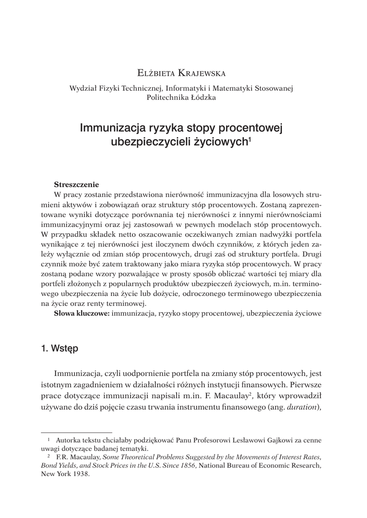 Słowa kluczowe: immunizacja, ryzyko stopy procentowej, ubezpieczenia życiowe