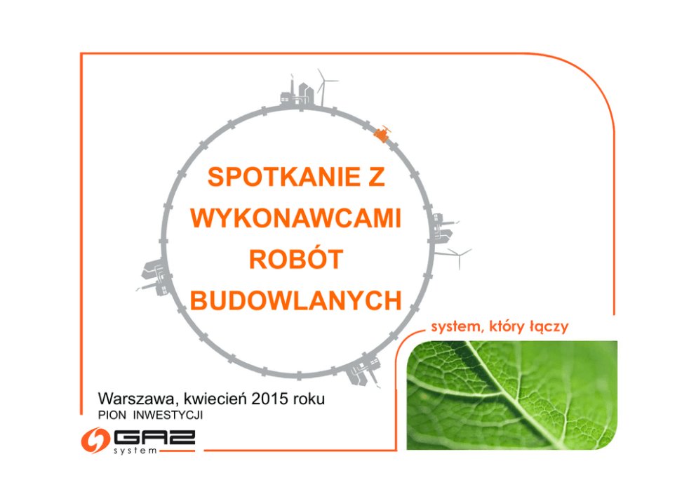 SPOTKANIE Z WYKONAWCAMI ROBÓT BUDOWLANYCH system, który łączy system, który łączy Warszawa, kwiecień 2015 roku PION INWESTYCJI Plan Inwestycyjny na lata 2015-2017 dla majątku Operatora Gazociągów Przesyłowych GAZ-SYSTEM S.A. system, który łączy 3 Lista inwestycji kluczowych realizowanych do 2023 INWESTYCJE W PERSPEKTYWIE 2015 r. Planowana wartość 32 inwestycji w perspektywie 2015r.: 1 826,5 mln zł 1 31 Planowana wartość inwestycji w perspektywie 2 2018r.: 4 378,8 mln zł 3 36 14 18 4 16 34 24 26 25 1 Szczecin – Gdańsk (etap I-IV) (gazociąg wybudowany, trwają odbiory) 2 Szczecin – Lwówek (II etap gazociągu wybudowany, trwają odbiory) 3 Rembelszczyzna – Gustorzyn (gazociąg wybudowany, trwają odbiory) 4 Węzeł Rembelszczyzna 5 Lasów – Jeleniów 6 Gałów – Kiełczów 7 Czeszów – Wierzchowice 8 Czeszów – Kiełczów INWESTYCJE W PERSPEKTYWIE 2018r. 9 Zdzieszowice – Wrocław 10 Zdzieszowice – Kędzierzyn 11 Polska – Czechy 12 Tworóg – Kędzierzyn 13 Tworóg – Tworzeń 14 Lwówek – Odolanów 15 Hermanowice – Strachocina 16 Rembelszczyzna – Mory 17 Tłocznia Jeleniów II 18 Tłocznia Rembelszczyzna 19 Tłocznia Kędzierzyn 20 Tłocznia Odolanów (etap 0) 21 Węzeł w Lwówku INWESTYCJE W PERSPEKTYWIE 2023r. 20 5 6 17 7 Planowana 22 Pogórska Wola – Tworzeń 23 Strachocina – Pogórska Wola 8 wartość inwestycji 24 Leśniewice – Łódź w perspektywie 25 Mory – Wola Karczewska** 26 Rembelszczyzna – Wronów 2023r. 27 Rozwadów – Końskowola – Wronów 28 Jarosław – Rozwadów 27 9 13 10 28 (bez uwzględnienia 29 22 12 Tłoczni Gustorzyn): 19 5 301,2 mln zł 11 29 35 23 15 Hermanowice – Jarosław 30 Polska – Słowacja 31 Polska – Litwa 32 Szczecin – Gdańsk (etap VI) (Wiczlino – Reszki) 33 Jarosław - Głuchów 34 Rozbudowa Tłoczni Rembelszczyzna (etap III) Litwa 35 Tłocznia Strachocina 36 Tłocznia Gustorzyn 30 system, który łączy Ilość i wartość zadań w Planie Inwestycyjnym na lata 2015-2017 Ilość zadań Kierunki inwestowania [szt.] w tym: rozwój bezpieczeństwo ilość zadań [szt.] wartość [tys. zł.] ilość zadań [szt.] wartość [tys. zł.] w tym: System przesyłowy gazu ziemnego 603 233 13 845 163,5 356 592 841,2 A Gazociągi systemowe 197 104 11 910 103,8 93 333 462,1 C Tłocznie gazu 38 8 980 689,3 30 54 245,1 D Węzły systemowe 36 12 125 124,0 24 46 194,2 B Stacje gazowe, układy pomiarowe, system telemetrii 232 51 157 936,1 181 123 307,9 G Przyłączenia do sieci przesyłowej obiektów i miejscowości 36 36 415 562,0 _ F Obiekty zaplecza technicznego i administracji 49 21 228 908,3 28 E Inne obiekty technologiczne 1 1 26 840,0 _ _ H Różne (w tym: dokumentacja przyszłościowa, wykupy gruntów, wykupy służebności) 14 _ _ _ _ _ 35 632,0 system, który łączy 4 5 Zadania ujęte w Planie Inwestycyjnym na lata 2015-2017 ZOBOWIĄZANIA 2015-2017 Gazociągi systemowe 7 994 688,55 tys. zł. ROZWÓJ – BUDOWA KORYTARZA PRZESYŁOWEGO PÓŁNOC-POŁUDNIE W Planie Inwestycyjnym na lata 2015-2017 zostały ujęte nast. gazociągi w ramach Budowy korytarza przesyłowego północpołudnie Program rozwoju Korytarza Północ-Południe na obszarze zachodniej i południowej Polski – odcinek zachodni – gazociąg Lwówek-Odolanów, gazociąg Czeszów-Kiełczów, gazociąg Czeszów-Wierzchowice, gazociąg Zdzieszowice-Wrocław, gazociąg Zdzieszowice-Kędzierzyn Koźle, gazociąg Tworóg-Kędzierzyn Koźle, gazociąg Tworóg-Tworzeń Program rozwoju Korytarza Północ-Południe na obszarze zachodniej i południowej Polski – odcinek południowy – gazociąg Hermanowice-Strachocina, gazociąg Strachocina-Pogórska Wola, gazociąg Pogórska Wola-Tworzeń ROZWÓJ – ROZBUDOWA SYSTEMU NA DOLNYM ŚLĄSKU W Planie Inwestycyjnym na lata 2015-2017 zostały ujęte nast. gazociągi w ramach Rozbudowy systemu na Dolnym Śląsku: Gazociąg Lasów – Jeleniów, Gazociąg Gałów - Kiełczów ROZWÓJ – POŁĄCZENIA TRANSGRANICZNE Połączenie Polska-Słowacja, Połączenie Polska-Czechy, Połączenie Polska-Litwa Inwestycje transgraniczne w sektorze gazowym są kluczowym elementem urzeczywistnienia jednolitego rynku gazu w Europie. Mogą one zwiększyć konkurencyjność państw Wspólnoty i bezpieczeństwo energetyczne na terenie Unii Europejskiej. system, który łączy 6 Zadania ujęte w Planie Inwestycyjnym na lata 2015-2017 ZOBOWIĄZANIA 2015-2017 Tłocznie gazu 553 869,04 tys. zł. ROZWÓJ – ELEMENTY KORYTARZA PRZESYŁOWEGO PÓŁNOC-POŁUDNIE W Planie Inwestycyjnym na lata 2015-2017 w tej grupie są: Budowa Tłoczni Jeleniów 2, Budowa Tłoczni Odolanów. ROZWÓJ – ELEMENTY WSPÓŁPRACUJĄCE Z POŁĄCZENIAMI TRANSGRANICZNYMI ‚Budowa Tłoczni Gustorzyn – element w zakresie Połączenia Polska-Litwa’ Budowa Tłoczni Kędzierzyn – element w zakresie Połączenia Polska-Czechy Budowa Tłoczni Strachocina – element w zakresie Połączenia Polska-Słowacja Rozbudowa Tłoczni Rembelszczyzna – element w zakresie Połączenia Polska-Litwa ZOBOWIĄZANIA 2015-2017 Węzły systemowe 64 667,30 tys. zł. ROZWÓJ W Planie Inwestycyjnym na lata 2015-2017 najważniejszymi inwestycjami w tej grupie są: Węzeł Rembelszczyzna, Przebudowa Węzła Warzyce, Węzeł Jeleniów, Przebudowa Węzła w Łukanowicach, Węzeł Sędziszów – przebudowa części technologicznej. system, który łączy 7 Zadania ujęte w Planie Inwestycyjnym na lata 2015-2017 ZOBOWIĄZANIA 2015-2017 Stacje gazowe, układy pomiarowe, system telemetrii 205 147,89 tys. zł. ROZWÓJ W Planie Inwestycyjnym na lata 2015-2017 są m.in. nast. zadania: • budowa stacji Jelenia Góra ul. Sobieskiego, • budowa stacji regulacyjno-redukcyjnej Czeszów, • budowa stacji pomiarowych: Meszcze, Czechówka na kierunek Zakopane, Kiełczów kierunek Oleśnica, • budowa nast. stacji: Przywory 1, Przywory 2, Obrowiec, Nysa, • budowa laboratorium wzorcowania gazomierzy przy ciśnieniu roboczym na terenie TJE Hołowczyce. system, który łączy 