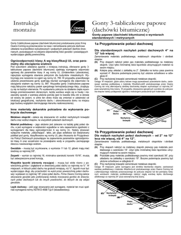 Instrukcja montażu Gonty 3-tabliczkowe papowe (dachówki bitumiczne) Gonty papowe (dachówki bitumiczne) o wymiarach standardowych i metrycznych Gonty 3-tabliczkowe papowe (dachówki bitumiczne) produkowane przez firmę Owens Corning są przeznaczone na nowe i remontowane pokrycia dachowe układane na prawidłowo wybudowanych i podpartych połaciach dachów drewnianych, pozwalających na wbijanie odpowiedniej ilości gwoździ i posiadających wystarczająco gładką powierzchnię. Ognioodporność klasy A wg klasyfikacji UL oraz parametry dla obciążenia wiatrem Pod warunkiem układania zgodnie z niniejszą instrukcją, oferowane gonty 3tabliczkowe papowe (dachówki bitumiczne) spełniają wymagania odporności ogniowej dla parametrów klasy A wg normy UL (Underwriters Laboratories), najwyższe wymagania stawiane pokryciom dla budynków mieszkalnych. Wytrzymają one narażenie na ogień wg normy UL 790. W przypadku prawidłowego ułożenia prezentowane gonty spełniają również wymagania dla odporności na obciążenie wiatrem wg normy UL 997. Wszystkie gonty 3-tabliczkowe papowe mają fabrycznie nałożony pasek specjalnego termoplastycznego kleju, znajdujący się na każdym elemencie. Po wystawieniu pokrycia na działanie ciepła wywołanego promieniowaniem słonecznym, każda warstwa wiąże się w trwały i niezawodny sposób z warstwą ułożona poniżej (jest to kwestia kilku dni w okresie od wiosny do jesieni, w zimie ten okres może się zmieniać w zależności od lokalizacji geograficznej, nachylenia dachu i ukierunkowania domu na miejscu jego budowy względem dominującego kierunku nasłonecznienia). Inne materiały dekarskie potrzebne do wykonania pokrycia dachowego 1a Przygotowanie połaci dachowej Dla standardowych nachyleń połaci dachowych 4” na 12” lub więcej Zamontowanie materiału podkładowego, metalowych okapników i obróbek okapów: (A) Przy okapach nałożyć jeden pas materiału podkładowego na metalowy okapnik. Użyć tylko minimalnej ilości łączników utrzymujących materiał na swoim miejscu. (B) Kolejne pasy układać z zakładką na 2”. Zakładka na końcu pasa powinna wynosić 4”. Boczne podwinięcia powinny być ułożone schodkowo w odległości 6’. (C) Przy nachylonej krawędzi zamontować metalowe okapniki. Uwaga: W miejscach, gdzie zatory lodowe mogą spowodować przeciekanie dachu, zastosować warstwę podkładową z materiału WeatherLock® produkowanego przez Owens Corning lub inną alternatywną obróbkę blacharską okapów wychodzące co najmniej 24” poza wewnętrzną linię ściany. W przypadku stosowania specjalnych wyrobów do pokrywania okapów należy postępować zgodnie z instrukcjami producenta tych materiałów. Połać dachu Metalowe okapniki - zaleca się stosowanie ich wzdłuż nachylonych krawędzi dachu oraz wzdłuż okapów, na wszystkich połaciach dachowych. Materiał podkładowy – jego ułożenie jest zalecane na każdej gołej połaci dachu, a jest wymagane w większości wypadków w celu zapewnienia zgodności z wymaganiami dla klasy ognioodporności A wg normy UL. Należy stosować wyłącznie materiały „oddychające”, takie, jak papa asfaltowa lub dedykowany podkład pod gonty, klasyfikowane wg normy UL jako Akcesoria do Przygotowania Pokryć Dachowych pozwalające na zapewnienie parametrów ognioodporności klasy A oraz szczelności na przesiąkanie wody w przypadku zacinającego deszczu nawiewanego wiatrem. Gwoździe – muszą być ocynkowane, o wymiarze 11 lub 12, główki mają mieć średnicę co najmniej 3/8”, Zszywki – wymiar co najmniej 16, minimalna szerokość koronki 15/16”, muszą być zabezpieczone przed korozją. Wszystkie łączniki (elementy mocujące) – muszą być wbite równo z powierzchnią gontów i zagłębione w drewnianą polać dachu co najmniej na ¾”. W miejscach, w których połać dachu ma grubość mniejszą, niż ¾”, łącznik musi być wystarczająco długi, aby przechodzić na wylot przez powierzchnię połaci dachowej i wystawać co najmniej 1/8” przez połać dachu. Firma Owens Corning zaleca stosowanie gwoździ jako preferowanej metody mocowania gontów do drewnianych połaci dachowych lub do innych powierzchni, do których da się wbijać gwoździe. Nachylona krawędź Okap 1b Przygotowanie połaci dachowej Dla małych nachyleń połaci dachowych – od 2” na 12” lecz nie więcej, niż 4” na 12”. Zamontowanie materiału podkładowego, metalowych okapników i obróbek okapów: (A) Przy okapach nałożyć na metalowy okapnik pierwszy pas materiału podkładowego o szerokości 19”. Użyć tylko minimalnej ilości łączników utrzymujących materiał na swoim miejscu. (B) Pozostałe pasy materiału podkładowego powinny mieć szerokość 36”, przy układaniu na zakładkę o szerokości 19”. Boczne podwinięcia powinny być ułożone schodkowo w odległości 6’. (C) Przy nachylonej krawędzi zamontować metalowe okapniki. Uwaga: W miejscach, gdzie wymagana jest obróbka blacharska okapów, zastosować warstwę podkładową z materiału WeatherLock produkowanego przez Owens Corning lub z alternatywnego materiału przeznaczonego do pokrycia okapów lub też pomiędzy kolejnymi warstwami materiału podkładowego nałożyć ciągłą warstwę lepiku dachowego asfaltowego co najmniej 24” poza wewnętrzną linię ściany. Lepik dachowy – jeśli jego stosowanie jest wymagane, materiał ten musi spełniać wymagania normy ASTM D-4568 Typ II (bezazbestowy). Nachylona krawędź Połać dachu Okap Gonty (dachówki bitumiczne) o wymiarach standardowych i metrycznych Gonty 3-tabliczkowe (dachówki bitumiczne) 2 Układanie gontów (dachówek bitumicznych) Gonty należy układać na prawidłowo przygotowanej powierzchni połaci dachowej, rozpoczynając od dołu dachu i posuwając się rzędami w górę. Spowoduje to przemieszanie się gontów pochodzących z jednej paczki i zminimalizuje efekt różnicy odcieni gontów w poszczególnych paczk