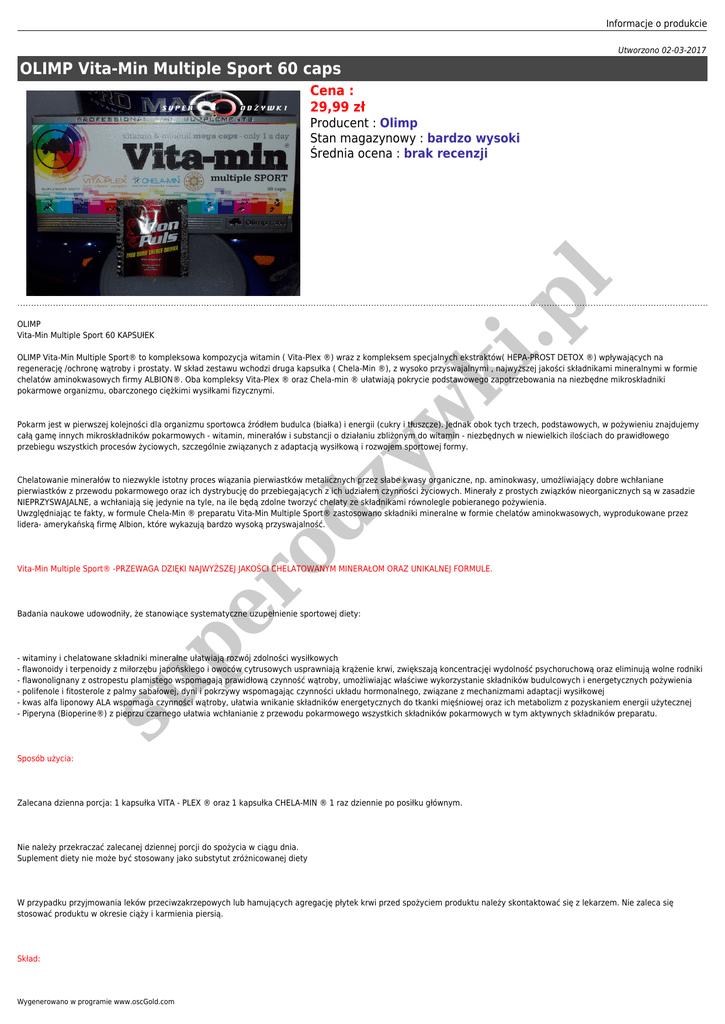Informacje o produkcie Utworzono 02-03-2017 OLIMP Vita-Min Multiple Sport 60 caps Cena : 29,99 zł .p l Producent : Olimp Stan magazynowy : bardzo wysoki Średnia ocena : brak recenzji ki OLIMP Vita-Min Multiple Sport 60 KAPSUłEK w OLIMP Vita-Min Multiple Sport® to kompleksowa kompozycja witamin ( Vita-Plex ®) wraz z kompleksem specjalnych ekstraktów( HEPA-PROST DETOX ®) wpływających na regenerację /ochronę wątroby i prostaty. W skład zestawu wchodzi druga kapsułka ( Chela-Min ®), z wysoko przyswajalnymi , najwyższej jakości składnikami mineralnymi w formie chelatów aminokwasowych firmy ALBION®. Oba kompleksy Vita-Plex ® oraz Chela-min ® ułatwiają pokrycie podstawowego zapotrzebowania na niezbędne mikroskładniki pokarmowe organizmu, obarczonego ciężkimi wysiłkami fizycznymi. ro dz y Pokarm jest w pierwszej kolejności dla organizmu sportowca źródłem budulca (białka) i energii (cukry i tłuszcze). Jednak obok tych trzech, podstawowych, w pożywieniu znajdujemy całą gamę innych mikroskładników pokarmowych - witamin, minerałów i substancji o działaniu zbliżonym do witamin - niezbędnych w niewielkich ilościach do prawidłowego przebiegu wszystkich procesów życiowych, szczególnie związanych z adaptacją wysiłkową i rozwojem sportowej formy. Chelatowanie minerałów to niezwykle istotny proces wiązania pierwiastków metalicznych przez słabe kwasy organiczne, np. aminokwasy, umożliwiający dobre wchłaniane pierwiastków z przewodu pokarmowego oraz ich dystrybucję do przebiegających z ich udziałem czynności życiowych. Minerały z prostych związków nieorganicznych są w zasadzie NIEPRZYSWAJALNE, a wchłaniają się jedynie na tyle, na ile będą zdolne tworzyć chelaty ze składnikami równolegle pobieranego pożywienia. Uwzględniając te fakty, w formule Chela-Min ® preparatu Vita-Min Multiple Sport® zastosowano składniki mineralne w formie chelatów aminokwasowych, wyprodukowane przez lidera- amerykańską firmę Albion, które wykazują bardzo wysoką przyswajalność. Vita-Min Multiple Sport® -PRZEWAGA DZIĘKI NAJWYŻSZEJ JAKOŚCI CHELATOWANYM MINERAŁOM ORAZ UNIKALNEJ FORMULE. pe Badania naukowe udowodniły, że stanowiące systematyczne uzupełnienie sportowej diety: su - witaminy i chelatowane składniki mineralne ułatwiają rozwój zdolności wysiłkowych - flawonoidy i terpenoidy z miłorzębu japońskiego i owoców cytrusowych usprawniają krążenie krwi, zwiększają koncentracjęi wydolność psychoruchową oraz eliminują wolne rodniki - flawonolignany z ostropestu plamistego wspomagają prawidłową czynność wątroby, umożliwiając właściwe wykorzystanie składników budulcowych i energetycznych pożywienia - polifenole i fitosterole z palmy sabałowej, dyni i pokrzywy wspomagając czynności układu hormonalnego, związane z mechanizmami adaptacji wysiłkowej - kwas alfa liponowy ALA wspomaga czynności wątroby, ułatwia wnikanie składników energetycznych do tkanki mięśniowej oraz ich metabolizm z pozyskaniem energii użytecznej - Piperyna (Bioperine®) z pieprzu czarnego ułatwia wchłanianie z przewodu pokarmowego wszystkich składników pokarmowych w tym aktywnych składników preparatu. Sposób użycia: Zalecana dzienna porcja: 1 kapsułka VITA - PLEX ® oraz 1 kapsułka CHELA-MIN ® 1 raz dziennie po posiłku głównym. Nie należy przekraczać zalecanej dziennej porcji do spożycia w ciągu dnia. Suplement diety nie może być stosowany jako substytut zróżnicowanej diety W przypadku przyjmowania leków przeciwzakrzepowych lub hamujących agregację płytek krwi przed spożyciem produktu należy skontaktować się z lekarzem. Nie zaleca się stosować produktu w okresie ciąży i karmienia piersią. Skład: Wygenerowano w programie www.oscGold.com pe ro dz y Magnez** 80% Albion® amino acid chelate 20% magnesium oxide/ magnesium oxid /tlenek magnezu 150 mg 50% Wapń** 58% Albion® mineral 42% calcium carbonate/ kalciumkarbonat /węglan wapnia 100 mg 12,5% Potas**/# 99,9% Albion® amino acid complex 0,1% potassium iodide / kalium jod / jodek potasu 50 mg Cynk* Albion® amino acid chelate (ChelazomeŽ) 15 mg 100% Żelazo* Albion® amino acid chelate (Ferrochel) 3 mg 21% Mangan*/# Albion® amino acid chelate 3 mg - ki SKŁADNIKI MINERALNE 1 kapsułka %RDA w %ZDS- procent realizacji zalecanego dziennego spożycia przez jedną kapsułkę .p l WITAMINY 1 kapsułka %RDA %ZDS Wit. A (octan retinolu) 1600 µg 200% Wit. D3 (cholekalcyferol) 10 µg 200% Wit. E (octan tokoferolu) 20 mg 200% Wit. C (kwas askorbinowy) 250 mg 417% Wit. B1 (monoazotan tiaminy) 20 mg 1428% Wit. B2 (ryboflawina) 20 mg 1250% Niacyna 35 mg 194% Wit. B6 (chlorowodorek pirydoksyny) 20 mg 1000% Kwas foliowy 400 µg 200% Wit. B12 (cyjanokobalamina) 20 µg 2000% Biotyna (Witamina H) 300 µg 200% Kwas pantotenowy 12 mg 600% Bioflawonoidy cytrusowe 40% 100 mg Ekstrakt palmy sabałowej 45% 80 mg Ekstrakt z pestek dynii 5:1 60 mg Ekstrakt z pokrzywy zwyczajnej 60 mg Ekstrakt z nasion ostropestu plamistego 80% 50 mg w tym: Sylimaryna 40 mg Ginko biloba (Ekstrakt miłorzębu japońskiego) 24/6 10 mg ALA (kwas alfa liponowy) 10 mg Ekstrakt pieprzu czarnego (95%) 1 mg - su Miedź */# Albion® amino acid chelate (Chelazome®) 500 µg Jod 150 µg 100% Chrom*/# Albion® amino acid chelate (Chelavite®) 150 µg Selen*/# Albion® amino acid comple 75 µg - Molibden*/# Albion® amino acid chelate 50 µg - %ZDS- procent realizacji zalecanego dziennego spożycia przez jedną kapsułkę # nie jest określone zalecane dzienne spożycie *- najwyższej jakości, wysoko przyswajalne składniki mineralne (chelaty aminokwasowe minerałów, kompleksy aminokwasowo- mineralne) firmy ALBION® **-chelaty, kompleksy i sole organiczne minerałów firmy ALBION® w połączeniu z innymi związkami mineralnymi su pe ro dz y w ki .p l Informacje o produkcie Wygenerowano w programie www.oscGold.com