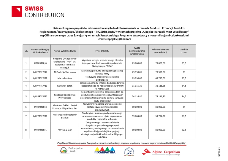Lista rankingowa projektów rekomendowanych do dofinansowania w ramach Funduszu Promocji Produktu Regionalnego/Tradycyjnego/Ekologicznego – PRZEDSIĘBIORCY w ramach projektu „Alpejsko-Karpacki Most Współpracy” współfinansowanego przez Szwajcarię w ramach Szwajcarskiego Programu Współpracy z nowymi krajami członkowskimi Unii Europejskiej (II nabór) Numer aplikacyjny Wnioskodawcy Nazwa Wnioskodawcy Tytuł projektu Kwota dofinansowania wnioskowana Rekomendowana kwota dotacji Średnia ocen 1. II/FPPRTEP/4 Rodzinne Gospodarswo Ekologiczne "FIGA" s.c. Waldemar i Tomasz Maziejuk Wymiana sprzętu produkcyjnego i środka transportu w Rodzinnym Gospodarstwie Ekologicznym "FIGA" 79 800,00 79 800,00 95,5 2. II/FPPRTEP/17 AR Szelc Spółka Jawna 79 990,06 79 990,06 93 3. II/FPPRTEP/32 Marta Brańska 69 790,00 69 790,00 85,5 4. II/FPPRTEP/11 Krzysztof Bałon 31 115,25 31 115,25 84,5 5. II/FPPRTEP/20 Fundacja Dziedzictwo Przyrodnicze 74 116,80 74 116,80 84,5 6. II/FPPRTEP/3 Markowa Zakład Uboju i Przerobu Mięsa Fołta Jan 80 000,00 80 000,00 84 7. II/FPPRTEP/31 ART-Kros studio Jaromir Brański 59 784,00 59 784,00 83,5 8. II/FPPRTEP/1 "JK" Sp. Z O.O 80 000,00 80 000,00 82,5 Marketing produktu ekologicznego szansą rozwoju firmy Tradycyjne produkty pszczelarskie podkarpacia Zakup samochodu-chłodni dla Gospodarstwa Pszczelarskiego na Podkarpaciu EKOBAŁON w Niżnej Łące Remont pomieszczenia, zakup urządzeń do produkcji ekologicznych soków tłoczonych oraz środka transportu dla dostaw surowca i zbytu produktów Rozwój firmy poprzez unowocześnienie zakładu i zwiększenie zdolności produkcyjnych Tradycyjne - suszone płody runa leśnego oraz owoce na sucho - jako zapomniane produkty regionalne w Potoku Zakup nowego i unowocześnienie dotychczas posiadanego sprzętu i wyposażenia, niezbędnego do prowadzenia wędliniarskiej produkcji tradycyjnej i ekologicznej w Dukli w Zakładzie Mięsnym JASIOŁKA Projekt współfinansowany przez Szwajcarię w ramach szwajcarskiego programu współpracy z nowymi krajami członkowskimi Unii Europejskiej Strona 1 Lp. II/FPPRTEP/23 10. II/FPPRTEP/2 11. II/FPPRTEP/10 12. II/FPPRTEP/29 13. II/FPPRTEP/8 14. II/FPPRTEP/9 15. II/FPPRTEP/16 16. II/FPPRTEP/6 17. II/FPPRTEP/15 18. II/FPPRTEP/19 19. II/FPPRTEP/25 Trafunek - Kontynuator Tradycji Kulinarnych Regionu Podkarpacia Specjalistyczne placówki handlowe w Krośnie z żywnością zdrową, tradycyjną, Beata Gosztyła ekologiczną, głównie pochodzącą od producentów lokalnych i regionalnych Poprawa jakości oferowanych produktów Zakład Pieczywa Trwałego, tradycyjnych Zakładu Pieczywa Trwałego w Bogumiła Ramska Rzeszowie poprzez inwestycję w maszyny i urządzenia Promowanie Produktu Tradycyjnego na Izabela Szczęch terenie Podkarpacia przez ZPC "IZA" Izabela Szczęch w Rzeszowie Jerzy Bańkowski Modernizacja pasieki pszczelarskiej Wzrost produkcji wyrobów tradycyjnych w Zakład Masarski Rafał zakładzie masarskim Rafał Dźwierzyński Dźwierzyński wynikiem zakupu nowoczesnego sprzętu i specjalistycznego samochodu Ulepszenie procesu pakowania płodów runa Muszyński Waldemar leśnego Zakup urządzeń i uruchomienie produkcji ziemniaka faszerowanego i placka Gościniec Janusz Jarosz rzeszowiaka - jako produktów regionalnych z Podkarpacia w restauracji Gościeniec Przedsiębiorstwo Rozszerzenie asortymentu i ekologia szansą Wielobranżowe Kurcoń rozwoju przedsiębiorstwa Wojciech UNIW-MŁYN Remont stodoły w gospodarstwie rolnym w Leszczawie Dolnej i budowa w niej pieca Elżbieta Krystyna tradycyjnego z piecem chlebowym oraz Skrzyszowska suszarni grzybów i owoców wraz z zapleczem Otwarcie sklepu z produktami tradycyjnymi, regionalnymi i lokalnymi pod zarejestrowaną P.P.U.H. TANIA Sp. Z O.O. marką "WYROBY OD BABCI" oraz wprowadzenie własnych wyrobów regionalnych i lokalnych Trafunek BIS Sp. Z O.O. 40 039,75 40 039,75 81 80 000,00 80 000,00 80 79 996,00 79 996,00 80 54 000,00 54 000,00 79,5 30 600,00 30 600,00 79 80 000,00 80 000,00 79 77 910,00 77 910,00 79 23 697,60 23 697,60 77,5 31 170,00 31 170,00 77,5 20 319,31 20 319,31 77 79 800,00 79 800,00 77 Projekt współfinansowany przez Szwajcarię w ramach szwajcarskiego programu współpracy z nowymi krajami członkowskimi Unii Europejskiej Strona 2 9. Zwiększenie konkurencyjności i rozwój firmy SOŁTYS z Mielca, poprzez zakup niezbędnego sprzetu Modernizacja pomieszczeń produkcyjnych piekarni oraz zakup sprzętu piekarniczego celem wypieku tradycyjnego pieczywa regionalnego pod nazwą chleb żytni razowy Utworzenie tradycyjnej wytwórni soku jabłkowego jako element komercjalizacji produkcji soków na terenie Albigowej 20. II/FPPRTEP/34 Potępa Mariusz SOŁTYS 21. II/FPPRTEP/13 Danuta Lachtara 22. II/FPPRTEP/30 Jacek Albigowski 23. II/FPPRTEP/14 LIGRA Grzegorz Schabiński Kulinarne Perły Podkarpacia w Jaśle 24. II/FPPRTEP/22 HERBUT ZBIGNIEW ZIBI BAR "KASYNO II" 25. II/FPPRTEP/26 Andrzej Łopata 26. II/FPPRTEP/7 Renata Glazer Firma Cukiernicza "CIACHO" 27. II/FPPRTEP/18 Agnieszka Szczucińska Poprawa zaplecza technologicznego firmy HERBUT ZBIGNIEW ZIBI BAR "KASYNO II" Modernizacja tradycyjnej suszarni owoców w Manasterzu oraz budowa infrastruktury jej towarzyszącej niezbędnej do wprowadzenia produktów na rynek Produkty tradycyjne ziemi brzozowskiej, szansą na rozwój gospodarki lokalnej - etap II Wracamy do tradycji. Ekologiczna pasieka i produkty pszczele oraz produkcja słomianych "mieszkanek" dla pszczół w Chmielowie 80 000,00 80 000,00 77 79 980,00 79 980,00 75 79 999,50 79 999,50 74 79 320,00 79 320,00 72,5 41 400,00 41 400,00 72 49 496,65 49 496,65 69 30 900,00 30 900,00 68,5 30 000,00 30 000,00 67 Strona 3 Projekt współfinansowany przez Szwajcarię w ramach szwajcarskiego programu współpracy z nowymi krajami członkowskimi Unii Europejskiej