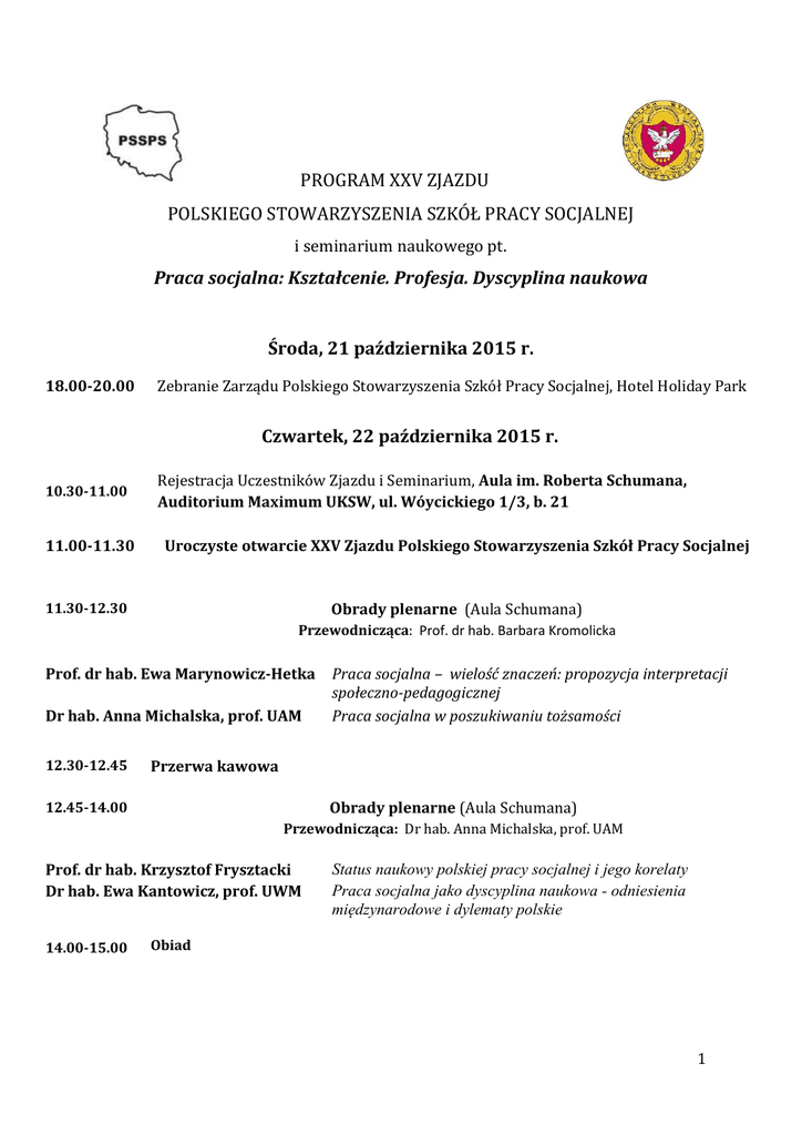PROGRAM XXV ZJAZDU POLSKIEGO STOWARZYSZENIA SZKÓŁ PRACY SOCJALNEJ i seminarium naukowego pt. Praca socjalna: Kształcenie. Profesja. Dyscyplina naukowa Środa, 21 października 2015 r. 18.00-20.00 Zebranie Zarządu Polskiego Stowarzyszenia Szkół Pracy Socjalnej, Hotel Holiday Park Czwartek, 22 października 2015 r. 10.30-11.00 11.00-11.30 Rejestracja Uczestników Zjazdu i Seminarium, Aula im. Roberta Schumana, Auditorium Maximum UKSW, ul. Wóycickiego 1/3, b. 21 Uroczyste otwarcie XXV Zjazdu Polskiego Stowarzyszenia Szkół Pracy Socjalnej Obrady plenarne (Aula Schumana) 11.30-12.30 Przewodnicząca: Prof. dr hab. Barbara Kromolicka Prof. dr hab. Ewa Marynowicz-Hetka Dr hab. Anna Michalska, prof. UAM 12.30-12.45 Praca socjalna – wielość znaczeń: propozycja interpretacji społeczno-pedagogicznej Praca socjalna w poszukiwaniu tożsamości Przerwa kawowa Obrady plenarne (Aula Schumana) 12.45-14.00 Przewodnicząca: Dr hab. Anna Michalska, prof. UAM Prof. dr hab. Krzysztof Frysztacki Dr hab. Ewa Kantowicz, prof. UWM 14.00-15.00 Status naukowy polskiej pracy socjalnej i jego korelaty Praca socjalna jako dyscyplina naukowa - odniesienia międzynarodowe i dylematy polskie Obiad 1 15.00-16.30 SEKCJA I: Praca socjalna: jej tożsamość i ciągłość idei (Aula Schumana A) Moderatorzy sekcji: Dr hab. Ewa Kantowicz, prof. UWM, Dr hab. Tadeusz Kamiński Prof. dr hab. Barbara Kromolicka Dr hab. Krzysztof Czekaj, prof. UP Dr hab. Dobroniega Trawkowska Dr Urszula Kazubowska Praca socjalna w ujęciu pracowników rzeczywistość, nowe obszary i wyzwania Praca socjalna wobec współczesnych wyzwań Dr Jolanta Łodzińska 15.00-16.30 Zagrożenia zawodowe pracowników socjalnych jako nowy obszar poznania Praca socjalna: od budowy zawodu do deprofesjonalizacji: refleksje nauczyciela i praktyka z perspektywy 25 lat Przemiany pracy socjalnej. Próba interpretacji socjalnych – SEKCJA II: Kształcenie pracowników socjalnych (Aula Schumana B) Moderatorzy sekcji: Dr hab. Anna Michalska, prof. UAM, Dr Elżbieta Bojanowska Głos w dyskusji na temat kształcenia pracowników socjalnych w ramach II stopnia pracy socjalnej Edukacja pracowników socjalnych w Republice Czeskiej i Słowackiej Prof. dr hab. Krzysztof Piątek Dr hab. Beata Szluz, prof. UR Dr hab. Tomasz Biernat, prof. UMK Wartość edukacyjna metody projektu w kształceniu studentów pracy socjalnej. Doświadczenia i refleksje Dr Piotr Frączek Efektywność sektora pomocy społecznej – wyzwanie dla procesu kształcenia pracowników socjalnych Dr Anna Rutkowska Oczekiwania rynku pracy wobec absolwentów pracy socjalnej Mgr Magdalena Dymowska, Dr Małgorzata Ciczkowska-Giedziun Projekt socjalny w kształceniu do pracy socjalnej – refleksje nad działaniem 15.00-16.30 SEKCJA III: Profesjonalizacja zawodu pracownika socjalnego (A 327) Moderatorzy sekcji: Dr hab. Małgorzata Orłowska, prof. WSB, Dr Urszula Bejma Prof. dr hab. Kazimiera Wódz, Dr hab. Krystyna Faliszek Standaryzacja pracy socjalnej w procesie profesjonalizacji zawodu pracownika socjalnego Dr Monika Zawartka-Czekaj Praca socjalna i skuteczność jej działania Dr hab. Marta Czechowska-Bieluga Przygotowanie zawodowe asystentów rodzin Dr Anna Jarkiewicz Profesjonalizacja pracy socjalnej w kontekście pracy z osobami zaburzonymi psychicznie Bariery profesjonalizacji zawodu pracownika socjalnego w gminnych ośrodkach pomocy społecznej Dr Teresa Zbyrad 2 15.00-16.30 SEKCJA IV: Praktyczny dorobek pracy socjalnej (A 308) Moderatorzy sekcji: Dr hab. Arkadiusz Żukiewicz, prof. UŁ, Dr hab. Joanna Truszkowska Kliniczna praca socjalna jako narzędzie wspierania rodzin w kryzysie Dr hab. Iwona Dąbrowska-Jabłońska Rodzina adopcyjna nowym obszarem działań w pracy socjalnej ks. Dr hab. Piotr Krakowiak Dr Ewa Leśniak-Berek Co z tą superwizją? Konteksty realizacji superwizji w wybranych instytucjach pomocy społecznej Projekty socjalne jako dorobek praktyczny pracy socjalnej pomiędzy kreatywnością a rzeczywistymi potrzebami społecznymi Profesjonalne wsparcie nieformalnych opiekunów osób chorych onkologicznie jako przestrzeń dla pracy socjalnej Wybrane przykłady aktywności mentalnej w przestrzeni pracy socjalnej – kilka uwag na przykładzie asystentów rodziny Dr Ewelina Zdebska Dr Sabina Pawlas-Czyż Mgr Izabela Kamińska 17.00 Walne Zebranie Członków PSSPS. Wybory władz na kadencję 2015-2019 (Aula Schumana) 20.30 Uroczysta kolacja, Hotel Holiday Park Piątek, 23 października 2015 r. 9.00-10.30 SEKCJA I: Praca socjalna: jej tożsamość i ciągłość idei (Aula Schumana A) Moderatorzy sekcji: Dr hab. Tadeusz Kamiński, Dr Anna Rutkowska Dr hab. Iwona Taranowicz Krytyczne ujęcia pracy socjalnej – dylematy w pracy dydaktycznej i naukowej Modelowanie kompetencji zawodowych pracowników socjalnych w procesie kształtowania się tożsamości polskiej pracy socjalnej. Propozycja narzędzia badawczego Praca socjalna a wyzwania współczesności Dr hab. Andrzej Niesporek Pole pomocy społecznej a dyskurs pracy socjalnej w Polsce Dr Katarzyna Wasilewska-Ostrowska O metodach „outreach”, czyli w poszukiwaniu nowych obszarów pracy socjalnej Rozwój zawodów związanych ze sferą usług socjalnych w systemie pieczy zastępczej – założenia a rzeczywistość Dr hab. Mariusz Granosik Dr hab. Anna Weissbrot-Koziarska, prof. UO Dr Magdalena Zmysłowska 3 SEKCJA II: Kształcenie pracowników socjalnych (Aula Schumana B) 9.00-10.30 Moderatorzy sekcji: Prof. dr hab. Barbara Kromolicka, Dr Jolanta Łodzińska Dr hab. Małgorzata Orłowska, prof. WSB Dr Anna Olech Standardy edukacyjne krajowych ram kwalifikacji a ethos pracy socjalnej Praca socjalna. Kształcenie do zawodu Dr Józefa Matejek Pracownik socjalny w obliczu wyzwań współczesności kształcenie i działanie Dr Magdalena Joachimowska Humanistyka w kształceniu pracowników socjalnych – wybrane (kluczowe) zagadnienia Mgr Wojciech Glac Kształcenie pracowników socjalnych w zakresie prawa i praktyki prawnej – wspó