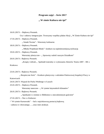 Program zajęć – ferie 2017 „ W zimie Kultura nie śpi” 16.01.2017r. - Bajkowy Poranek. Gry i zabawy integracyjne. Tworzymy wspólny plakat Akcji „ W Zimie Kultura nie śpi” 17.01.2017r. - Bajkowy Poranek. „ Smaki Świata” - Warsztaty kulinarne. 18.01.2017r. - Bajkowy Poranek. „ Młody Projektant Mody”- konkurs na najśmieszniejszą stylizację 19.01.2017r. - Bajkowy Poranek. Warsztaty plastyczne - „ Sprawmy radość naszym Dziadkom” 20.01.2017r.- Bajkowy Poranek. „Książę i żebrak „ Spektakl teatralny w wykonaniu Aktorów Teatru ART – RE z Krakowa 23.01.2017r.- Bajkowy Poranek. „ Bezpieczne ferie” - Konkurs plastyczny z udziałem Państwowej Inspekcji Pracy w Katowicach 24.01.2017r. Wyjazd do Parku Wodnego w Łazach 25.01.2017r. - Bajkowy Poranek. Warsztaty taneczne - „ W rytmie latynoskich klimatów” 26.01.2017r.- Bajkowy Poranek. „ Spotkanie w ciemno w Bibliotece z niecodziennym gościem” 27.01.2017r. - Noc w Kulturze: -” W rytmie Karnawału” – bal z najciekawszą postacią bajkową - zabawa w chowanego…...oraz inne atrakcje.