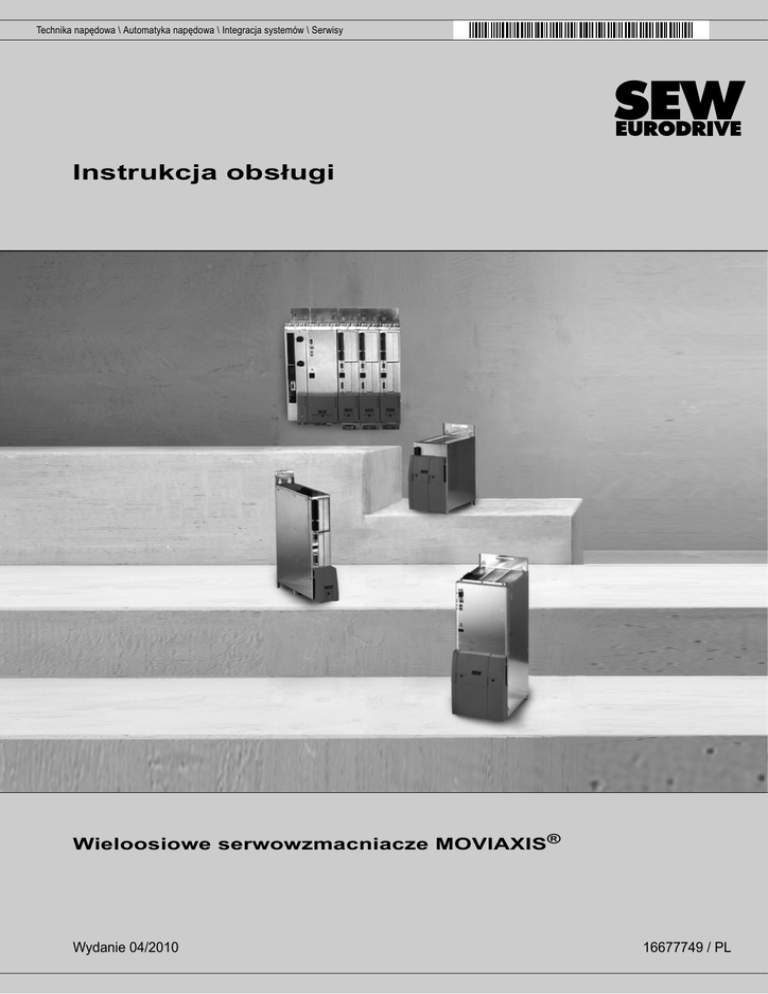 Technika napędowa \ Automatyka napędowa \ Integracja systemów \ Serwisy Instrukcja obsługi Wieloosiowe serwowzmacniacze MOVIAXIS® Wydanie 04/2010 16677749 / PL SEW-EURODRIVE—Driving the world Spis tresci 1 Wskazówki ogólne ................................................................................................. 6 1.1 Struktura wskazówek bezpieczeństwa........................................................... 6 1.2 Roszczenia z tytułu odpowiedzialności za wady............................................ 6 1.3 Wykluczenie odpowiedzialności..................................................................... 7 1.4 Moduł zasilania z funkcją zasilania i zwrotu energii MXR .............................. 7 1.5 Prawa autorskie ............................................................................................. 7 2 Wskazówki bezpieczeństwa .................................................................................. 8 2.1 Informacje ogólne .......................................................................................... 8 2.2 Grupa docelowa ............................................................................................. 8 2.3 Użytkowanie zgodne z przeznaczeniem ........................................................ 8 2.4 Transport, magazynowanie............................................................................ 9 2.5 Ustawienie ..................................................................................................... 9 2.6 Podłączenie elektryczne .............................................................................. 10 2.7 Bezpieczne rozdzielenie .............................................................................. 10 2.8 Praca............................................................................................................ 10 2.9 Temperatura urządzenia .............................................................................. 11 3 Budowa urządzenia.............................................................................................. 12 3.1 Zespół osi z magistralą Systembus opartą na CAN..................................... 12 3.2 Zespół osi z magistralą Systembus kompatybilną z EtherCAT® .................. 13 3.3 Ważne wskazówki........................................................................................ 14 3.4 Tabliczki znamionowe i oznaczenia typu ..................................................... 15 3.5 Akcesoria seryjne......................................................................................... 19 3.6 Opcjonalne akcesoria .................................................................................. 22 3.7 Akcesoria dwuliniowej struktury zespołu osi ................................................ 23 3.8 Przegląd zespołu osi .................................................................................... 24 3.9 Budowa modułu zasilania MOVIAXIS® MXP ............................................... 25 3.10 Budowa modułu zasilania z funkcją zasilania i zwrotu energii MOVIAXIS® MXR......................................................................................... 29 3.11 Budowa modułów osi MOVIAXIS® MXA...................................................... 30 3.12 Magistrala Systembus w wersji kompatybilnej z EtherCAT® lub opartej na CAN....................................................................................... 36 3.13 Budowa dodatkowego podzespołu modułu Master MOVIAXIS® MXM........ 37 3.14 Budowa dodatkowego podzespołu modułu kondensatora MOVIAXIS® MXC......................................................................................... 39 3.15 Budowa dodatkowego podzespołu modułu buforowego MOVIAXIS® MXB......................................................................................... 40 3.16 Budowa dodatkowego podzespołu modułu rozdzielczego zasilacza sieciowego 24 V MOVIAXIS® MXS.............................................................. 41 3.17 Budowa dodatkowego podzespołu modułu rozładowania obwodu pośredniego MOVIAXIS® MXZ .................................................................... 42 3.18 Moduły możliwe do połączenia w przypadku dwuliniowej struktury zespołu osi ................................................................................................... 43 3.19 Kombinacje opcji przy dostawie ................................................................... 44 3.20 Opcjonalna karta multienkodera XGH11A, XGS11A ................................... 47 3.21 Opcjonalne złącze fieldbus PROFIBUS XFP11A......................................... 56 3.22 Opcjonalne złącze fieldbus K-Net XFA11A.................................................. 58 Instrukcja obsługi – wieloosiowe serwowzmacniacze MOVIAXIS® 3 Spis tresci 3.23 Opcjonalne złącze fieldbus XFE24A EtherCAT® ......................................... 59 3.24 Opcja XSE24A – kompatybilna z EtherCAT® magistrala Systembus SBusplus ....................................................................................................... 60 3.25 Opcjonalna karta wejścia/wyjścia typ XIO11A ............................................ 61 3.26 Opcjonalna karta wejścia/wyjścia typ XIA11A.............................................. 63 4 Instalacja ............................................................................................................... 67 4.1 Instalacja mechaniczna................................................................................ 67 4.2 Kabel Systembus magistrali SBus opartej na CAN z opcjonalnym modułem Master .......................................................................................... 70 4.3 Kabel łączący magistrali Systembus przy kilku zespołach osi opartych na CAN ........................................................................................................ 71 4.4 Kabel połączeniowy Systembus do innych urządze