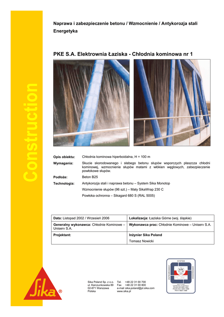 Naprawa i zabezpieczenie betonu / Wzmocnienie / Antykorozja stali Energetyka Construction PKE S.A. Elektrownia Łaziska - Chłodnia kominowa nr 1 Opis obiektu: Chłodnia kominowa hiperboidalna, H = 100 m Wymagania: Skucie skorodowanego i słabego betonu słupów wsporczych płaszcza chłodni kominowej, wzmocnienie słupów matami z włókien węglowych, zabezpieczenie powłokowe słupów. Podłoże: Beton B25 Technologia: Antykorozja stali i naprawa betonu – System Sika Monotop Wzmocnienie słupów (96 szt.) – Maty SikaWrap 230 C Powłoka ochronna – Sikagard 680 S (RAL 5005) Data: Listopad 2002 / Wrzesień 2006 Lokalizacja: Łaziska Górne (woj. śląskie) Generalny wykonawca: Chłodnie Kominowe – Uniserv S.A. Wykonawca prac: Chłodnie Kominowe – Uniserv S.A. Projektant: Inżynier Sika Poland Tomasz Nowicki Sika Poland Sp. z o.o. ul. Karczunkowska 89 02-871 Warszawa Polska Tel. +48 22 31 00 700 Fax +48 22 31 00 800 e-mail [email protected] www.sika.pl