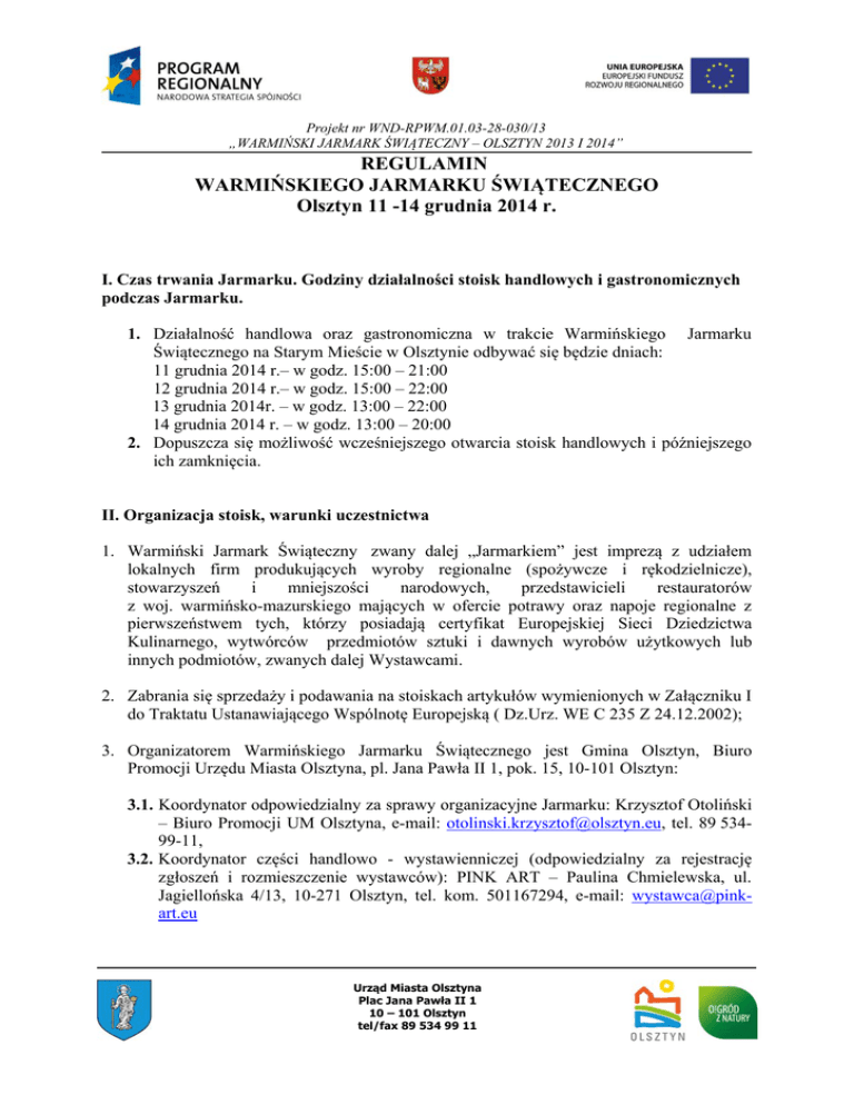Projekt nr WND-RPWM.01.03-28-030/13 „WARMIŃSKI JARMARK ŚWIĄTECZNY – OLSZTYN 2013 I 2014” REGULAMIN WARMIŃSKIEGO JARMARKU ŚWIĄTECZNEGO Olsztyn 11 -14 grudnia 2014 r. I. Czas trwania Jarmarku. Godziny działalności stoisk handlowych i gastronomicznych podczas Jarmarku. 1. Działalność handlowa oraz gastronomiczna w trakcie Warmińskiego Jarmarku Świątecznego na Starym Mieście w Olsztynie odbywać się będzie dniach: 11 grudnia 2014 r.– w godz. 15:00 – 21:00 12 grudnia 2014 r.– w godz. 15:00 – 22:00 13 grudnia 2014r. – w godz. 13:00 – 22:00 14 grudnia 2014 r. – w godz. 13:00 – 20:00 2. Dopuszcza się możliwość wcześniejszego otwarcia stoisk handlowych i późniejszego ich zamknięcia. II. Organizacja stoisk, warunki uczestnictwa 1. Warmiński Jarmark Świąteczny zwany dalej „Jarmarkiem” jest imprezą z udziałem lokalnych firm produkujących wyroby regionalne (spożywcze i rękodzielnicze), stowarzyszeń i mniejszości narodowych, przedstawicieli restauratorów z woj. warmińsko-mazurskiego mających w ofercie potrawy oraz napoje regionalne z pierwszeństwem tych, którzy posiadają certyfikat Europejskiej Sieci Dziedzictwa Kulinarnego, wytwórców przedmiotów sztuki i dawnych wyrobów użytkowych lub innych podmiotów, zwanych dalej Wystawcami. 2. Zabrania się sprzedaży i podawania na stoiskach artykułów wymienionych w Załączniku I do Traktatu Ustanawiającego Wspólnotę Europejską ( Dz.Urz. WE C 235 Z 24.12.2002); 3. Organizatorem Warmińskiego Jarmarku Świątecznego jest Gmina Olsztyn, Biuro Promocji Urzędu Miasta Olsztyna, pl. Jana Pawła II 1, pok. 15, 10-101 Olsztyn: 3.1. Koordynator odpowiedzialny za sprawy organizacyjne Jarmarku: Krzysztof Otoliński – Biuro Promocji UM Olsztyna, e-mail: [email protected], tel. 89 53499-11, 3.2. Koordynator części handlowo - wystawienniczej (odpowiedzialny za rejestrację zgłoszeń i rozmieszczenie wystawców): PINK ART – Paulina Chmielewska, ul. Jagiellońska 4/13, 10-271 Olsztyn, tel. kom. 501167294, e-mail: [email protected] Urząd Miasta Olsztyna Plac Jana Pawła II 1 10 – 101 Olsztyn tel/fax 89 534 99 11 Projekt nr WND-RPWM.01.03-28-030/13 „WARMIŃSKI JARMARK ŚWIĄTECZNY – OLSZTYN 2013 I 2014” 4. Warunkiem uzyskania statusu Wystawcy podczas Warmińskiego Jarmarku Świątecznego jest dostarczenie (nadesłanie) wypełnionej karty zgłoszenia do Koordynatora części handlowo - wystawienniczej oraz zapoznanie się oraz podpisanie karty zgłoszenia i regulaminu. 5. Samo nadesłanie karty zgłoszenia nie jest równoznaczne z przyjęciem osoby zgłaszającej do uczestnictwa w Jarmarku. 6. Organizator Jarmarku zastrzega sobie prawo odmowy przyjęcia zgłoszenia uczestnictwa w Jarmarku bez podania przyczyny. 6.1. Zgłoszenia przesyłane pocztą lub dostarczane osobiście przyjmowane są do dnia 14 listopada 2014 r. (liczy się data stempla pocztowego). Do dnia 1 grudnia 2014 r. Koordynator części handlowo - wystawienniczej poinformuje osoby, które nadesłały zgłoszenia o przyjęciu bądź odrzuceniu zgłoszenia. Zgłoszenia przesyłane winny być na adres Koordynatora – PINK ART – Paulina Chmielewska, ul. Jagiellońska 4/13, 10-271 Olsztyn, tel. kom. 501167294, e-mail: [email protected] 7. Wystawca ma obowiązek prowadzić stoisko w godzinach wyznaczonych w Regulaminie bez możliwości zamknięcia stoiska przed ustaloną w Regulaminie godziną. Ewentualne zmiany dotyczące godzin prowadzenia stoiska winny być ustalone z Koordynatorem części handlowo - wystawienniczej i zmienione wyłącznie za jego zgodą. 8. Montaż stoiska oraz rejestracja uczestników Jarmarku odbywa się w dniu 11 grudnia 2014 r. najpóźniej do godz. 12:00, co oznacza gotowość od godz. 12:00. 9. Wystawca otrzymuje identyfikator (1 szt.), który jest też przepustką na wjazd i wyjazd samochodem na teren Starego Miasta (jedynie w wyznaczonych godzinach) w trakcie trwania Jarmarku. 10. Nie dopuszcza się parkowania pojazdów Wystawców przy stanowiskach handlowych w godzinach otwarcia Jarmarku. W przypadku parkowania pojazdów w tych godzinach, na właściciela pojazdu może zostać nałożony mandat karny. 11. Udostępnione przez Koordynatora części handlowo wystawienniczej stoisko przeznaczone jest wyłącznie dla Wystawcy, który jest za nie odpowiedzialny tzn. zobowiązany jest dbać o nie, chronić przed zniszczeniami. W przypadku gdy stoisko ulegnie zniszczeniu z wyjątkiem przyczyn spowodowanych przez działanie sił przyrody, odpowiedzialność materialną za szkody ponosi Wystawca. 12. Wystawcy zorganizują swoje stoiska w miejscu wyznaczonym przez Koordynatora części handlowo – wystawienniczej. . Urząd Miasta Olsztyna Plac Jana Pawła II 1 10 – 101 Olsztyn tel/fax 89 534 99 11 Projekt nr WND-RPWM.01.03-28-030/13 „WARMIŃSKI JARMARK ŚWIĄTECZNY – OLSZTYN 2013 I 2014” 13. Obowiązuje zakaz wystawiania i reklamy towaru poza wyznaczonym stoiskiem. 14. Lokalizację stoiska wskazuje Koordynator części handlowo - wystawienniczej, przy czym zastrzega sobie prawo jej zmiany z przyczyn organizacyjnych lub technicznych. 15. Koordynator części handlowo - wystawienniczej zastrzega sobie prawo czasowego wyłączenia z handlu stanowiska Wystawcy z przyczyn organizacyjnych lub technicznych. 16. Nie dopuszcza się ustawiania stoisk własnych Wystawców. 17. Pracownicy zatrudnieni w punktach żywnościowych oraz na stoiskach ze sprzedażą produktów żywnościowych muszą bezwzględnie posiadać ważną książeczkę badań dla celów sanitarno - epidemiologicznych. 18. Wystawcy są zobowiązani do posiadania wszelkich niezbędnych pozwoleń i uzgodnień na prowadzoną działalność gospodarczą na terenie Jarmarku. Prowadzący działalność gastronomiczną oraz handlujący żywnością podczas Jarmarku zobowiązani są ponadto do poinformowania Państwowej Powiatowej Inspekcji Sanitarnej w Olsztynie o rodzaju prowadzonej działalności i do uzyskania jej pozytywnej opinii. 19. Wystaw