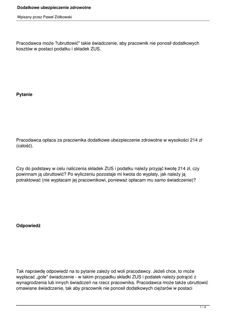 Dodatkowe ubezpieczenie zdrowotne Wpisany przez Paweł Ziółkowski Pracodawca może ?ubruttowić" takie świadczenie, aby pracownik nie ponosił dodatkowych kosztów w postaci podatku i składek ZUS. Pytanie Pracodawca opłaca za pracownika dodatkowe ubezpieczenie zdrowotne w wysokości 214 zł (całość). Czy do podstawy w celu naliczenia składek ZUS i podatku należy przyjąć kwotę 214 zł, czy powinnam ją ubruttowić? Po wyliczeniu pozostaje mi kwota do wypłaty, jak należy ją potraktować (nie wypłacam jej pracownikowi, ponieważ opłacam mu samo świadczenie)? Odpowiedź Tak naprawdę odpowiedź na to pytanie zależy od woli pracodawcy. Jeżeli chce, to może wypłacać „gołe" świadczenie - w takim przypadku składki ZUS i podatek należy potrącić z wynagrodzenia lub innych świadczeń na rzecz pracownika. Pracodawca może także ubruttowić omawiane świadczenie, tak aby pracownik nie ponosił dodatkowych ciężarów w postaci 1/4 Dodatkowe ubezpieczenie zdrowotne Wpisany przez Paweł Ziółkowski podatku i składek ZUS. Uzasadnienie Zgodnie z art. 12 ust. 1 ustawy z dnia 26 lipca 1991 r. o podatku dochodowym od osób fizycznych (tekst jedn.: Dz. U. z 2000 r. Nr 14, poz. 176 z późn. zm.) za przychody ze stosunku służbowego, stosunku pracy, pracy nakładczej oraz spółdzielczego stosunku pracy uważa się wszelkiego rodzaju wypłaty pieniężne oraz wartość pieniężną świadczeń w naturze bądź ich ekwiwalenty, bez względu na źródło finansowania tych wypłat i świadczeń, a w szczególności: wynagrodzenia zasadnicze, wynagrodzenia za godziny nadliczbowe, różnego rodzaju dodatki, nagrody, ekwiwalenty za nie wykorzystany urlop i wszelkie inne kwoty niezależnie od tego, czy ich wysokość została z góry ustalona, a ponadto świadczenia pieniężne ponoszone za pracownika, jak również wartość innych nieodpłatnych świadczeń lub świadczeń częściowo odpłatnych. Powoduje to, że świadczenie w postaci dodatkowego ubezpieczenia zdrowotnego stanowi przychód ze stosunku pracy. Jeżeli pracodawca poprzestanie na przyznaniu tego świadczenia należy doliczyć wartość świadczenia do innych przychodów ze stosunku pracy oraz naliczyć podatek i składki ZUS. W praktyce oznacza to, że daniny te będzie należało pobrać z innych przychodów pracownika. Jeżeli pracodawca postanowi, iż pracownik nie będzie ponosił dodatkowych ciężarów z tego tytułu, może przyznać świadczenie mieszane, częściowo pieniężne. W ten sposób pracownik uzyska dodatkowe ubezpieczenie zdrowotne oraz pokrycie podatku i składek ZUS. 2/4 Dodatkowe ubezpieczenie zdrowotne Wpisany przez Paweł Ziółkowski W sytuacji określonej w pytaniu pracodawca opłaca dodatkowe ubezpieczenie zdrowotne w kwocie 214 zł. W pytaniu nie zostało sprecyzowane, czy pracodawca robi to ze swoich środków, czy też kwotę tę potrąca ze środków pracownika. Rozpatrzmy więc trzy przypadki. Jeżeli pracodawca opłaca składki ze środków własnych, pracownik ma przychód w kwocie 214 zł - powoduje to, że pracownik ma przychód w tejże kwocie. Przychód ten należy zsumować z innymi przychodami z danego miesiąca, naliczyć podatek i składki i potrącić je z należności przysługujących pracownikowi - w praktyce będzie to oznaczać potrącenie z innych świadczeń. Jeżeli pracodawca opłaca składki ze środków własnych, ale ubruttawia je - pracownik ma przychód w kwocie 214 zł powiększonej o należny podatek i składki ZUS naliczone od tej kwoty. Przychód ten należy zsumować z innymi przychodami, naliczyć podatek i składki ZUS pracownik w ten sposób nie musi dopłacać do omawianego świadczenia. Jeżeli pracodawca opłaca składki w imieniu pracownika - potrąca je z jego wynagrodzenia na podstawie upoważnienia. W takim przypadku od kwoty składek na dodatkowe ubezpieczenie zdrowotne nie opłaca się podatku dochodowego i składek ZUS. Warto przy tym zauważyć, iż skoro pracodawca opłaca składki za pracownika, to oznacza to, że pracownik nie otrzymuje świadczenia pieniężnego, tylko inne nieodpłatne świadczenie. 3/4 Dodatkowe ubezpieczenie zdrowotne Wpisany przez Paweł Ziółkowski Powoduje to, że wśród przychodów pracownika należy wykazać jedynie wartość składek, bez konieczności przekazywania ich kwoty pracownikowi. 4/4