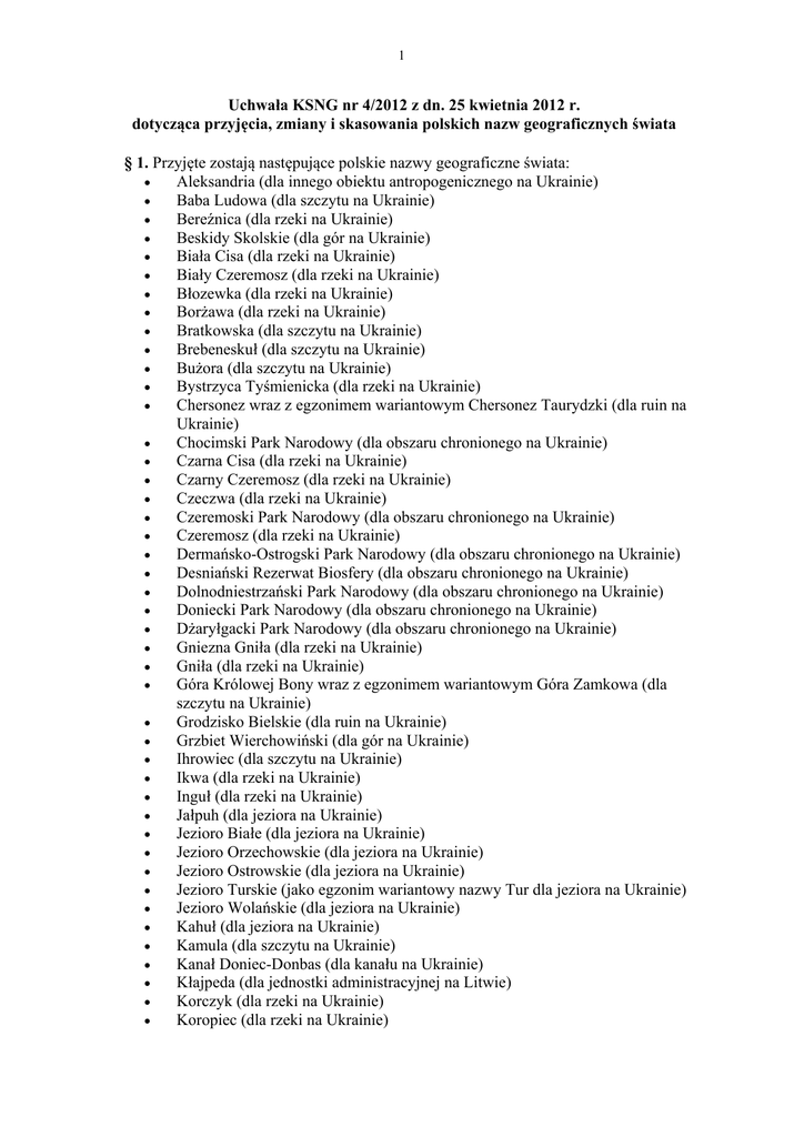 1 Uchwała KSNG nr 4/2012 z dn. 25 kwietnia 2012 r. dotycząca przyjęcia, zmiany i skasowania polskich nazw geograficznych świata § 1. Przyjęte zostają następujące polskie nazwy geograficzne świata: Aleksandria (dla innego obiektu antropogenicznego na Ukrainie) Baba Ludowa (dla szczytu na Ukrainie) Bereźnica (dla rzeki na Ukrainie) Beskidy Skolskie (dla gór na Ukrainie) Biała Cisa (dla rzeki na Ukrainie) Biały Czeremosz (dla rzeki na Ukrainie) Błozewka (dla rzeki na Ukrainie) Borżawa (dla rzeki na Ukrainie) Bratkowska (dla szczytu na Ukrainie) Brebeneskuł (dla szczytu na Ukrainie) Bużora (dla szczytu na Ukrainie) Bystrzyca Tyśmienicka (dla rzeki na Ukrainie) Chersonez wraz z egzonimem wariantowym Chersonez Taurydzki (dla ruin na Ukrainie) Chocimski Park Narodowy (dla obszaru chronionego na Ukrainie) Czarna Cisa (dla rzeki na Ukrainie) Czarny Czeremosz (dla rzeki na Ukrainie) Czeczwa (dla rzeki na Ukrainie) Czeremoski Park Narodowy (dla obszaru chronionego na Ukrainie) Czeremosz (dla rzeki na Ukrainie) Dermańsko-Ostrogski Park Narodowy (dla obszaru chronionego na Ukrainie) Desniański Rezerwat Biosfery (dla obszaru chronionego na Ukrainie) Dolnodniestrzański Park Narodowy (dla obszaru chronionego na Ukrainie) Doniecki Park Narodowy (dla obszaru chronionego na Ukrainie) Dżaryłgacki Park Narodowy (dla obszaru chronionego na Ukrainie) Gniezna Gniła (dla rzeki na Ukrainie) Gniła (dla rzeki na Ukrainie) Góra Królowej Bony wraz z egzonimem wariantowym Góra Zamkowa (dla szczytu na Ukrainie) Grodzisko Bielskie (dla ruin na Ukrainie) Grzbiet Wierchowiński (dla gór na Ukrainie) Ihrowiec (dla szczytu na Ukrainie) Ikwa (dla rzeki na Ukrainie) Inguł (dla rzeki na Ukrainie) Jałpuh (dla jeziora na Ukrainie) Jezioro Białe (dla jeziora na Ukrainie) Jezioro Orzechowskie (dla jeziora na Ukrainie) Jezioro Ostrowskie (dla jeziora na Ukrainie) Jezioro Turskie (jako egzonim wariantowy nazwy Tur dla jeziora na Ukrainie) Jezioro Wolańskie (dla jeziora na Ukrainie) Kahuł (dla jeziora na Ukrainie) Kamula (dla szczytu na Ukrainie) Kanał Doniec-Donbas (dla kanału na Ukrainie) Kłajpeda (dla jednostki administracyjnej na Litwie) Korczyk (dla rzeki na Ukrainie) Koropiec (dla rzeki na Ukrainie) 2 Kowno (dla jednostki administracyjnej na Litwie) Lipa (dla rzeki na Ukrainie) Lubiaż (dla jeziora na Ukrainie) Lucemierz (dla jeziora na Ukrainie) Łukie (dla jeziora na Ukrainie) Łukiew (dla rzeki na Ukrainie) Makowica (dla szczytu na Ukrainie) Mielnica (dla rzeki na Ukrainie) Mizuńka (dla rzeki na Ukrainie) Nadazowski Park Narodowy (dla obszaru chronionego na Ukrainie) Niczława (dla rzeki na Ukrainie) Nizina Północnokrymska (dla niziny na Ukrainie) Olbia (dla ruin na Ukrainie) Olita (dla jednostki administracyjnej na Litwie) Oskoł (dla rzeki na Ukrainie i w Rosji) Pantikapajon (dla ruin na Ukrainie) Paraszka (dla szczytu na Ukrainie) Park Narodowy „Góry Krzemienieckie” (dla obszaru chronionego na Ukrainie) Park Narodowy „Kanion Dniestru” (dla obszaru chronionego na Ukrainie) Park Narodowy „Północne Podole” (dla obszaru chronionego na Ukrainie) Park Narodowy „Prypeć-Stochód” (dla obszaru chronionego na Ukrainie) Park Narodowy „Puszcza Cumańska” (dla obszaru chronionego na Ukrainie) Park Narodowy „Zaczarowany Kraj” (dla obszaru chronionego na Ukrainie) Pasmo Mizockie (dla wyżyny na Ukrainie) Pasmo Pełczańskie (dla wyżyny na Ukrainie) Pikuj (dla szczytu na Ukrainie) Pistynka (dla rzeki na Ukrainie) Połąga (dla jednostki administracyjnej na Litwie) Połonina Czerwona (jako egzonim wariantowy nazwy Połonina Krasna dla gór na Ukrainie) Połonina Równa (dla gór na Ukrainie) Poniewież (dla jednostki administracyjnej na Litwie) Przełęcz Legionów (dla przełęczy na Ukrainie) Przełęcz Tucholska (jako nazwa główna przełęczy na Ukrainie; nazwą wariantowa pozostaje Przełęcz Werecka) rejon neryński (dla jednostki administracyjnej na Litwie) rejon wisagiński (dla jednostki administracyjnej na Litwie) Roman-Kosz (dla szczytu na Ukrainie) Roś (dla rzeki na Ukrainie) Rybnica (dla rzeki na Ukrainie) Siniucha (dla rzeki na Ukrainie) Słucz (dla rzeki na Ukrainie) Smotrycz (dla rzeki na Ukrainie) Stawy (dla rzeki na Ukrainie) Stryj (dla rzeki na Ukrainie) Stubła (dla rzeki na Ukrainie) Sukiel (dla rzeki na Ukrainie) Synewyr (dla jeziora na Ukrainie) Sywasz (dla zatoki na Ukrainie) Szacki Rezerwat Biosfery (dla obszaru chronionego na Ukrainie) 3 Szawle (dla jednostki administracyjnej na Litwie) Święta Katarzyna (dla miejscowości w Egipcie) Świrz (dla rzeki na Ukrainie) Tarchankut (dla przylądka na Ukrainie) Targowica (dla miejscowości na Ukrainie – 50°33′20″N, 25°23′35″E, obwód rówieński) Turkuł (dla szczytu na Ukrainie) Tuzła (dla wyspy na Ukrainie) Tyras (dla ruin na Ukrainie) Ukraina Zakarpacka (jako egzonim wariantowy nazwy Zakarpacie dla regionu na Ukrainie) Ulicko-Seredkiewicz (dla miejscowości na Ukrainie – 50°09′20″N, 23°33′10″E, obwód lwowski) Uście (dla rzeki na Ukrainie) Uż (dla rzeki na Ukrainie) Wereszyca (dla rzeki na Ukrainie) Wierchowiński Park Narodowy (dla obszaru chronionego na Ukrainie) Wilno (dla jednostki administracyjnej na Litwie) Worona (dla rzeki na Ukrainie) Worskla (dla rzeki na Ukrainie i w Rosji) Zatoka Jahorłycka (dla zatoki na Ukrainie) Zatoka Perekopska (dla zatoki na Ukrainie) Zbiornik Bursztyński (dla jeziora na Ukrainie) Zbiornik Chrynicki (dla jeziora na Ukrainie) Zbrucz (dla rzeki na Ukrainie) Trechtymirów (dla innego zabytku na Ukrainie) § 2. Zmienione zostają następujące polskie nazwy geograficzne świata: Czufut-Kale (nazwa ruin osiedla, a nie fortu, twierdzy, zamku na Ukrainie) Delta Dunaju (nazwa delty, a nie krainy, regionu na Ukrainie i w Rumunii) Desniańsko-Starohucki Park Narodowy (zamiast Desnańsko-Starohucki Park Narodowy dla obszaru chronionego na Ukrainie) Park Narodowy „Beskidy Skolskie” (zamiast Park Narodowy „Bieszczady Wschodnie” dla obszar