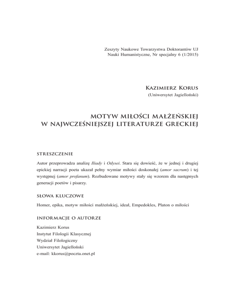 Zeszyty Naukowe Towarzystwa Doktorantów UJ Nauki Humanistyczne, Nr specjalny 6 (1/2015) Kazimierz Korus (Uniwersytet Jagielloński) MOTYW MIŁOŚCI MAŁŻEŃSKIEJ W NAJWCZEŚNIEJSZEJ LITER ATURZE GRECKIEJ STRESZCZENIE Autor przeprowadza analizę Iliady i Odysei. Stara się dowieść, że w jednej i drugiej epickiej narracji poeta ukazał pełny wymiar miłości doskonałej (amor sacrum) i tej występnej (amor profanum). Rozbudowane motywy stały się wzorem dla następnych generacji poetów i pisarzy. SŁOWA KLUCZOWE Homer, epika, motyw miłości małżeńskiej, ideał, Empedokles, Platon o miłości INFOR M ACJE O AUTORZE Kazimierz Korus Instytut Filologii Klasycznej Wydział Filologiczny Uniwersytet Jagielloński e-mail: [email protected] 10 K a z i m i e r z K or us Ile razy pragniemy mówić lub pisać o miłości między kobietą i mężczyzną, tyle razy każda myśl i każde słowo wydają się nam banalne, setki razy powtarzane. Rodzi się więc logiczne pytanie: dlaczego o miłości wciąż mówimy, dlaczego literatura każdego narodu wciąż temat podejmuje, skoro wszystko już zostało powiedziane? Grecy szukali odpowiedzi w naturze człowieka (w fýsis). Uważali, że wszyscy jesteśmy zrodzeni w miłości i dla miłości. Empedokles zobaczył miłość i nienawiść w naturze rzeczy jako siły kosmiczne, uosabiał też je jako bóstwa, ale nie widział ich w uczuciu. Platon ujrzy miłość w świecie idei, w której nasze dusze zostały zanurzone przed zejściem w świat ciała i materii. Fizyczne piękno każe nam według Platona (Fajdros) przypominać sobie (anámnesis) piękno idealnej miłości. Jej wyobrażenie z kolei budzi tęsknotę za doskonałym przeżyciem, za ideałem. To wewnętrzny, wręcz fizjologiczny (jak byśmy to dzisiaj, anachronicznie, powiedzieli), impuls zmusza nas do nieustannych poszukiwań. Literatura oddaje tylko rozmaite drogi tych poszukiwań. Tworzy nierozłączną wspólnotę bóstw Erosa, strzelającego strzałą miłości w serca i umysły ludzkie, oraz Afrodyty troszczącej się o fizyczne przeżycie spełnienia. Wszyscy pamiętamy opowiadanie Diotymy z Uczty Platona o narodzinach Erosa, którego matką była Bieda, a ojcem Dostatek, i dlatego skazany został na poszukiwanie piękna, odczuwanie jego nieustannego braku1. Ten brak w czarownej poezji autora Odysei nazywany jest tęsknotą, w modlitwach i obrazach Safony – cierpieniem, a bólem i rozpaczą w sytuacji niespełnienia czy porzucenia w jambicznej, pełnej temperamentu poezji Archilocha. 1 Por. K. Korus, Greckie źródła idealistycznego myślenia o miłości. Platon – Plu- tarch – święty Metody z Olimpu, „Iuvenilia Philologorum Cracoviensium”. Źródła humanistyki europejskiej, t. 1, Kraków 2008, s. 13–31. Mo t y w m i ł o ś c i m a ł ż e ńsk i e j . . . Skoro poszukiwanie piękna i doskonałości jest naturalnym dobrem, dlaczego więc miłość zrodzona z tej potrzeby może mieć różny wymiar? Odpowiedź przynoszą najstarsze i najpiękniejsze eposy. Iliada ukazuje zgubne skutki miłości rozumianej jako przemożna namiętność, łamiąca normy obyczajowe. Parys i Helena zostają w micie zniewoleni wolą Afrodyty. To ona, czuwająca, jak wiemy, nad cielesnością, przejmuje w miłości inicjatywę. Nie widzimy działania Erosa. Uleganie potężnej bogini staje się swoistym fatum, a ubezwłasnowolnieni ludzie mają świadomość wyrządzanego innym zła. Helena przeklina los, nazywa się „suką niosącą zło” (VI 344). Homer zdaje się przestrzegać słuchaczy słowami Hektora zwróconymi do matki: „Parysa odnajdę, aby go skłonić do walki. Och, oby go żywcem ziemia mogła pochłonąć. Na wielkie go wyhodował cierpienia Dzeus Olimpijski – dla Troi, Pryjama i jego dzieci…” (VI 280). Zła miłość rodzi wielkie społeczne zło. Homer nie mógłby być nazwany wychowawcą Grecji przez Platona (Państwo, 606 e), gdyby przekazał nam tylko jednostronny obraz nikczemnego związku zrodzonego po złamaniu prawa gościnności i nadużyciu zaufania gospodarza domu, Menelaosa. Są przecież małżeństwa normalne, oparte na szlachetnej miłości małżonków, żyjących we wzajemnym oddaniu i trosce. Hektor mocą Homerowej poezji staje się przeciwieństwem swego brata Parysa. Jego małżeństwo jest pełne miłości, a scena pożegnania z żoną Andromachą uchodzi za jedną z najpiękniejszych w Iliadzie (VI 369–494). W mowie żony, usiłującej go uchronić przed walką albo choćby na chwilę zatrzymać, staje się dla niej, po stracie całej rodziny, dosłownie wszystkim, „i ojcem, i matką czcigodną, bratem jedynym i mężem młodością kwitnącym” (w. 429). Blasku przydaje mu miłość do dziecka, Astianaksa, wziętego z rąk spłakanej żony. Wyraża ją wspaniałą modlitwą do „Dzeusa i innych bogów” (w. 476 i n.), pełną i dumy, i troski ojca. Homer nie zostawia wątpliwości, jaką 11 1 2 K a z i m i e r z K or us wartością rodzina żyje. Hektor pragnie zobaczyć się z „żoną kochaną” (álochon fílen). Poeta Astianaksa nazywa piękną gwiazdeczką (astéri kaló, w. 401). A kiedy ojciec bierze go w ramiona, całuje i tuli, wszechwiedzący narrator dodaje, że ten syn jest kochany, fílos (w. 474). W momencie, kiedy oddaje matce chłopca, jego uczucie do żony określa po raz wtóry podobnym terminem fíle –„kochana” (w. 482). Obrazu dopełnia radość Andromachy, która łzy przesłoniła uśmiechem, „przygarniając dziecko do piersi pachnącej” (w. 483). Zwróćmy uwagę na zastosowaną technikę literacką. Przyjęta zostaje zasada kontrastu, wyrazistego przeciwstawienia tego, co godne, temu, co niegodziwe. W greckiej i europejskiej literaturze, a także i w sztuce zasada przeciwstawiania dobrej i złej miłości małżeńskiej sprowadza się do zderzenia obrazów miłości w sferze sacrum z miłością w sferze profanum, by przypomnieć słynny obraz Tycjana zatytułowany później przez Vasariego: am